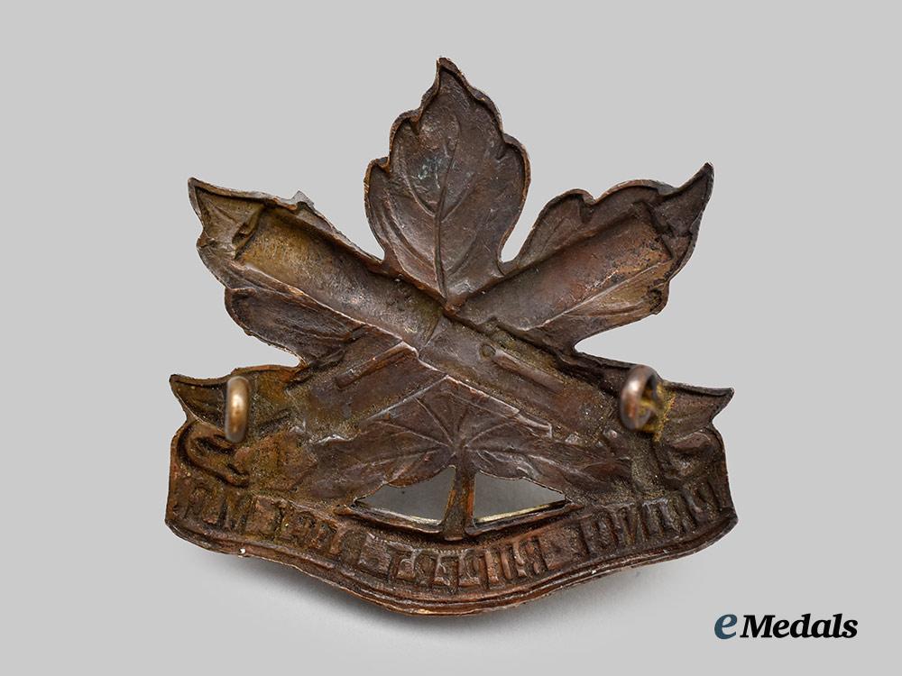 In bronze with silvered accents, the badge presents a stylised maple leaf with crossed guns superimposed on the badge, both lugs intact on the reverse, unmarked, measuring 41.8 mm (w) x 41.3 mm (l), with beautiful, dark and even patina with a very crisp overlay, in near mint condition.