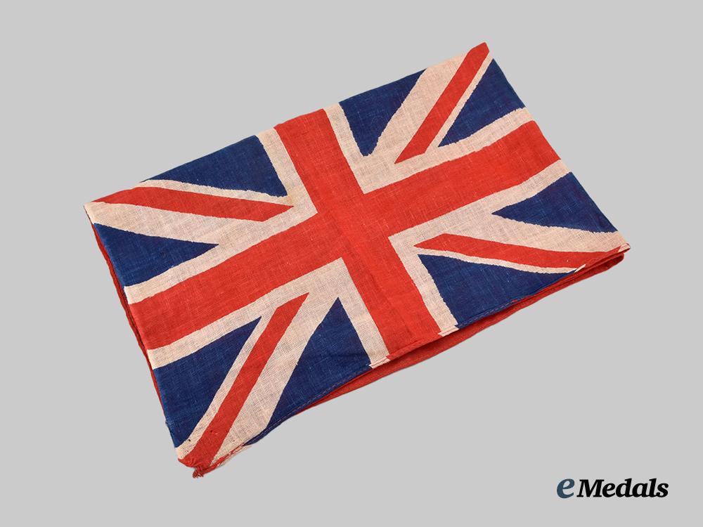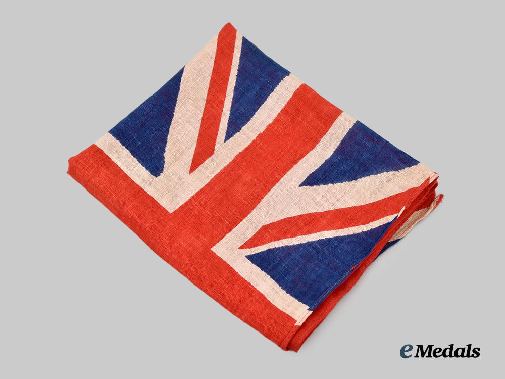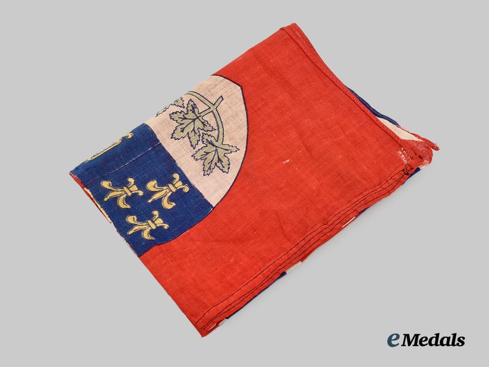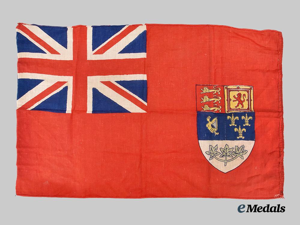In a thin white cotton and screen-printed in red, blue, yellow and green inks, the flag being a British red ensign, with the Royal Union Flag in the canton and adorned with the shield of the coat-of-arms of Canada at the right, single reinforced stitching along the top and bottom edges, the right edge with triple reinforced stitching, measuring 710 mm in width x 460 in height, fraying evident at the upper left of the canton, vertical blue streak passing through the left side of the coat-of-arms, exhibiting fold marks, is free of holes, fine.