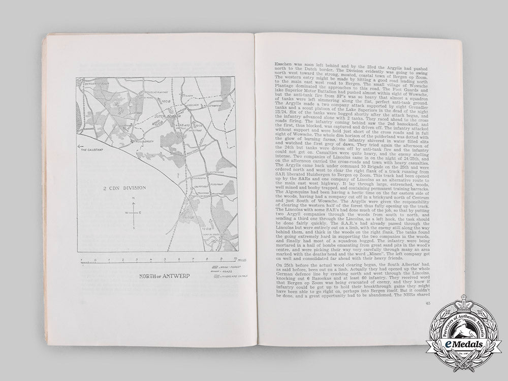 Entitled "A Short History of the Tenth Canadian Infantry Brigade", authored by Major R.A. Paterson, Argyll and Sutherland Highlanders of Canada, with a Forward on page 5 by Brigadier H.P. Bell-Irving DSO OBE dated 30 October 1945. Includes the history of the Tenth Canadian Infantry Brigade, incorporating the Lincoln and Welland Regiment, the Algonquin Regiment, the Argyll and Sutherland Highlanders of Canada, the South Alberta Regiment and the New Brunswick Rangers during the Second World War, and also includes eight maps and officer lists. It is a soft cover publication with a three-colour front cover, illustrating the insignia of the five regiments, along with silhouetted graphics of infantrymen running beside tanks, the cover itself on a thicker card stock, containing 80 pages on a heavier newspaper stock, printed by De Jong & Co., Hilversum, Netherlands, measuring 158 mm (w) x 240 mm (h). The front cover and spine exhibits light wear, along with missing a small piece in the lower right corner, staining present on the back cover, with some creased pages inside. Fine.