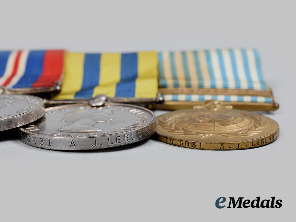 A United Nations Korea Service Medal, in bronze, full size, rim engraved ZG 5031 A. J. LeBLANC, with KOREA suspension bar, discolouration to ribbon, in very fine condition.