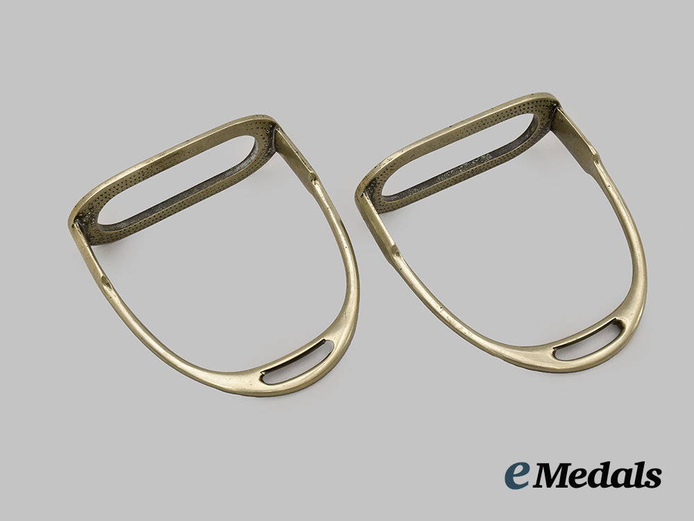 1. Pair of Stirrups: in solid nickel, stamped "SOLID NICKEL" on the bottom of both stirrups, measuring 58.5 mm in width x 125.5 mm in length x 143 mm in height each.