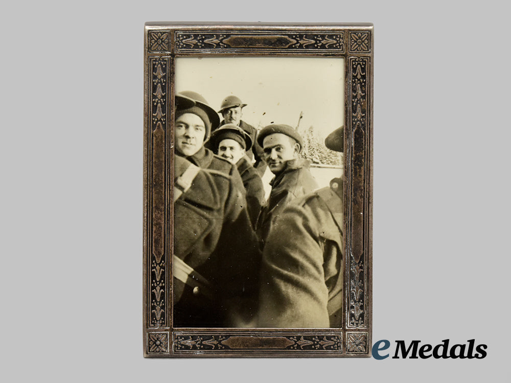 4. Framed Photograph featuring Four Soldiers: black and white photograph, housed in an ornate silver rectangular frame, under glass, measuring 73.7 mm (w) x 105.5 mm (h), with easel backer.