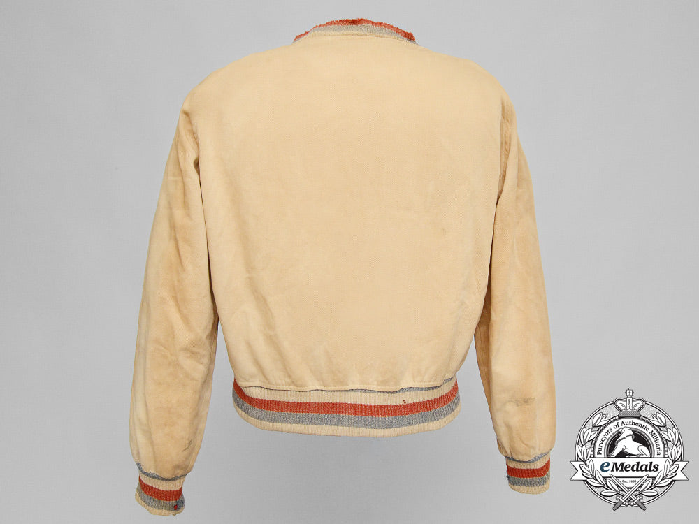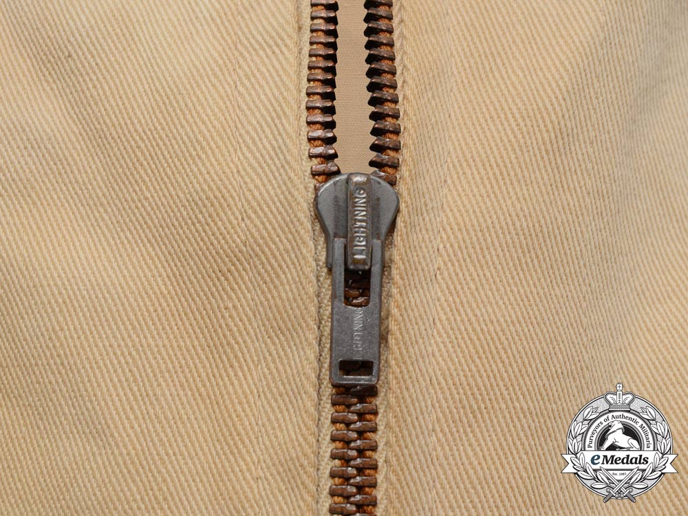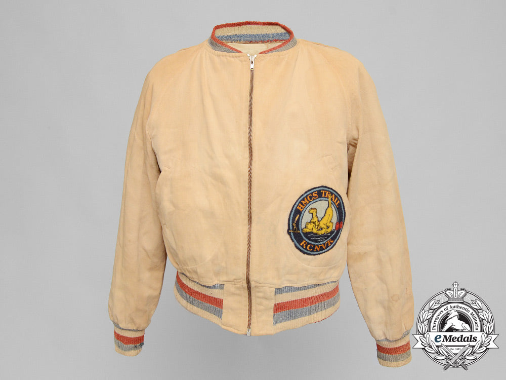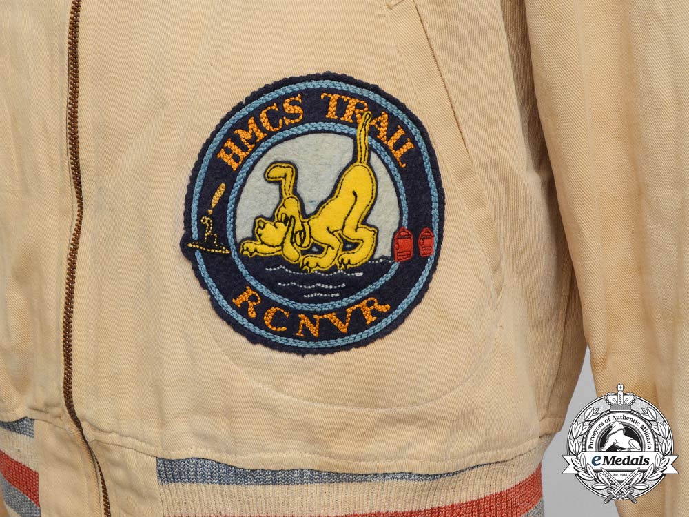 (RCNVR) A rare and possibly unique jacket in khaki coloured cotton, with elasticized cotton trim in beige, red and blue stripes around the collar, the cuffs and the bottom of the jacket, faded manufacturer's label in the collar, full-length zipper on the front, side-entry pockets on either side at the waist, an HMCS Trail badge sewn in place on the left pocket, the badge in light blue, navy blue, red, black and yellow felt, with orange, yellow, light blue, mid-tone blue and black embroidery, illustrating a left-facing dog in yellow, bearing a strong resemblance to the Disney cartoon character Pluto, the dog low to the ground, the right ear raised to listen, its rear end raised and its tail extended upward, three rows of waves below the dog, a submarine (U-boat) in black at the left with an exclamation mark in yellow above, two red hydrants at the right, on a circular frame trimmed on either side by light blue rope, inscribed in orange "HMCS TRAIL" above and "RCNVR" below, measuring 400 mm across the shoulders x 530 mm in length, nip in the fabric on the elasticized cotton trim on the bottom of the jacket, lightly soiled, near extremely fine.