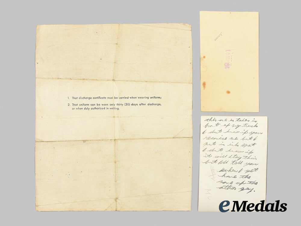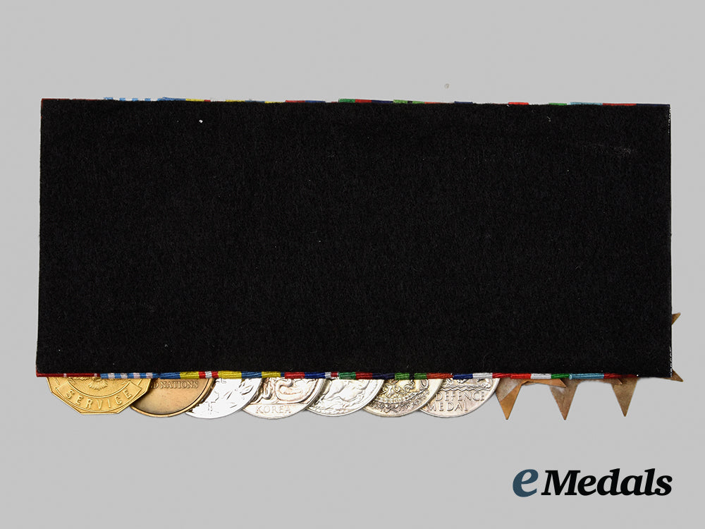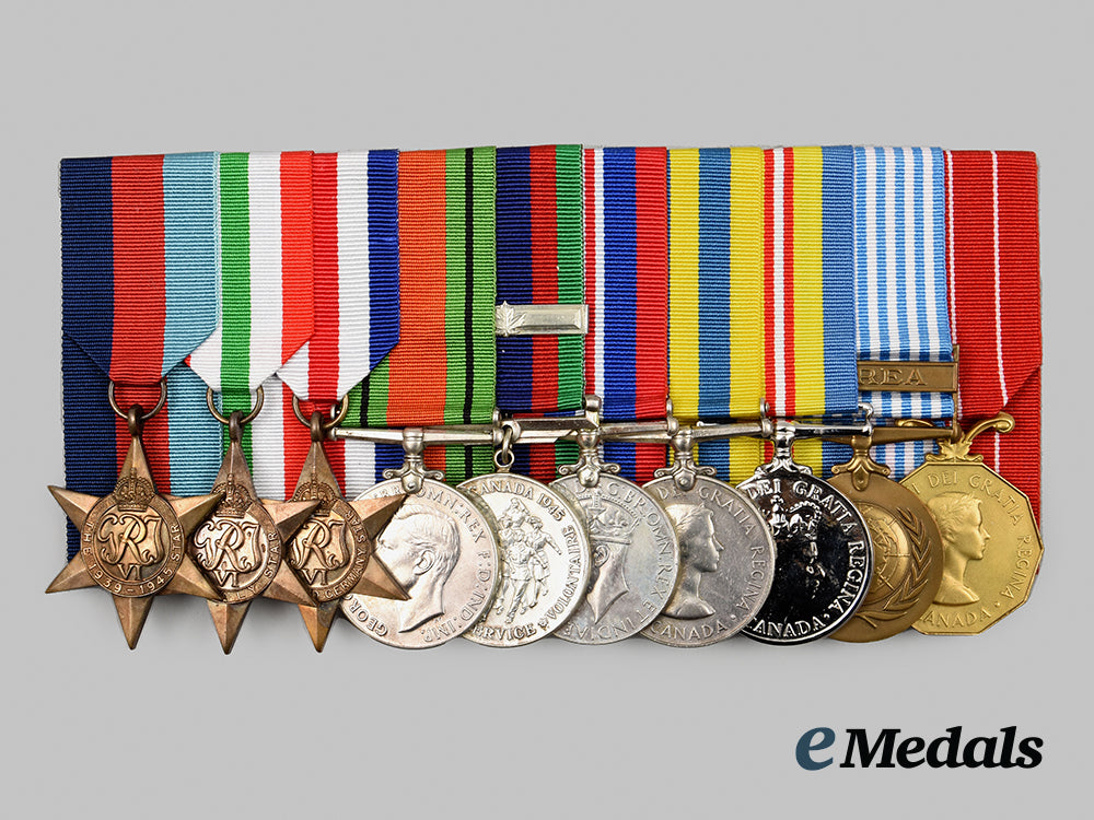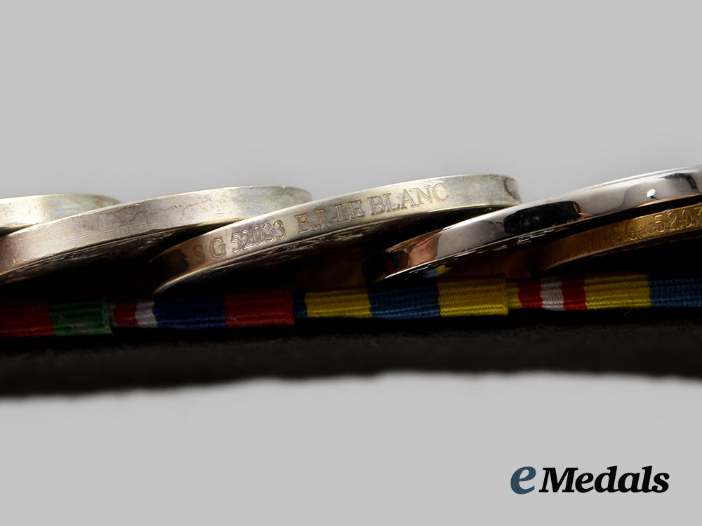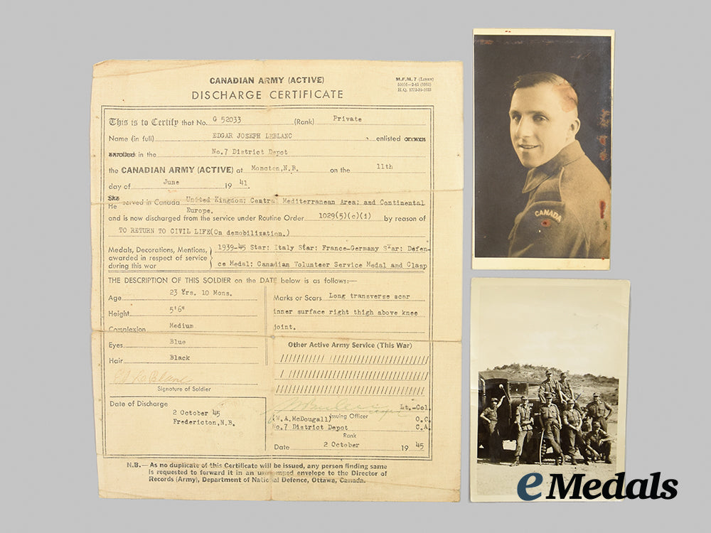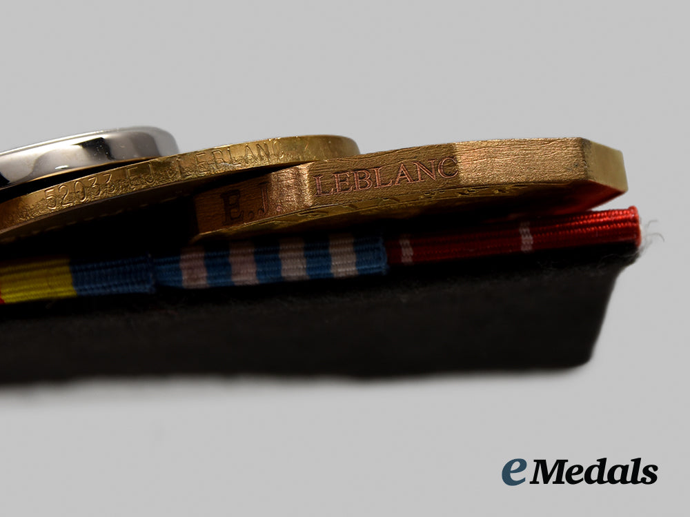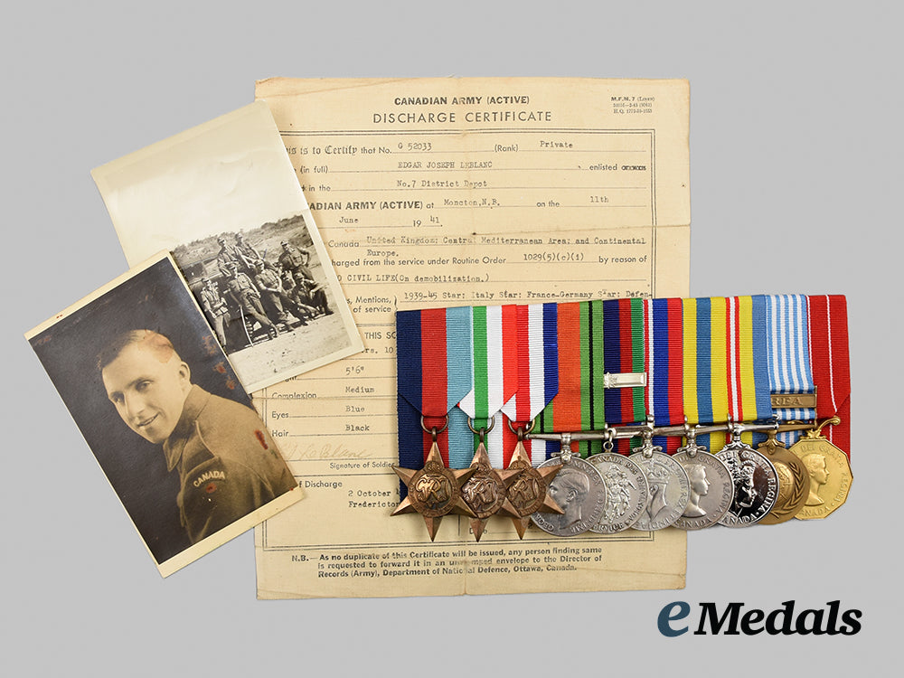 1939-1945 Star; Italy Star; France and Germany Star; Defence Medal; Canadian Volunteer Service Medal with Overseas Clasp; War Medal 1939-1945; Korea Medal, Canadian Issue (SG 52033 E.J. LE BLANC); Canadian Volunteer Service Medal for Korea; United Nations Service Medal for Korea (SG 52033 E.J. LE BLANC); and Canadian Forces' Decoration, QEII (E.J. LEBLANC). Naming is officially engraved on the KM, the UNSMK and the CFD. Court-mounted, replacement ribbons, contact marks evident on the obverse of the War Medal and the Korea Medal, better than very fine. Accompanied by his Discharge Certificate and two black and white Photographs (one of him in uniform, the other of eight men in front of a truck in a field setting).