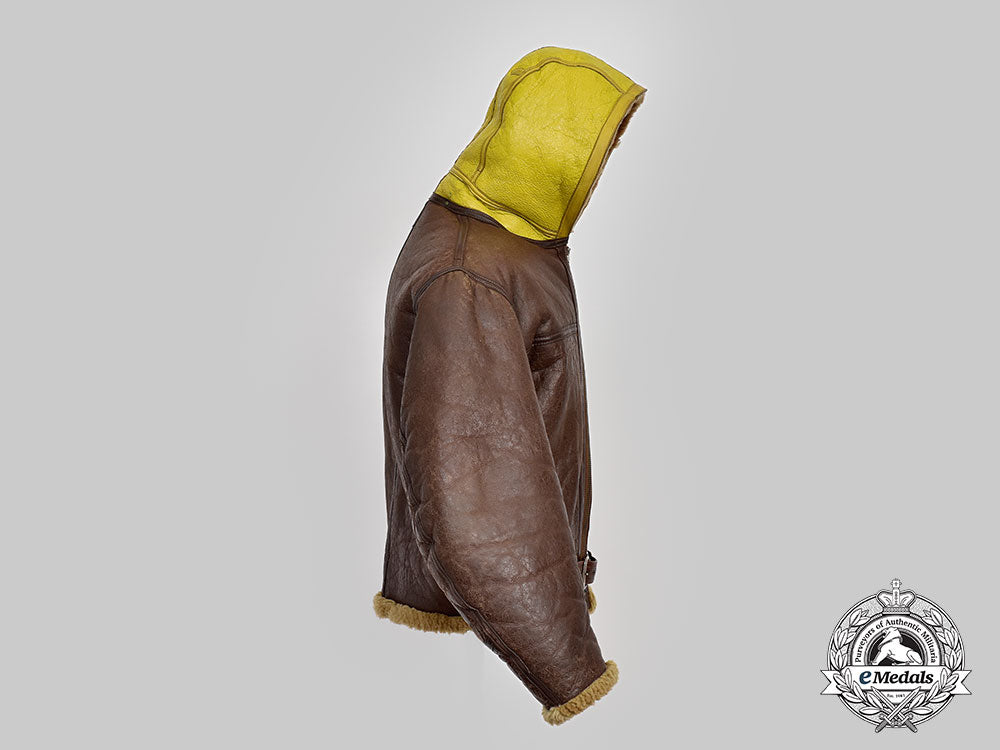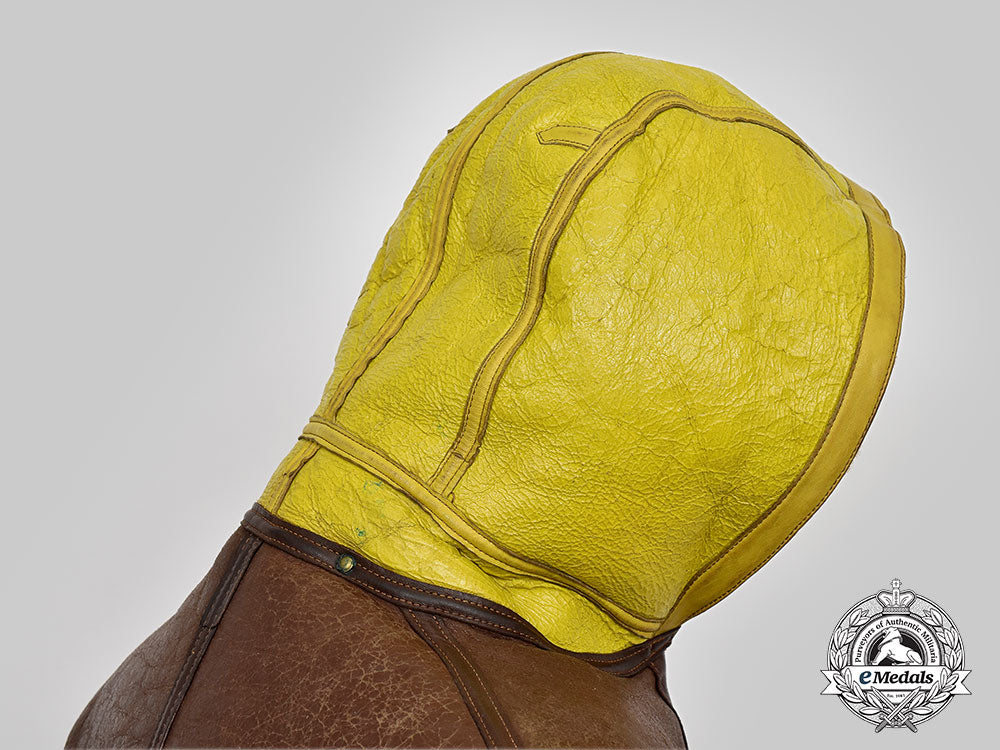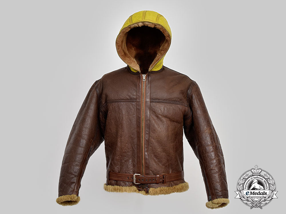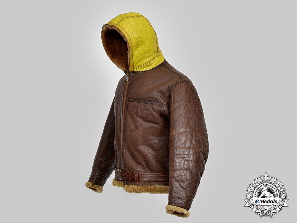 The exterior is in a cinnamon brown leather, with pronounced heavy stitching throughout along the seams. The front has a functioning zipper, with its pull tab marked with a crown above "AM" (Air Ministry) on the obverse and marked "DOT" (Department of Overseas Trade) within a circular border surrounded by the inscription "MADE IN ENGLAND" on the reverse. Also, there is a 20 mm full-length support strip stitched on the body of the jacket beside the zipper on both sides. Both sleeves house a three-quarter length zipper on the inseam, the one on the left sleeve missing its pull tab and remaining functional, the one on the right sleeve non-functioning, missing its slider with pull tab, with the teeth themselves sewn together with black threading in numerous locations to keep it closed, both sleeves with a support strip stitched in place on both sides of the zipper. Both armpits have a triangular patch stitched in place, each of which incorporates eight black metal eyelets for ventilation. There is a two-piece 32 mm wide leather belt at the waist emerging from the side seam on both sides and fed through loops on either side at the front, the right strap incorporating eight black metal eyelets, the left strap with a metal buckle bearing a single prong, and when joined together, ensured a snug fit at the waist. The exterior of the leather hood has been dyed in a yellow-coloured moisture-resistant material, with a wide strip at the opening, along with three vertical support strips giving definition to its domed shape, the two outer strips of which have integral tabs. The yellow dye was used so that in case of a water (sea) landing, the rescue team would be able to easily spot the survivor in the water. The interior is lined in sheepskin in both the body of the jacket itself, as well as the sleeves and the hood. The sheepskin lining is in view when the jacket is closed along the bottom edge opening, as well as on both cuffs and both outward-folding collars. The collar has a 105 mm long chain dual-riveted in place for hanging the jacket upon a hook. It measures 480 mm across the shoulders x 580 mm in length, exhibiting light crazing in the leather exterior, with wear patches visible on the upper portions on both sleeves, in addition to some of the black metal eyelets in the armpits with surface rust. As worn.