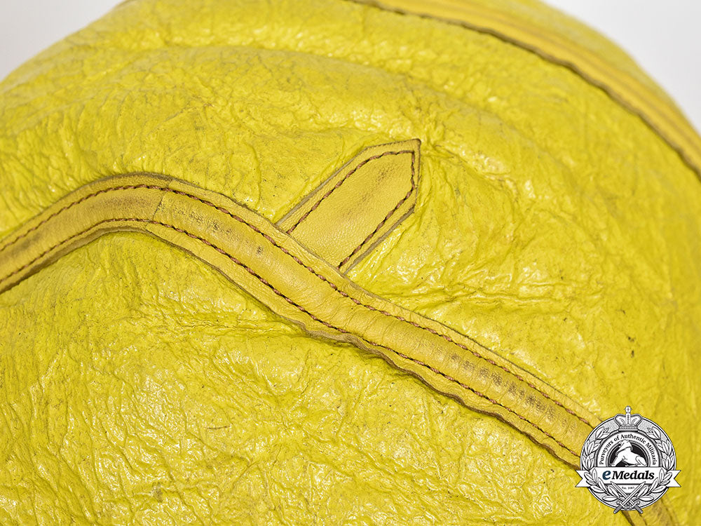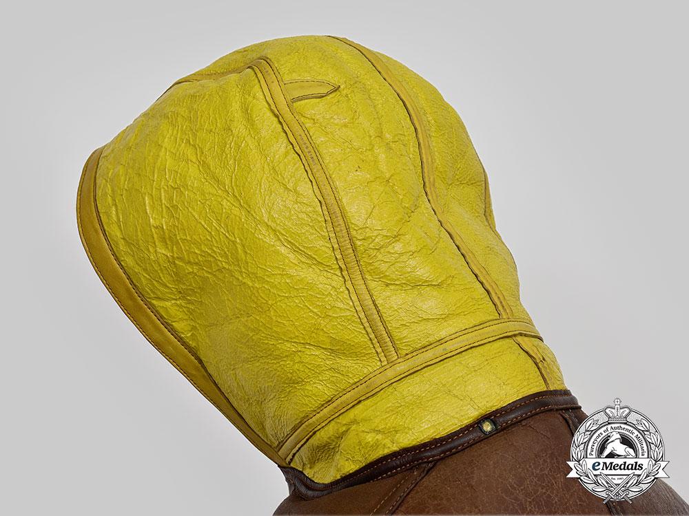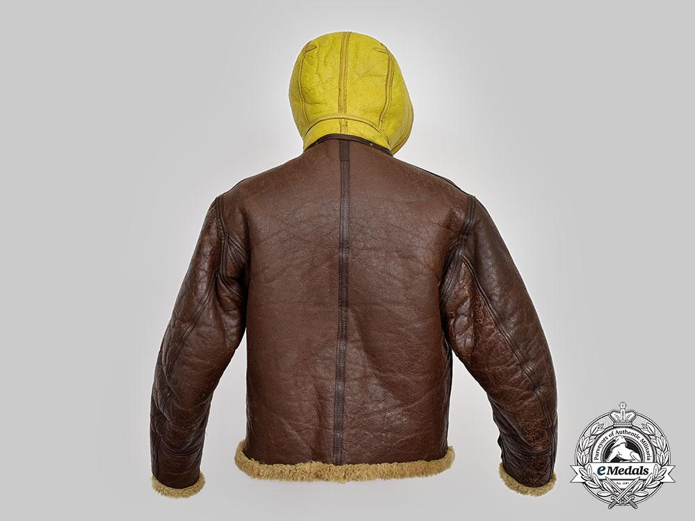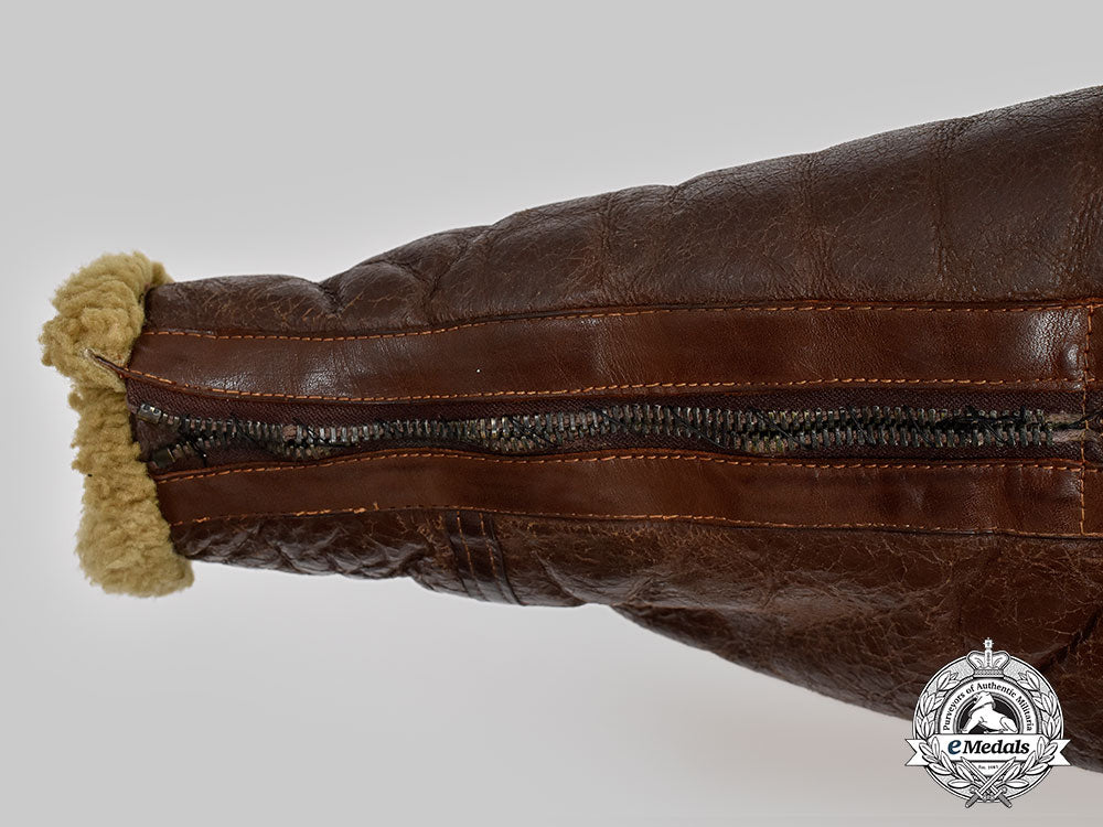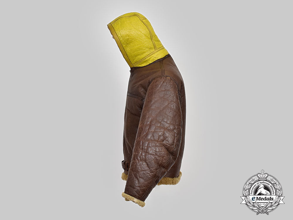 The exterior is in a cinnamon brown leather, with pronounced heavy stitching throughout along the seams. The front has a functioning zipper, with its pull tab marked with a crown above "AM" (Air Ministry) on the obverse and marked "DOT" (Department of Overseas Trade) within a circular border surrounded by the inscription "MADE IN ENGLAND" on the reverse. Also, there is a 20 mm full-length support strip stitched on the body of the jacket beside the zipper on both sides. Both sleeves house a three-quarter length zipper on the inseam, the one on the left sleeve missing its pull tab and remaining functional, the one on the right sleeve non-functioning, missing its slider with pull tab, with the teeth themselves sewn together with black threading in numerous locations to keep it closed, both sleeves with a support strip stitched in place on both sides of the zipper. Both armpits have a triangular patch stitched in place, each of which incorporates eight black metal eyelets for ventilation. There is a two-piece 32 mm wide leather belt at the waist emerging from the side seam on both sides and fed through loops on either side at the front, the right strap incorporating eight black metal eyelets, the left strap with a metal buckle bearing a single prong, and when joined together, ensured a snug fit at the waist. The exterior of the leather hood has been dyed in a yellow-coloured moisture-resistant material, with a wide strip at the opening, along with three vertical support strips giving definition to its domed shape, the two outer strips of which have integral tabs. The yellow dye was used so that in case of a water (sea) landing, the rescue team would be able to easily spot the survivor in the water. The interior is lined in sheepskin in both the body of the jacket itself, as well as the sleeves and the hood. The sheepskin lining is in view when the jacket is closed along the bottom edge opening, as well as on both cuffs and both outward-folding collars. The collar has a 105 mm long chain dual-riveted in place for hanging the jacket upon a hook. It measures 480 mm across the shoulders x 580 mm in length, exhibiting light crazing in the leather exterior, with wear patches visible on the upper portions on both sleeves, in addition to some of the black metal eyelets in the armpits with surface rust. As worn.