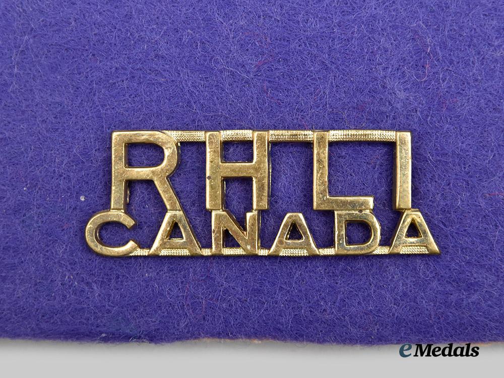 1. Cap Badge: two-piece construction, RHLI insignia in silvered metal, mounted to a brass maple leaf base, measuring 42.5 mm (w) x 43 mm (h), both lugs and pin intact.