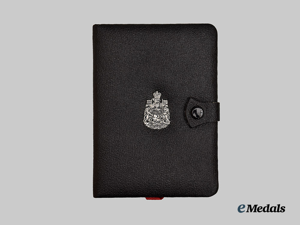 All mounted on a medal bar in standard Canadian fashion, with a white cardstock backer and wrapped by all three ribbons, with a black felt backer with a decal of the Canadian Coat of Arms, accompanied by its presentation case, constructed of a metal (magnetic) core with a textured black exterior liner, the exterior of the lid with an applied Canadian Coat of Arms, the interior of the lid with a padded liner embossed with “Royal Canadian Mint - Monnaie royale canadienne” along with the Canadian flag, with a recessed red felt medal bed for placement of the medal bar, along with a snap closure, measuring 88 mm (w) x 122 mm (l).