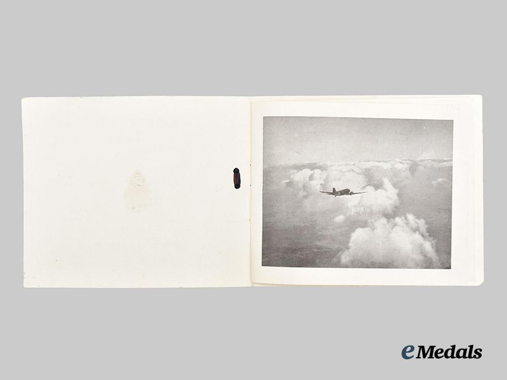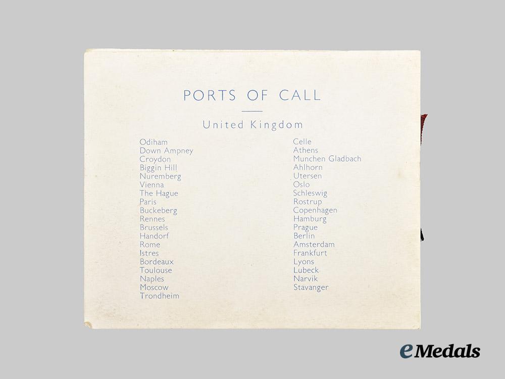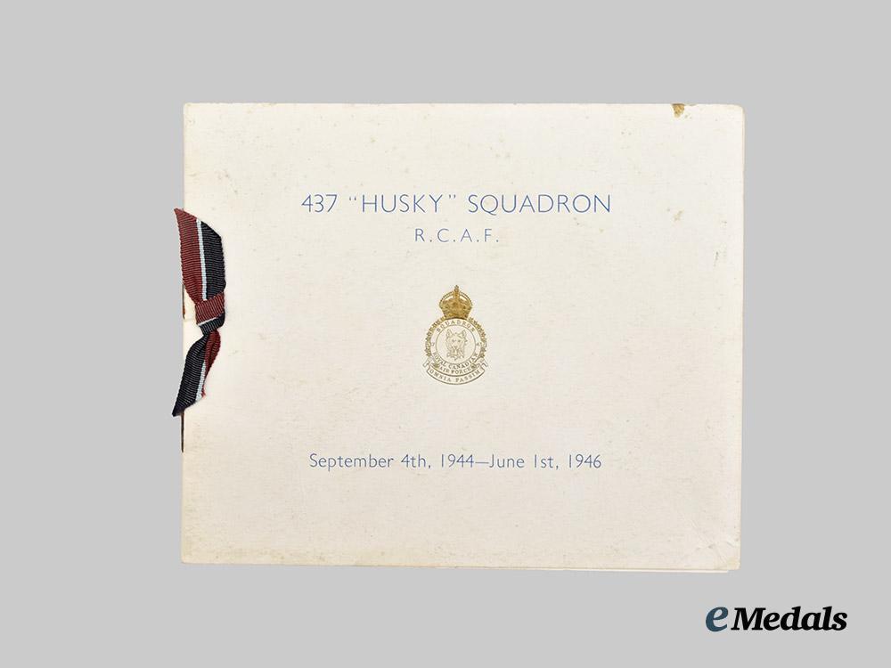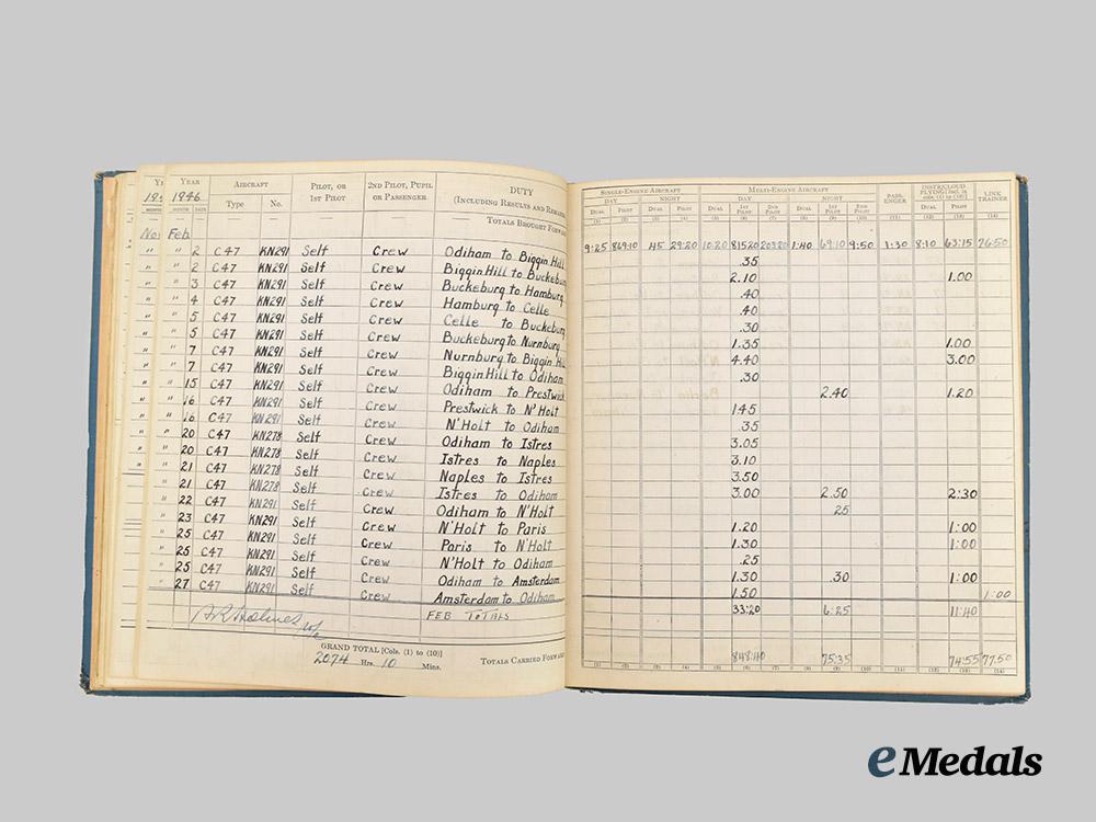 4. Log Book (2 of 2), a hardcover book, named to C. G. Harville F/LT, containing entries from January 5, 1944 to June 7, 1946, primarily for the C47 “Dakota” Aircraft, also contains four small black and white pictures of the crew members (F/LT Harville, F/O McNabb, F/O Crump, P/O Weir), measuring 220 mm (w) x 225 mm (h), light wear, very fine. Accompanied by a 437 “Husky” Squadron RCAF booklet containing a brief history of the squadron and a crew list from May 1946, very fine.