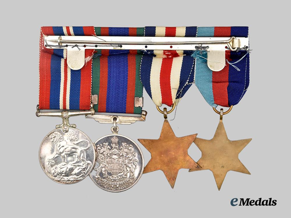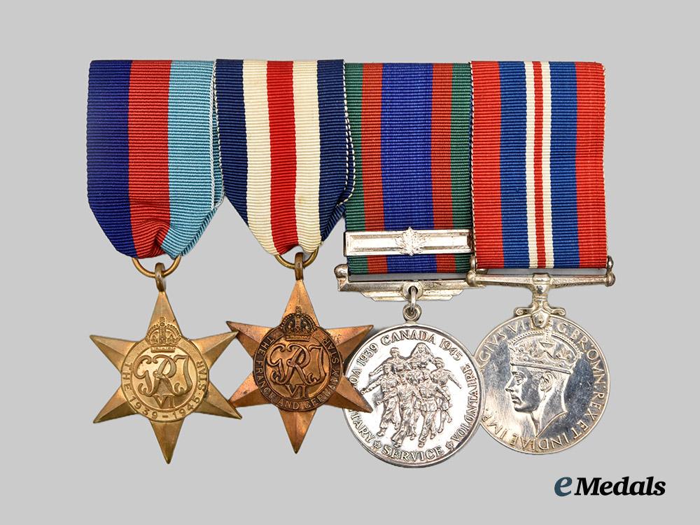 2. Group of four Second World War medals: 1939-1945 Star, France and Germany Star, Canadian Volunteer Service Medal with Overseas Clasp and War Medal, 1939-1945 mounted to a suspension with swing bar pinback, original ribbons.
