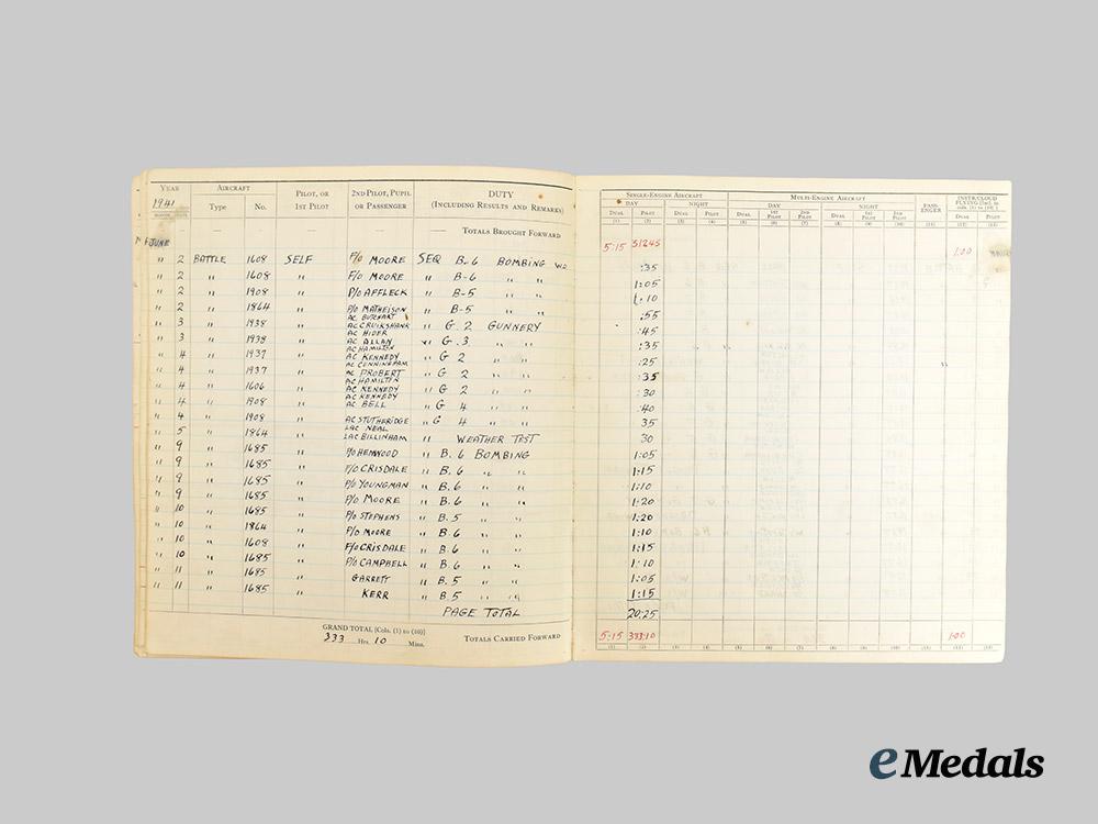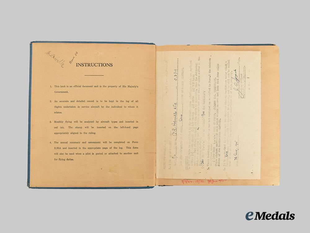 3. Log Book (1 of 2), a hardcover book, named to Charles G. Harville F/LT, containing entries from October 8, 1940 to 29 December 29, 1943 for various aircrafts (Battle, Harvard, Anson, Crane etc.) and duties (Night Bombing, Weather Checks, Photographic Flights etc.), measures 220 mm (w) x 227 mm (h), light wear, very fine.