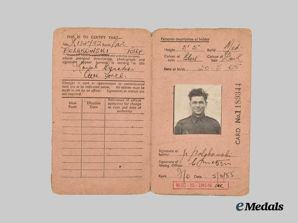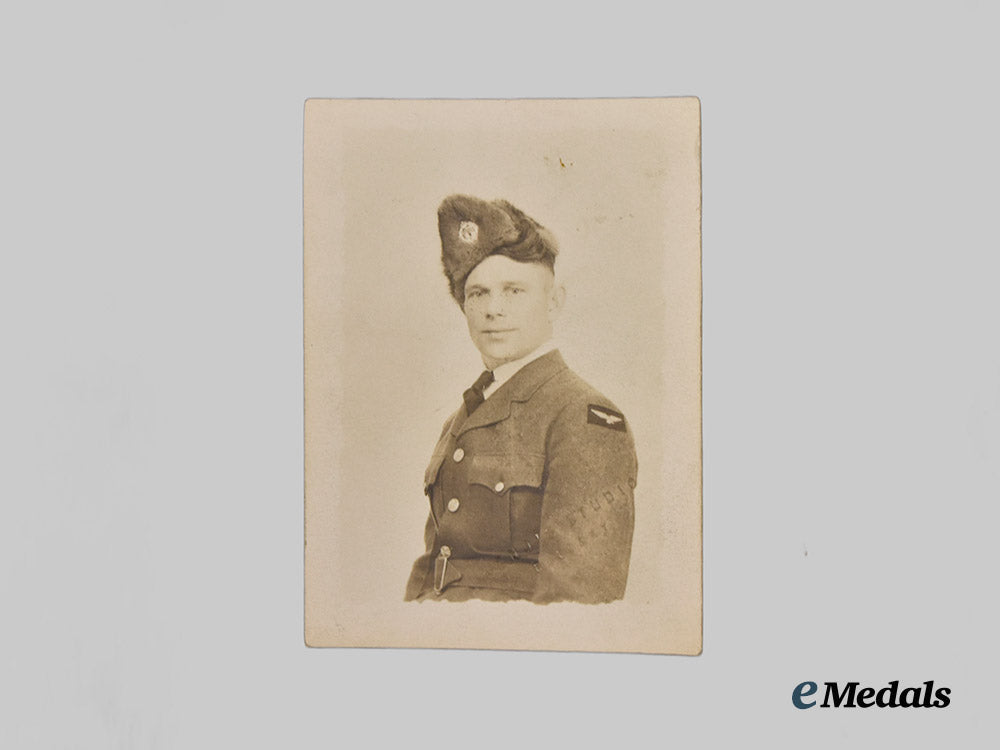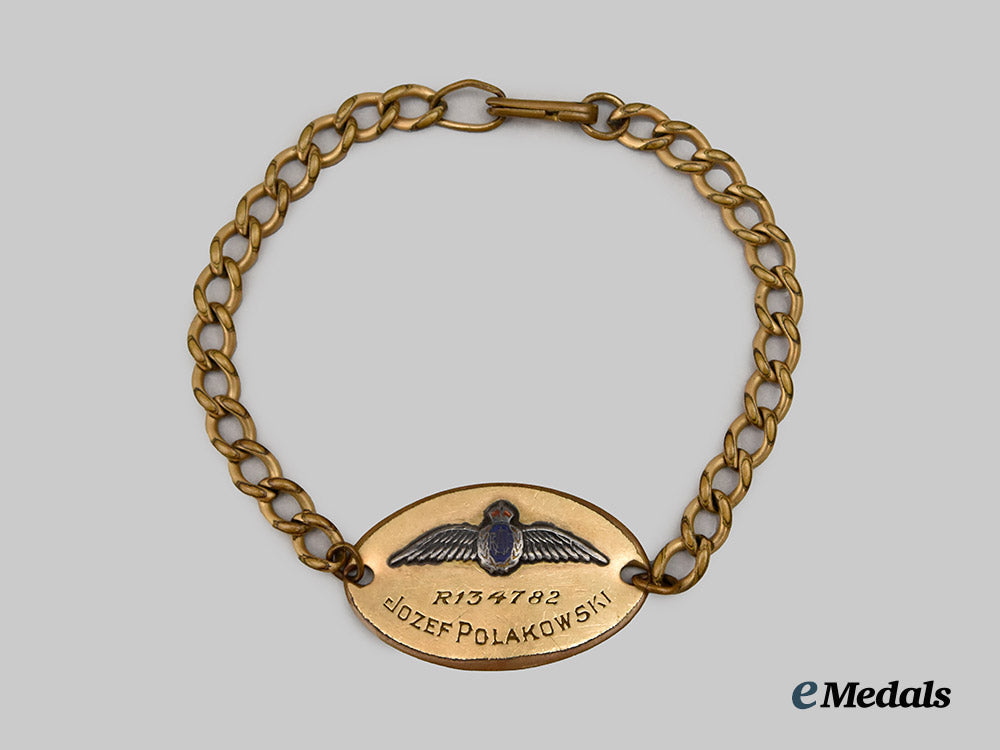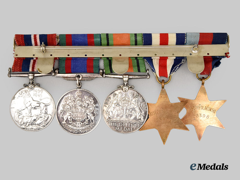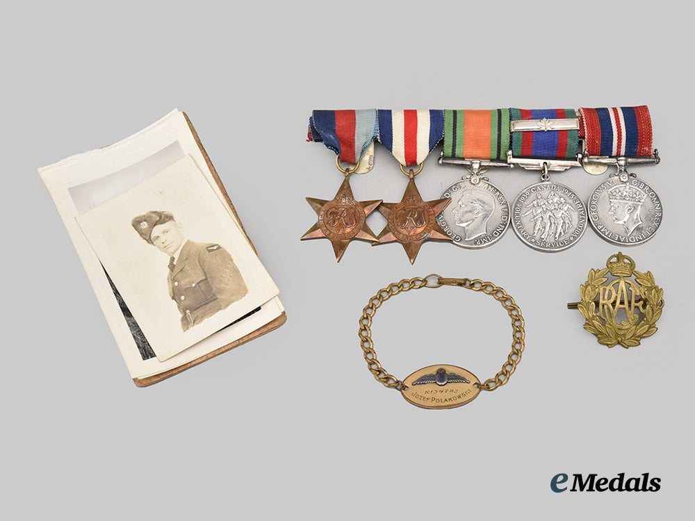 1939-1945 Star (JOSEPH POLAKOWSKI 23398); France and Germany Star (JOSEPH POLAKOWSKI 23398); Defence Medal (JOSEPH POLAKOWSKI 23398); Canadian Volunteer Service Medal with Overseas Clasp (JOSEPH POLAKOWSKI 23398); and War Medal 1939-1945 (JOSEPH POLAKOWSKI 23398). Naming is privately engraved on the reverse of the two Stars and on the edge of the three silver medals, inverted. Mounted to a suspension with swing bar pinback, as worn by the veteran, minor green oxidation spot evident on the France and Germany Star, very light contact overall, original ribbons, near extremely fine. Accompanied by an RCAF Cap Badge (in brass, measuring 39.3 mm (w) x 45 mm (h), intact lugs and pin); his RCAF Wrist Bracelet (silver with red and blue enamelled RCAF insignia, mounted to a brass base, measuring 36 mm (w) x 22.5 mm (h), with wrist chain); his Identity Card (numbered "1189344", entries in black ink, black and white photograph with embossed stamps, measuring 76 mm (w) x 127 mm (h));, along with five Vintage Photographs (black and white, illustrating Polakowski in uniform and/or his flight suit, in various sizes).