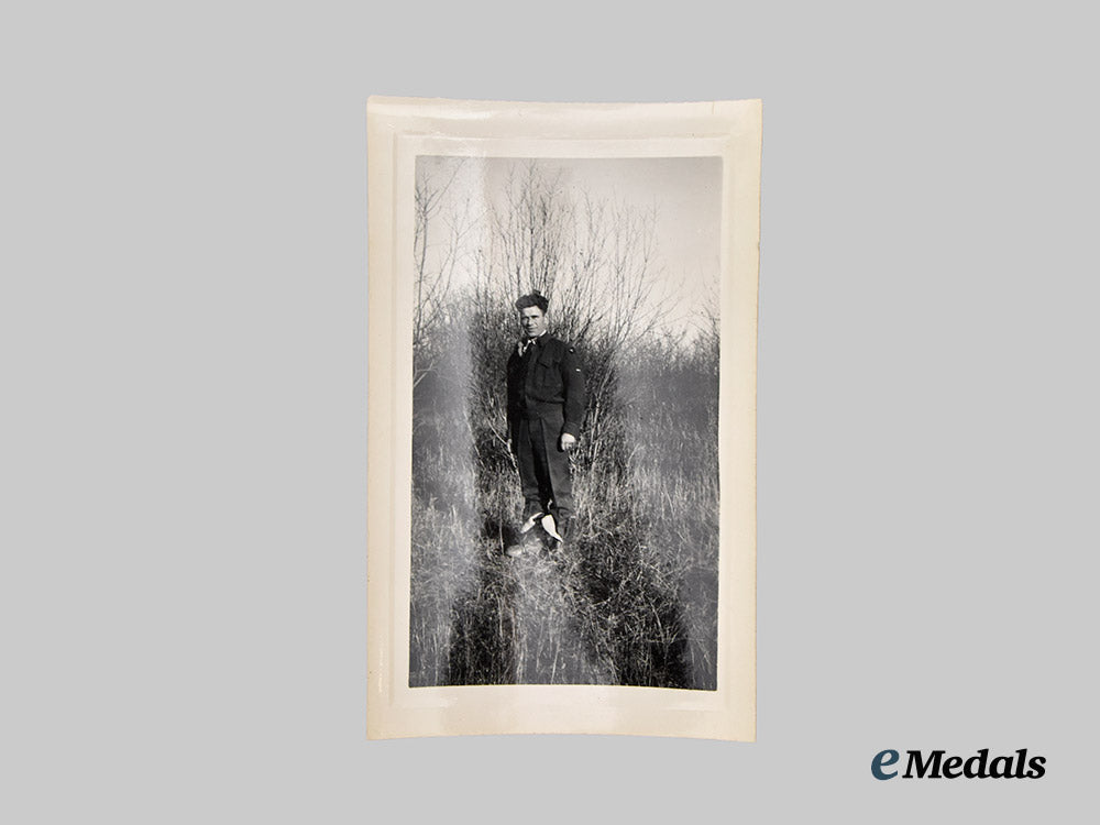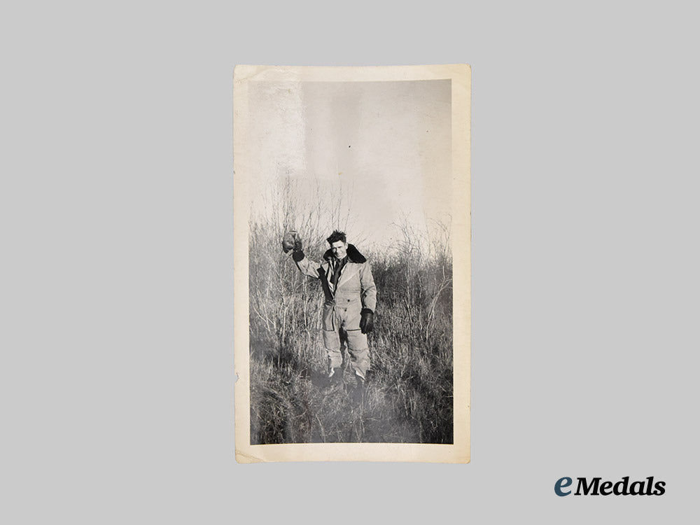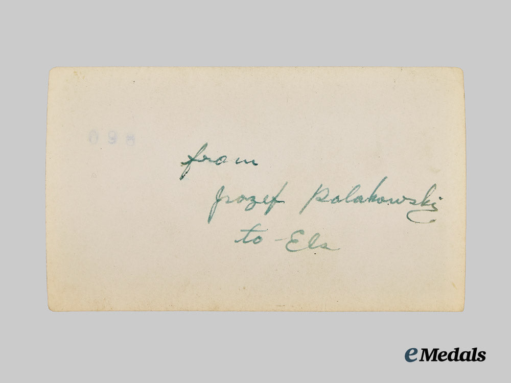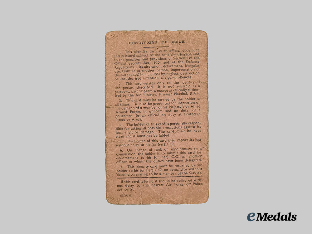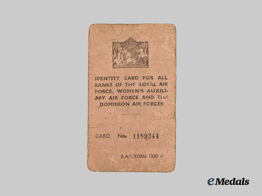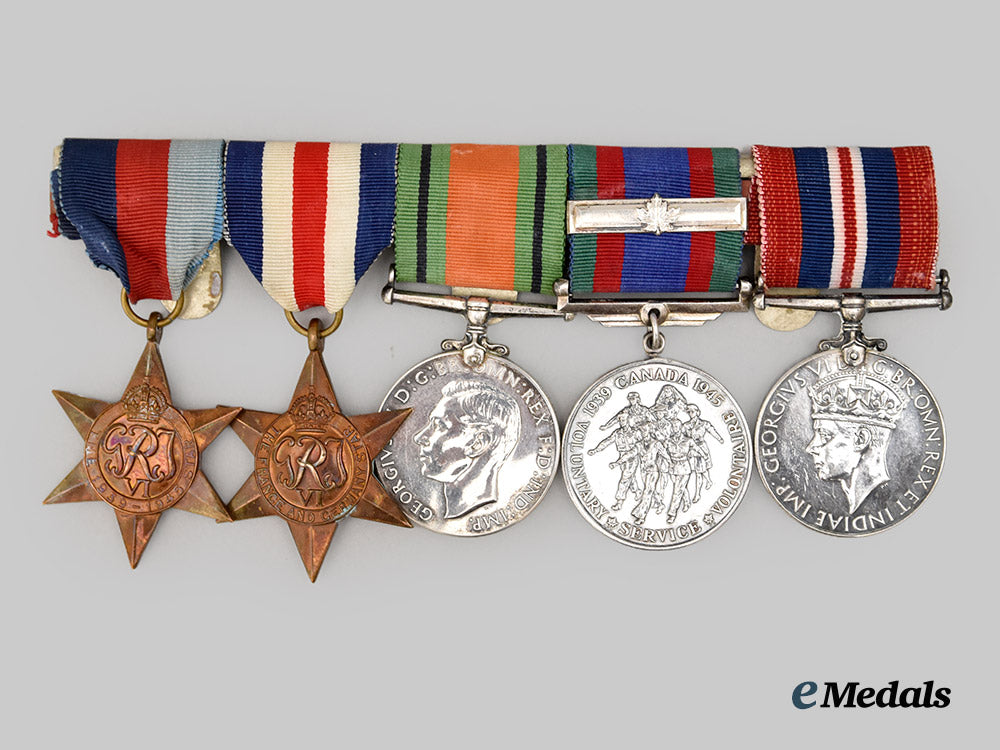 1939-1945 Star (JOSEPH POLAKOWSKI 23398); France and Germany Star (JOSEPH POLAKOWSKI 23398); Defence Medal (JOSEPH POLAKOWSKI 23398); Canadian Volunteer Service Medal with Overseas Clasp (JOSEPH POLAKOWSKI 23398); and War Medal 1939-1945 (JOSEPH POLAKOWSKI 23398). Naming is privately engraved on the reverse of the two Stars and on the edge of the three silver medals, inverted. Mounted to a suspension with swing bar pinback, as worn by the veteran, minor green oxidation spot evident on the France and Germany Star, very light contact overall, original ribbons, near extremely fine. Accompanied by an RCAF Cap Badge (in brass, measuring 39.3 mm (w) x 45 mm (h), intact lugs and pin); his RCAF Wrist Bracelet (silver with red and blue enamelled RCAF insignia, mounted to a brass base, measuring 36 mm (w) x 22.5 mm (h), with wrist chain); his Identity Card (numbered "1189344", entries in black ink, black and white photograph with embossed stamps, measuring 76 mm (w) x 127 mm (h));, along with five Vintage Photographs (black and white, illustrating Polakowski in uniform and/or his flight suit, in various sizes).
