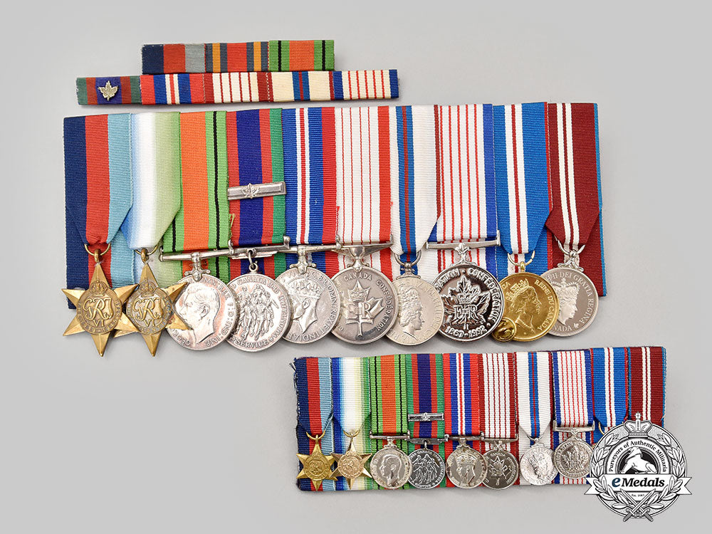 second row: Canadian Volunteer Service Medal with silver Maple Leaf Clasp, War Medal 1939-1945, Canadian Centennial Medal 1867-1967, Queen Elizabeth II Silver Jubilee Medal 1952-1977, 125th Anniversary of the Confederation of Canada Medal 1867-1992; mounted to a metal bar with horizontal pinback, original lightly soiled original ribbons.
