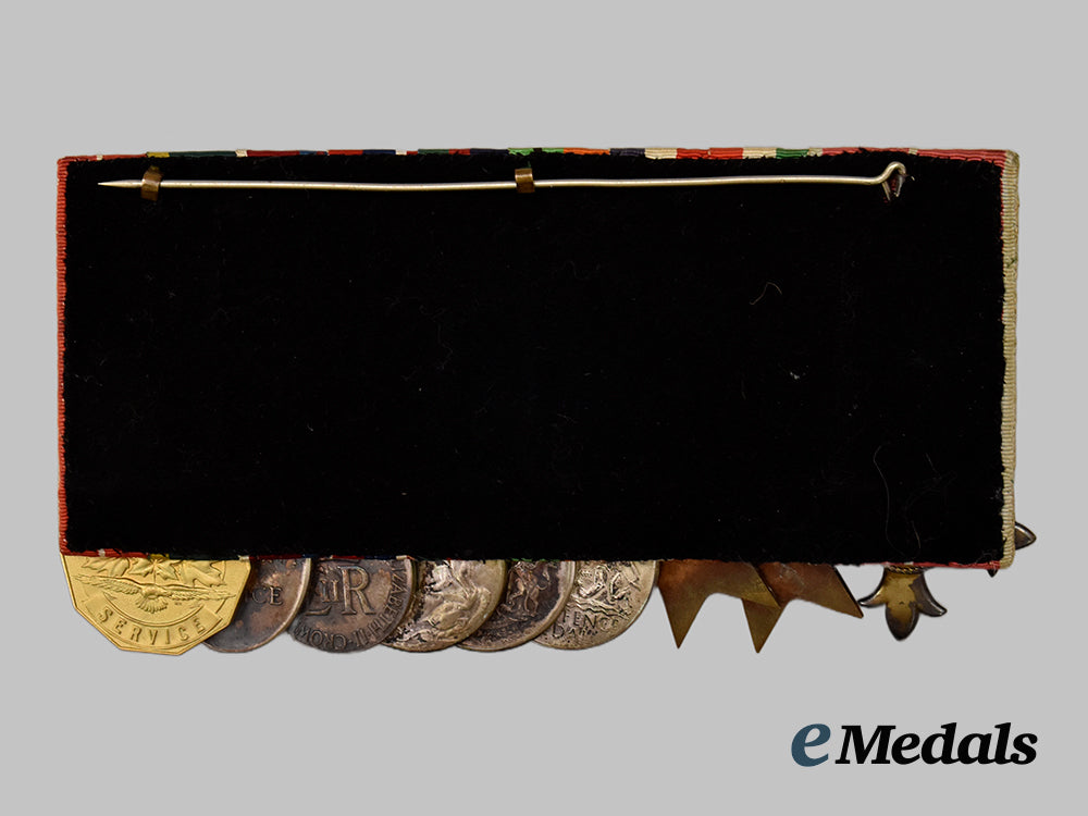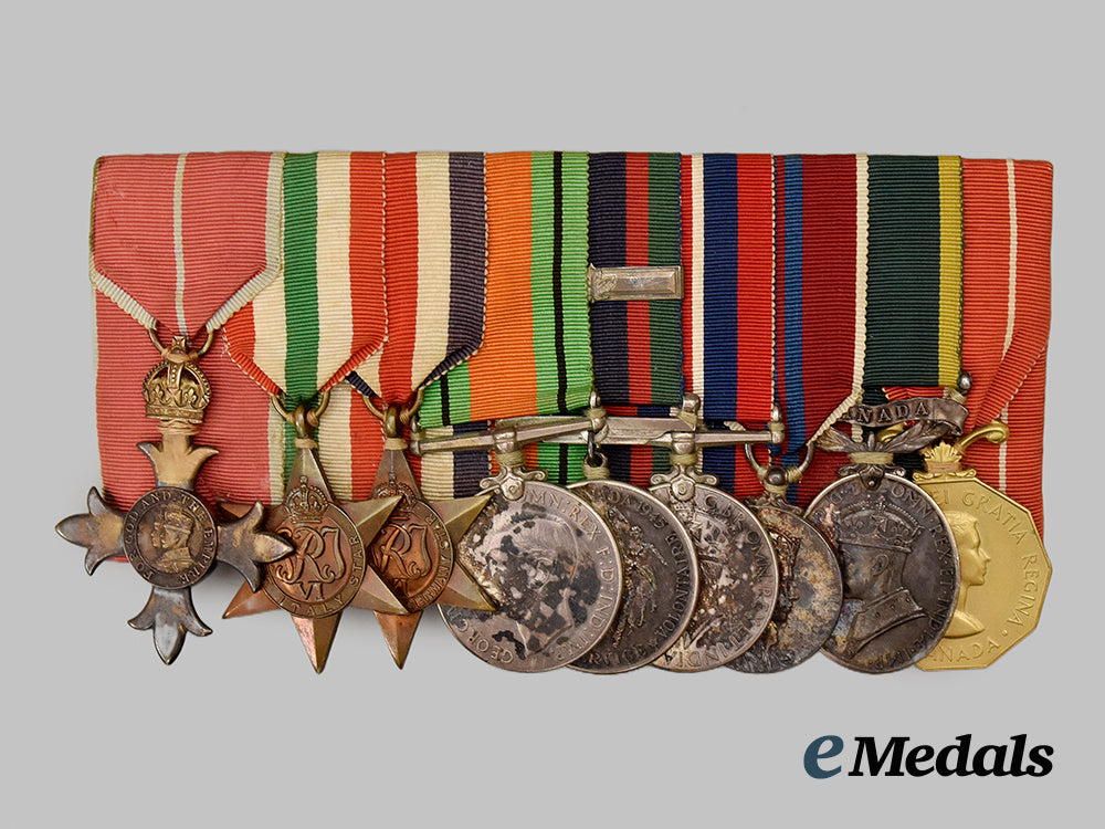 A Fine medal bar, as worn including: OBE in silver, Italy Star, France & Germany Star, Defence Medal, CVSM, War Medal 1939-1945, Queen Elizabeth Coronation Medal 1953, Canada Efficiency Decoration (LT.COL. R.A.CAMPBELL R.C.O.C.), Canadian Decoration (LT-COL. R.A.CAMPBELL), mounted as worn, extremely fine.