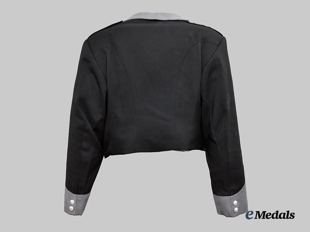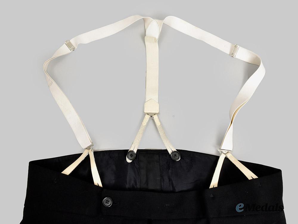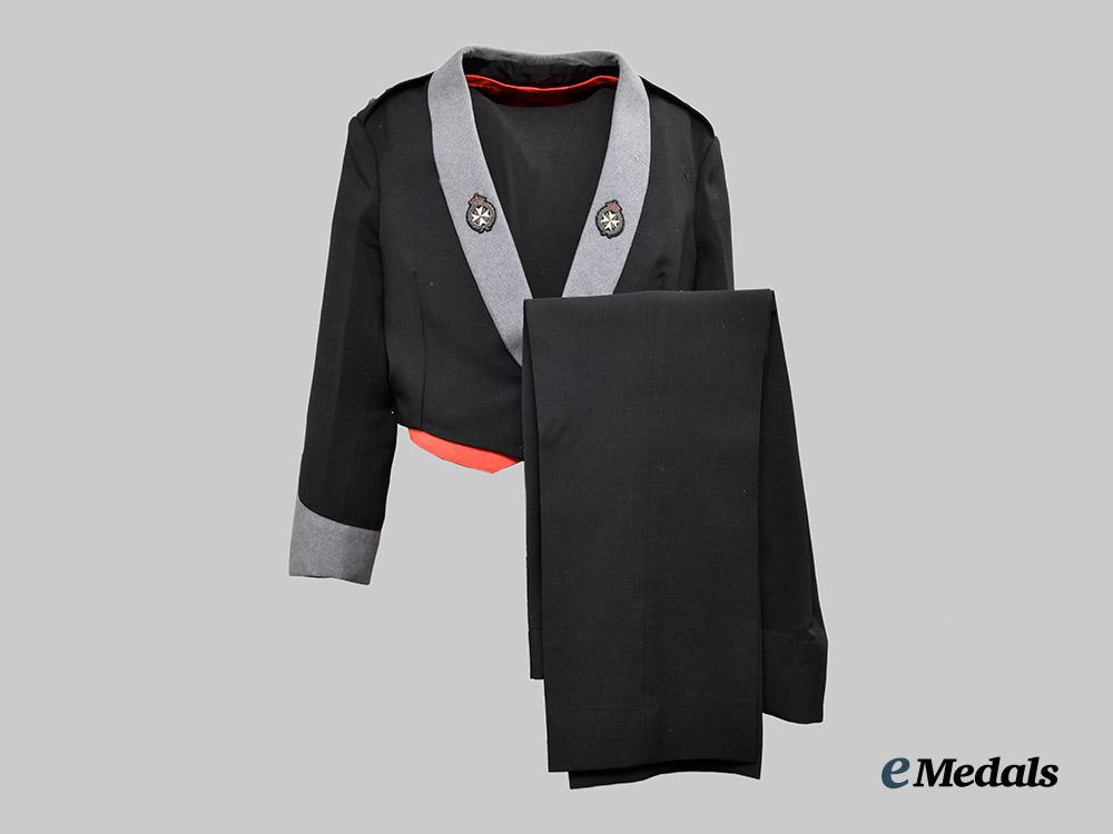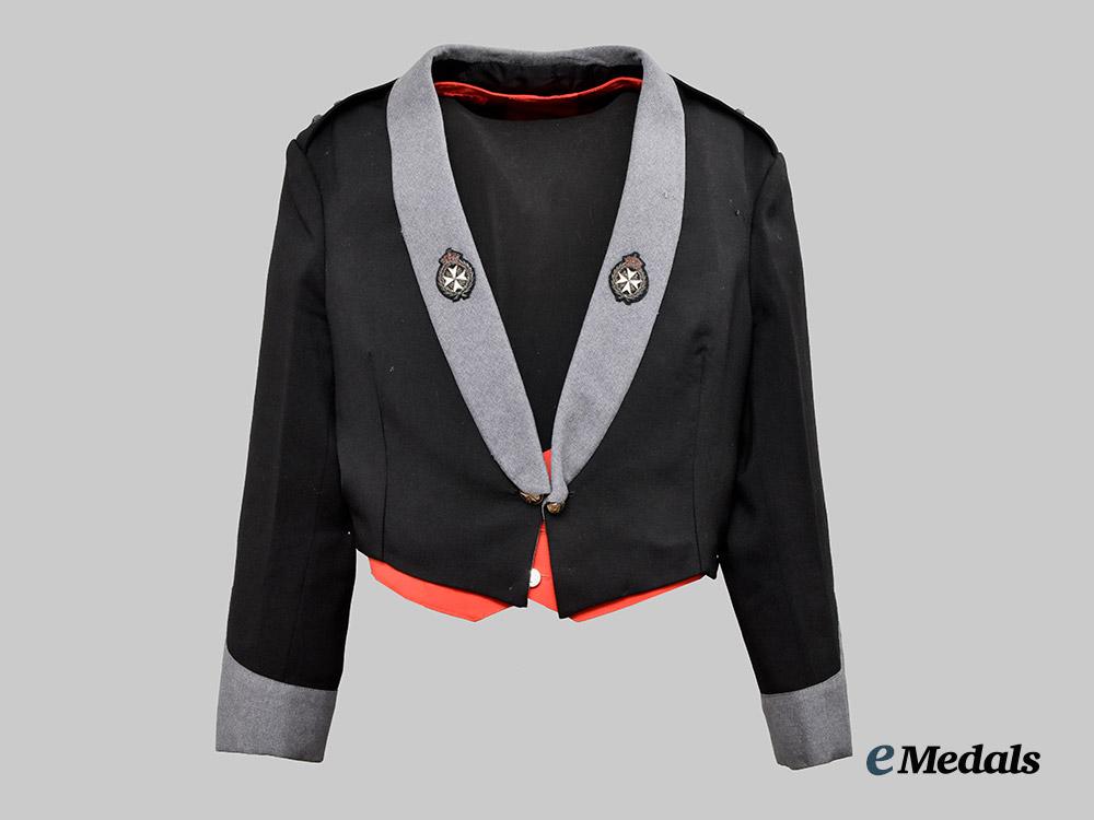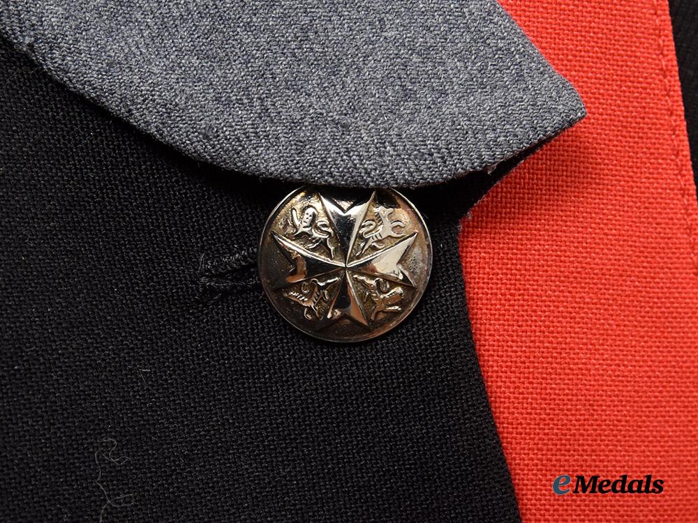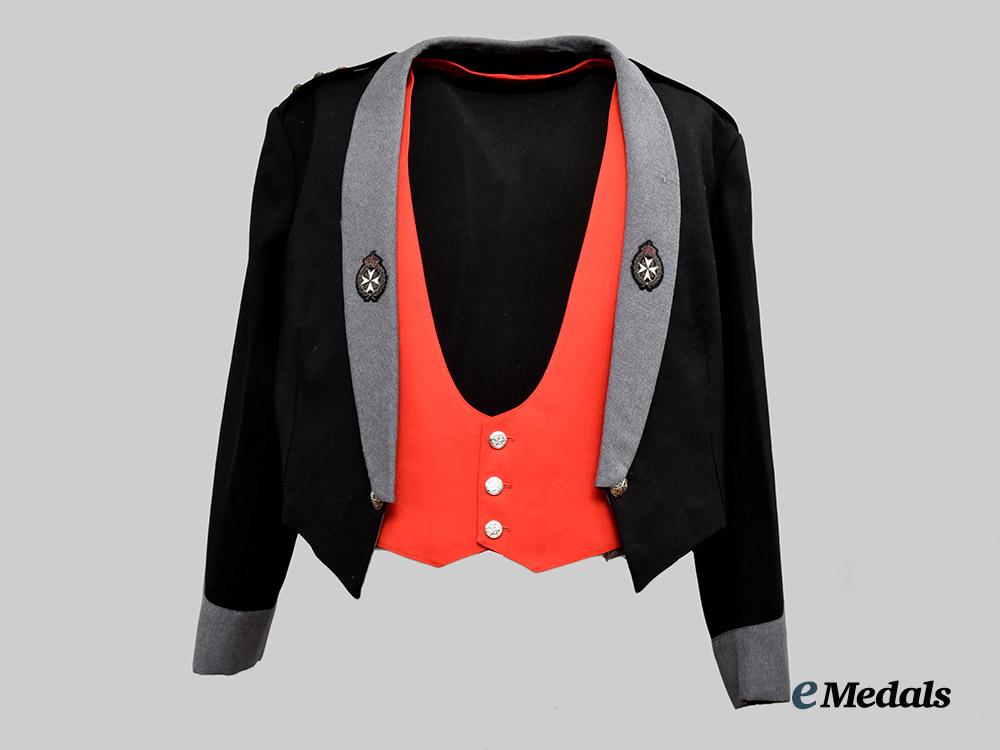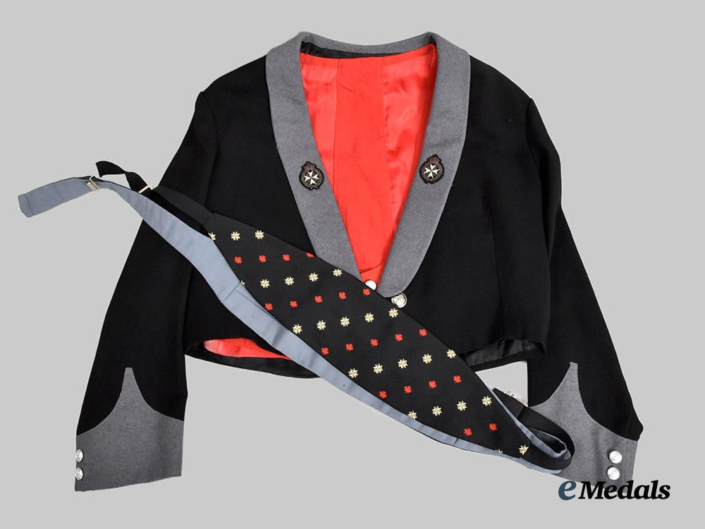 An Order of St John uniform worn by Captain Jack Boddington, founder of the Military Collector’s Club of Canada. The jacket is constructed of a black wool with a gray collar and gray cuffs. The collar is adorned with an insignia of the Order of St John of Jerusalem, measuring 55 mm (h) x 40 mm (w) and depicting a white Maltese cross within a wreath, topped by a Royal crown. The front is completed by two large silver buttons on the left and right side, each bearing the insignia of the Order, a Maltese cross with lions and unicorns arranged alternatingly in each quadrant, as well as the cuffs, with two buttons each. The inside is lined with black nylon with no manufacturer's label. The jacket measures 60 cm across the shoulders x 50 cm in length, in excellent condition. Accompanying the jacket is a red waistcoat with three large silver buttons bearing the insignia of the Order; as well as two cummerbunds, one in plain gray wool, and one in black wool with a pattern depicting maple leaves and Maltese cross insignia, sewn in place on the interior lining is the manufacturer’s label for THE PARK LANE NECKWEAR CANADA. The trousers are also in black wool and include white suspenders. Overall, in extremely fine condition.