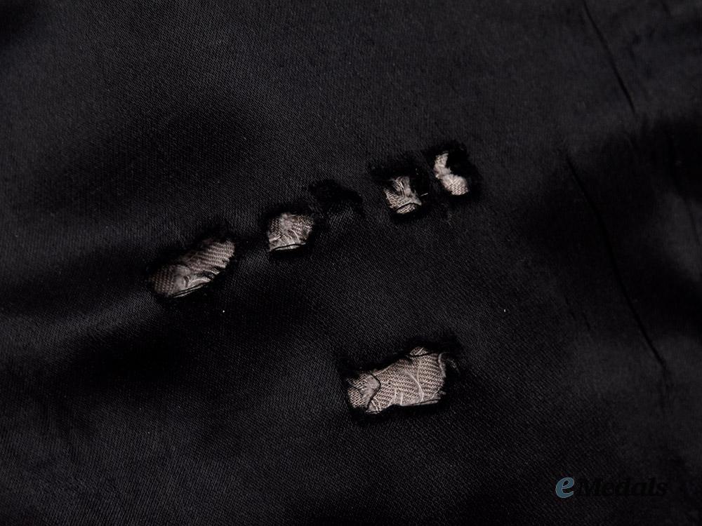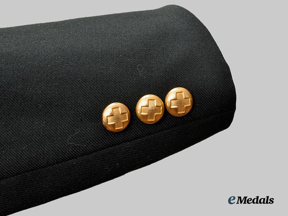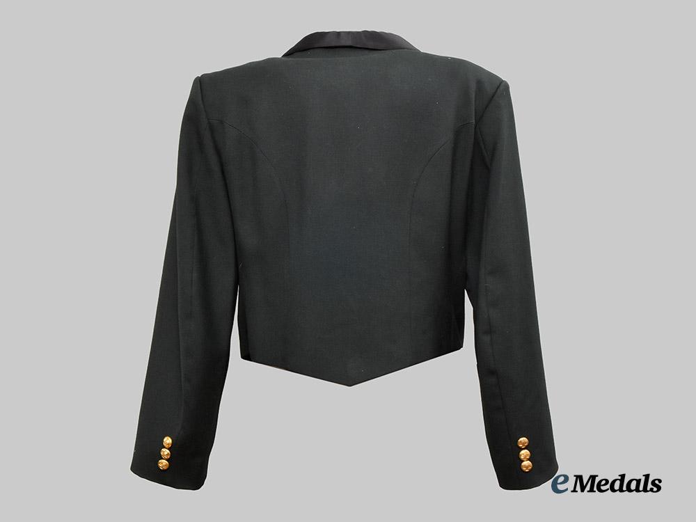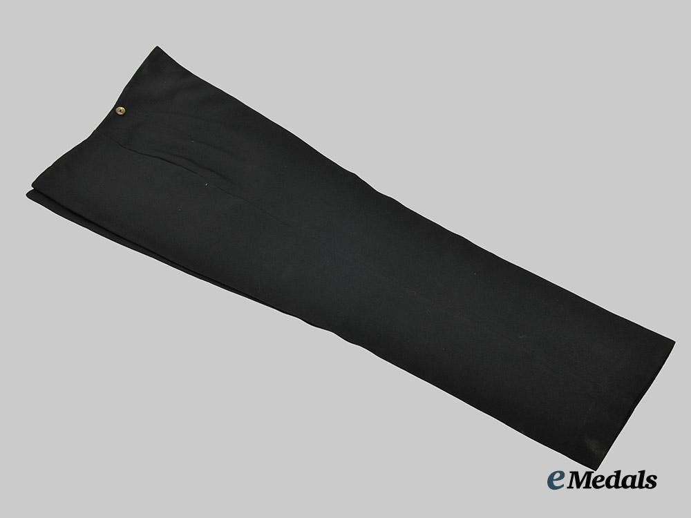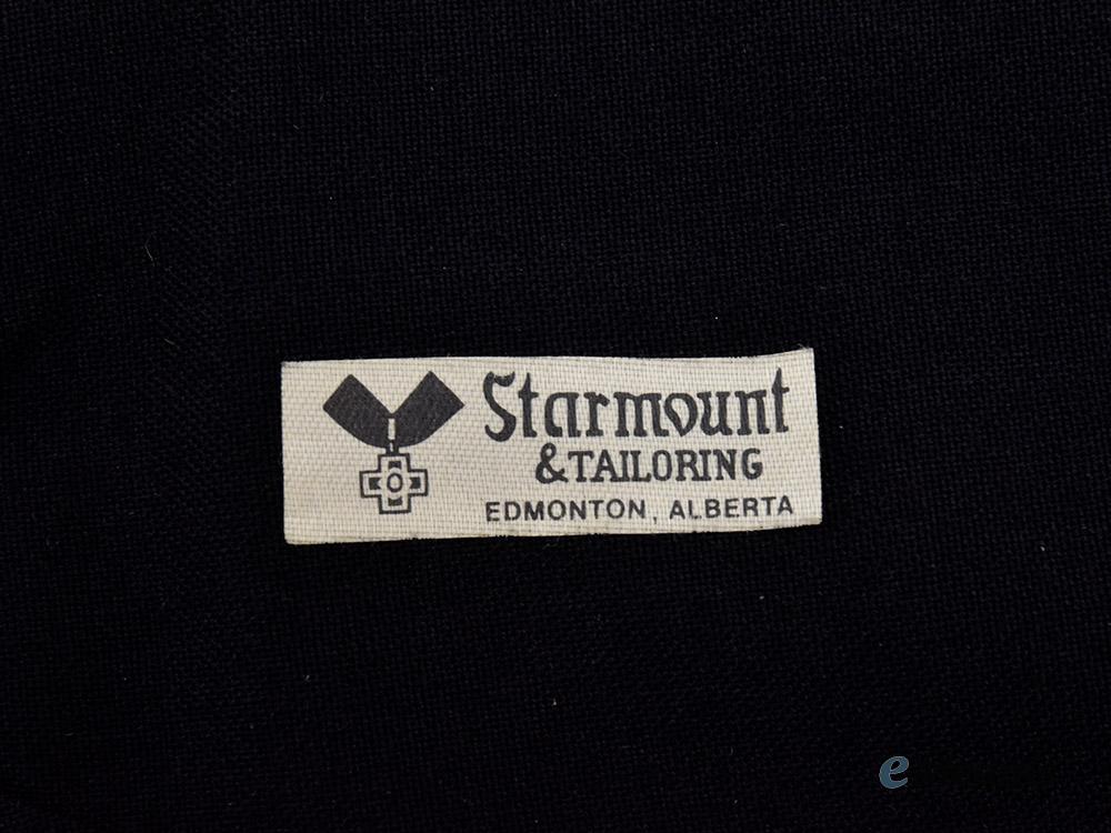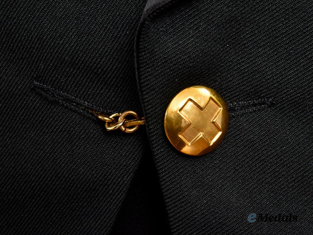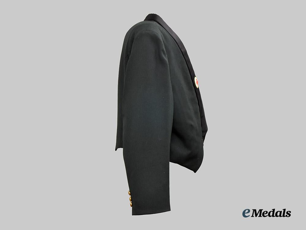 A Canadian Order of the Red Cross mess kit (dress uniform), consisting of a jacket constructed of black polyester. The lapels are flanked by embroidered Red Cross insignia, while the flaps close with gilded buttons affixed to a multi-link chain. The interior is fully encompassed by a multi-piece black liner, with the right flap retaining a tailor’s label for the Edmonton-based firm of LaFlèche Brothers, while an interior pocket retains a label bearing a typewritten owner’s name of “MR. J. BODDINGTON” (indicating issue to Captain Jack Boddington, a founding member of the Military Collectors Club of Canada who amassed a noted private collection of life-saving medals and awards), with a manufacture date of “JAN/77”. It measures approximately 44 cm across the shoulders, with an arm length of 58 cm, and an overall length of 58 cm (when folded on a flat surface). Accompanying the jacket are matching trousers, constructed of identical black polyester and retaining a matching tailor’s label and name tag within the interior. They measure approximately 50 cm across the waist, with an inseam of 34 cm, and an overall length of 104 cm. Also accompanying the uniform are a matching tie and belts. The jacket demonstrates minor and sporadic mothing and material fatigue, but this complete uniform to a noted figure in the militaria community remains in a near extremely fine condition.