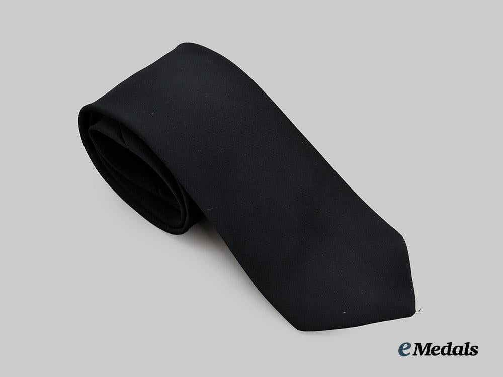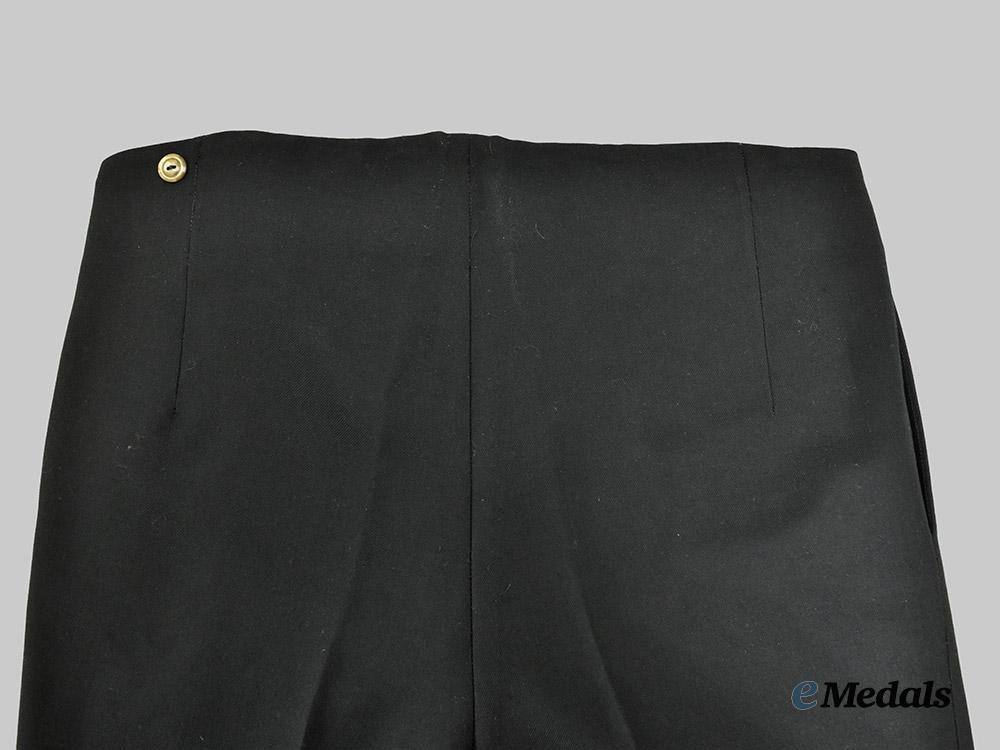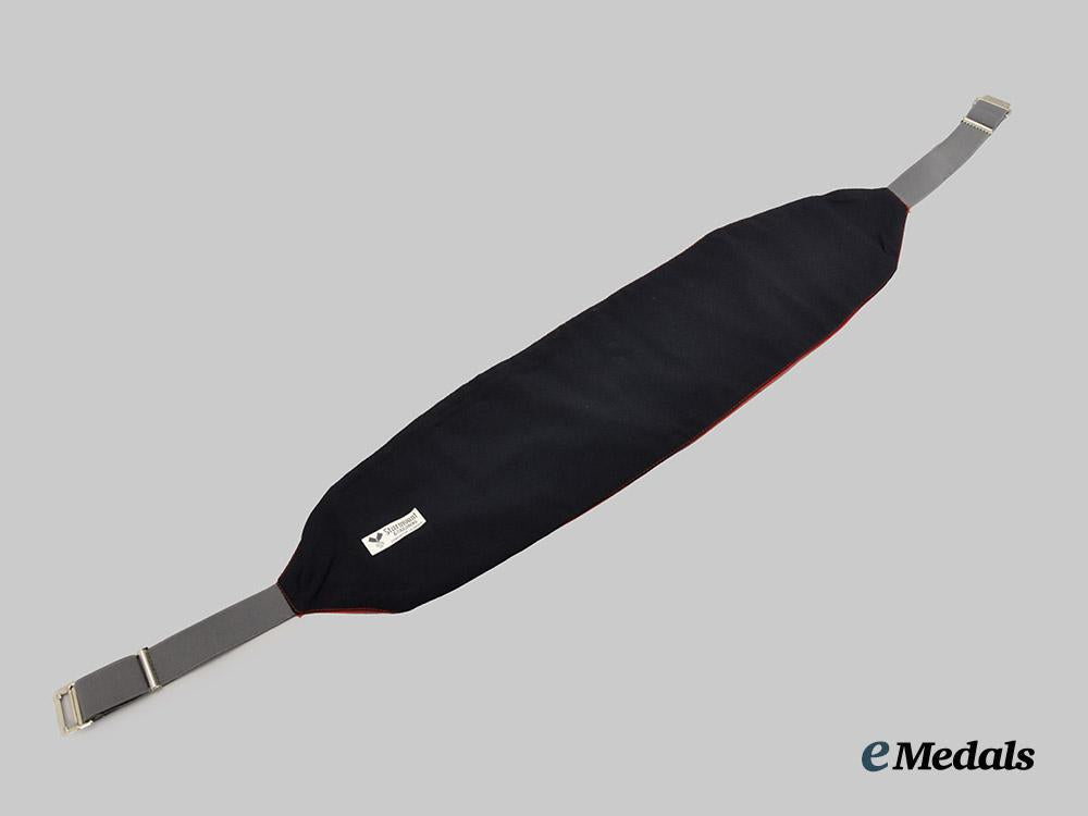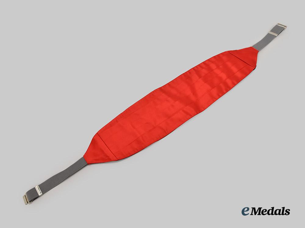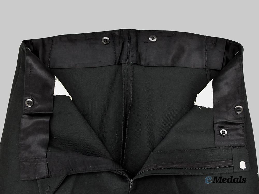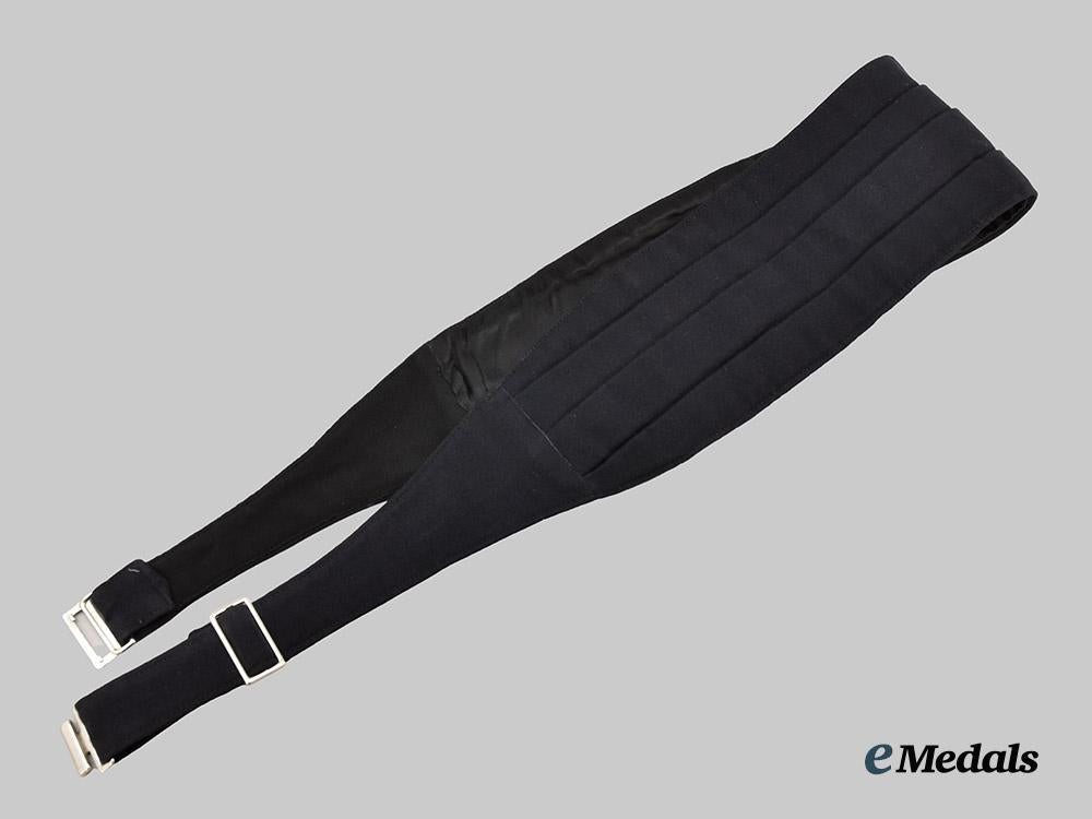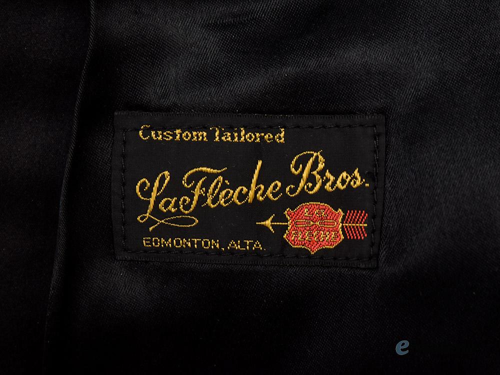 A Canadian Order of the Red Cross mess kit (dress uniform), consisting of a jacket constructed of black polyester. The lapels are flanked by embroidered Red Cross insignia, while the flaps close with gilded buttons affixed to a multi-link chain. The interior is fully encompassed by a multi-piece black liner, with the right flap retaining a tailor’s label for the Edmonton-based firm of LaFlèche Brothers, while an interior pocket retains a label bearing a typewritten owner’s name of “MR. J. BODDINGTON” (indicating issue to Captain Jack Boddington, a founding member of the Military Collectors Club of Canada who amassed a noted private collection of life-saving medals and awards), with a manufacture date of “JAN/77”. It measures approximately 44 cm across the shoulders, with an arm length of 58 cm, and an overall length of 58 cm (when folded on a flat surface). Accompanying the jacket are matching trousers, constructed of identical black polyester and retaining a matching tailor’s label and name tag within the interior. They measure approximately 50 cm across the waist, with an inseam of 34 cm, and an overall length of 104 cm. Also accompanying the uniform are a matching tie and belts. The jacket demonstrates minor and sporadic mothing and material fatigue, but this complete uniform to a noted figure in the militaria community remains in a near extremely fine condition.