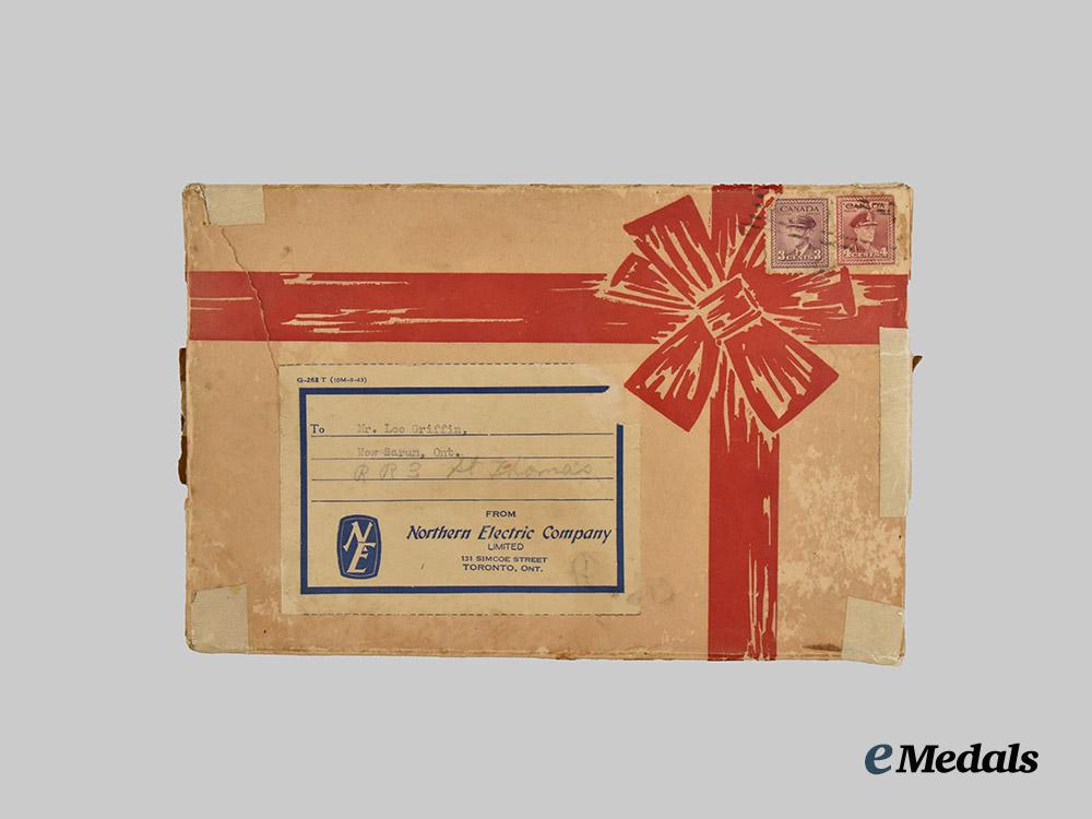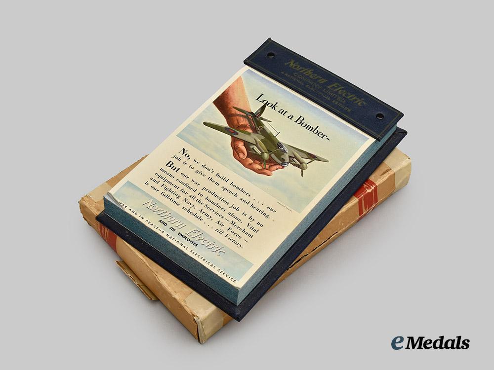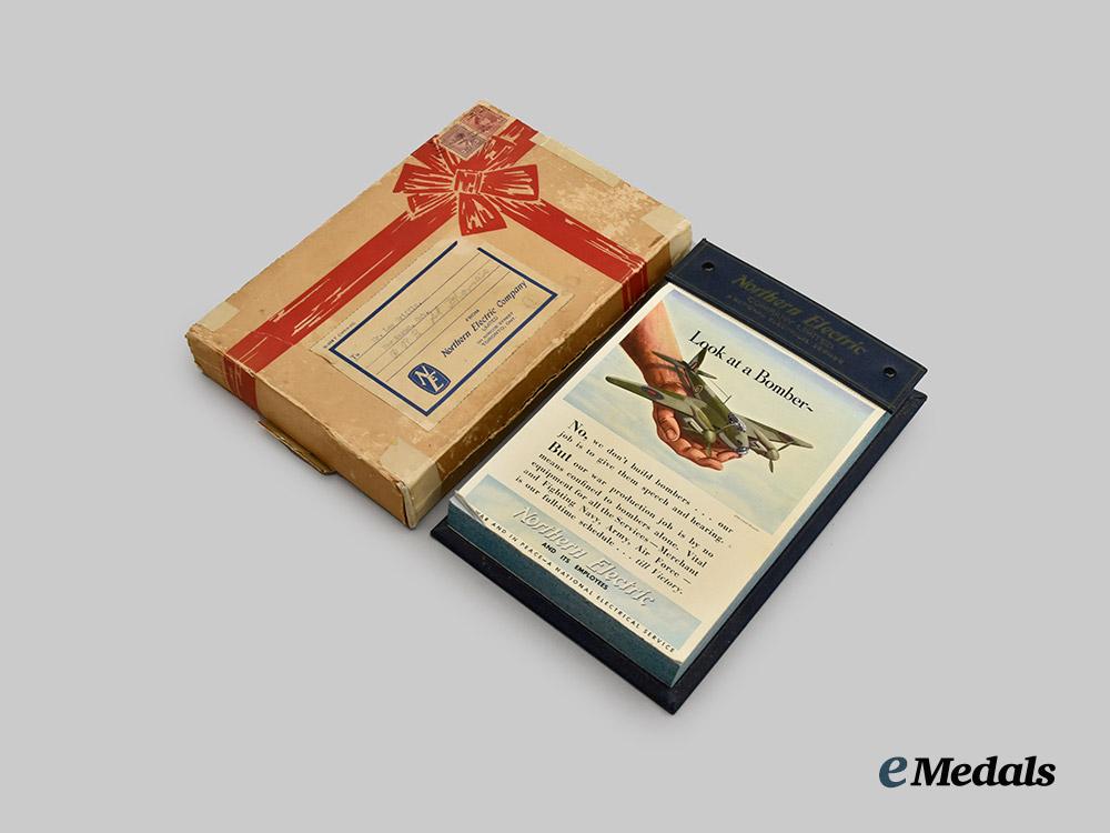 An unused 1944 tear-away calendar from the Northern Electric Company Limited, consisting of a stiff, wooden, backer with a dark blue faux leather exterior, along with a tear-away page for each day of the calendar year. Each page features a small print of the previous month, the current month, as well as the next month, along with the day and dates of each month. Each light blue paper page features the day of the month along with a daily schedule from 9:00AM to 5:00PM. The top page features an advertisement from the Northern Electric Co. Limited about their services to aid the war effort. The last three pages of the calendar provide a list of items the Northern Electric Company Limited was able to produce at the time, again, to help the war effort. It measures 140 mm (w) x 215 mm (l) x 30 mm (h) and is contained in its original shipping cardstock box addressed to Mr. Lee Griffin residing on New Sarum, Ontario, RR3, St. Thomas. It is decorated with a printed bow and features two stamps, a 3 cents stamp, and a 4 cents stamp, depicting King George VI.