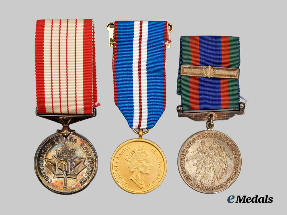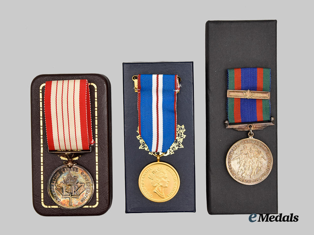 3. A cased Canadian Volunteer Service Medal (Médaille canadienne du volontaire). Instituted October 22nd, 1943. A round medal constructed of silver, suspended from a single-toe claw attached to the center of the award with a slotted bar, suspended from its period original multi-coloured ribbon featuring a maple leaf clasp for overseas service, the obverse depicting seven marching figures, inscribed with “1939 Canada 1945 Voluntary Service Volontaire”, the reverse depicting the stylized Coat of Arms of Canada, measuring 36.4 mm in diameter, weighing 38.72 grams, accompanied by its medal ribbon bar, constructed of a zinc core covered with the ribbon of the award, featuring a miniature maple leaf on the ribbon for overseas service, measuring 32.3 mm (w) x 12.3 mm (l), accompanied by its presentation box, constructed of black cardstock, the interior with a black foam insert for placement of the award, measuring 53 mm (w) x 150 mm (l), in overall near mint condition.