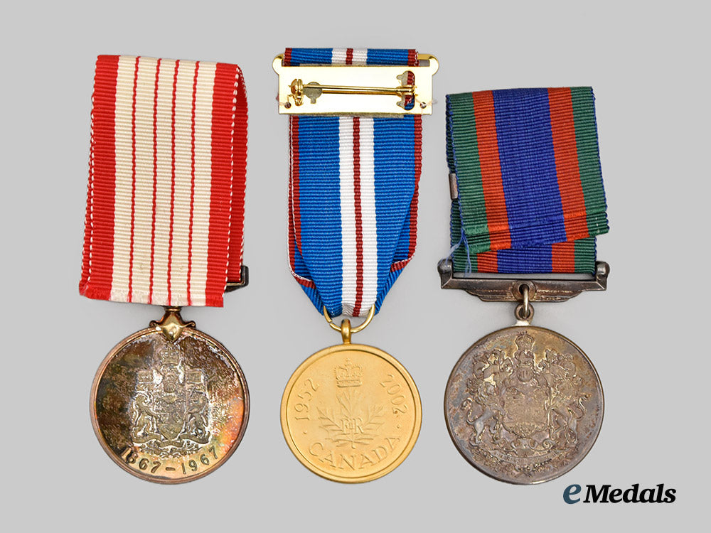 1. A cased Canadian Queen Elizabeth II Golden Jubilee Medal (Médaille du jubilé d’or de la Reine Elizabeth II). A round medal constructed of gold-plated bronze, suspended from a centrally mounted fixed loop and swivel ring for suspension from its period original ribbon featuring a horizontal pinback assembly, the obverse with a rightward facing effigy of Queen Elizabeth II wearing the King George IV State Diadem, circumscribed with “Queen of Canada - Reine du Canada” in capital letters, the reverse with a large crowned stylized maple leaf featuring the Royal Cypher in the centre, circumscribed “Canada - 1952-2002”, unmarked, measuring 32.3 mm in diameter, weighing 22.22 grams, accompanied by its presentation box, constructed of dark blue cardstock, the exterior of the lid embossed with a crowned Royal cypher along with a string of maple leaves and the number “50” in gilt, the interior with a recessed raised felt bed for placement of the award, measuring 54 mm (w) x 117 mm (l), in mint condition.