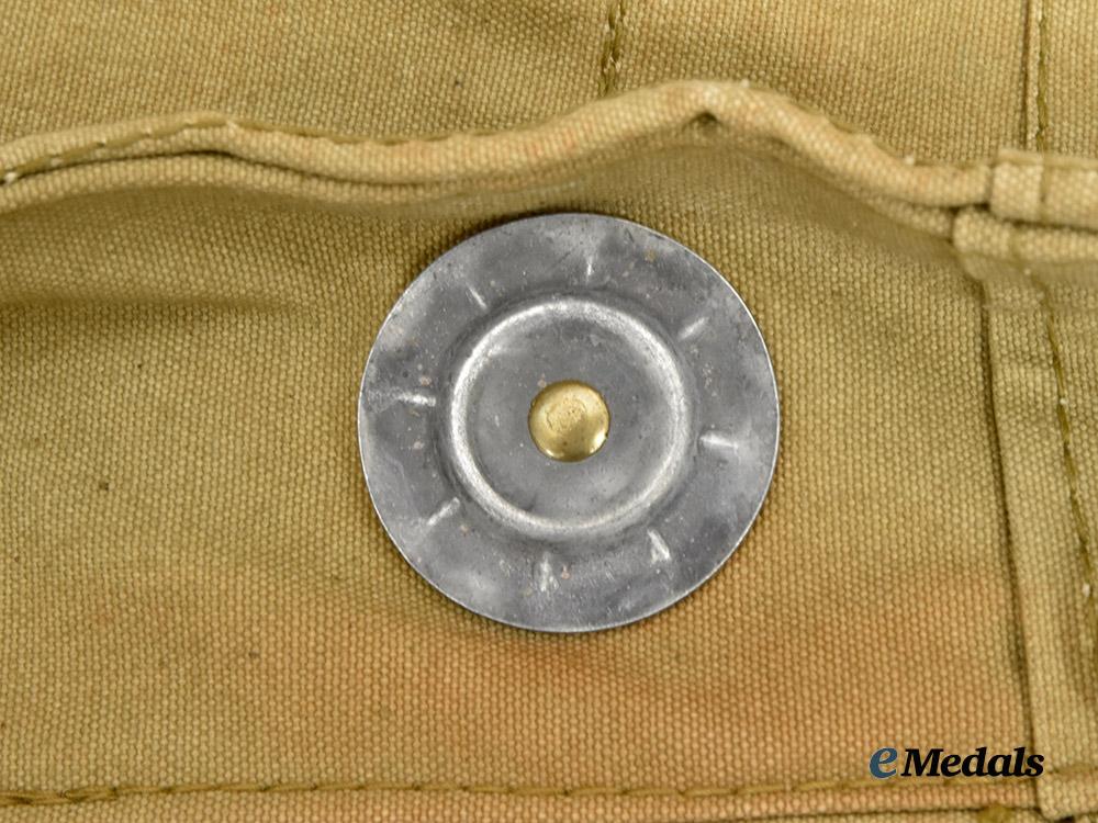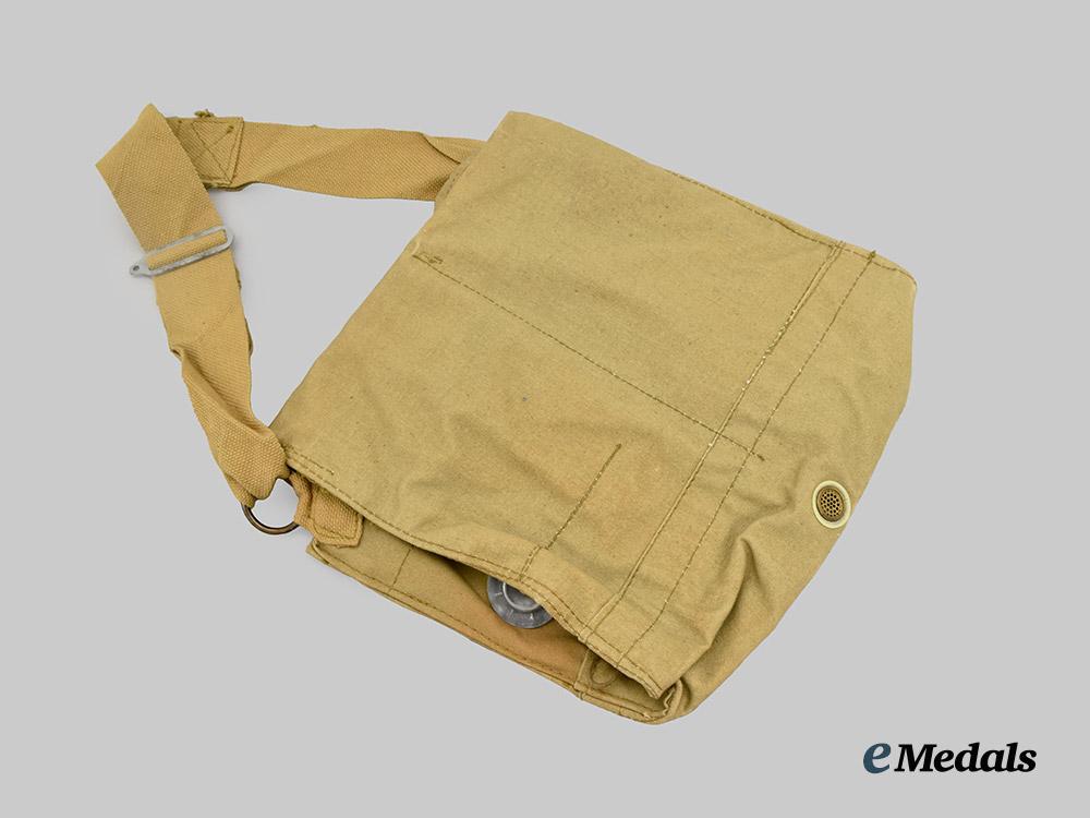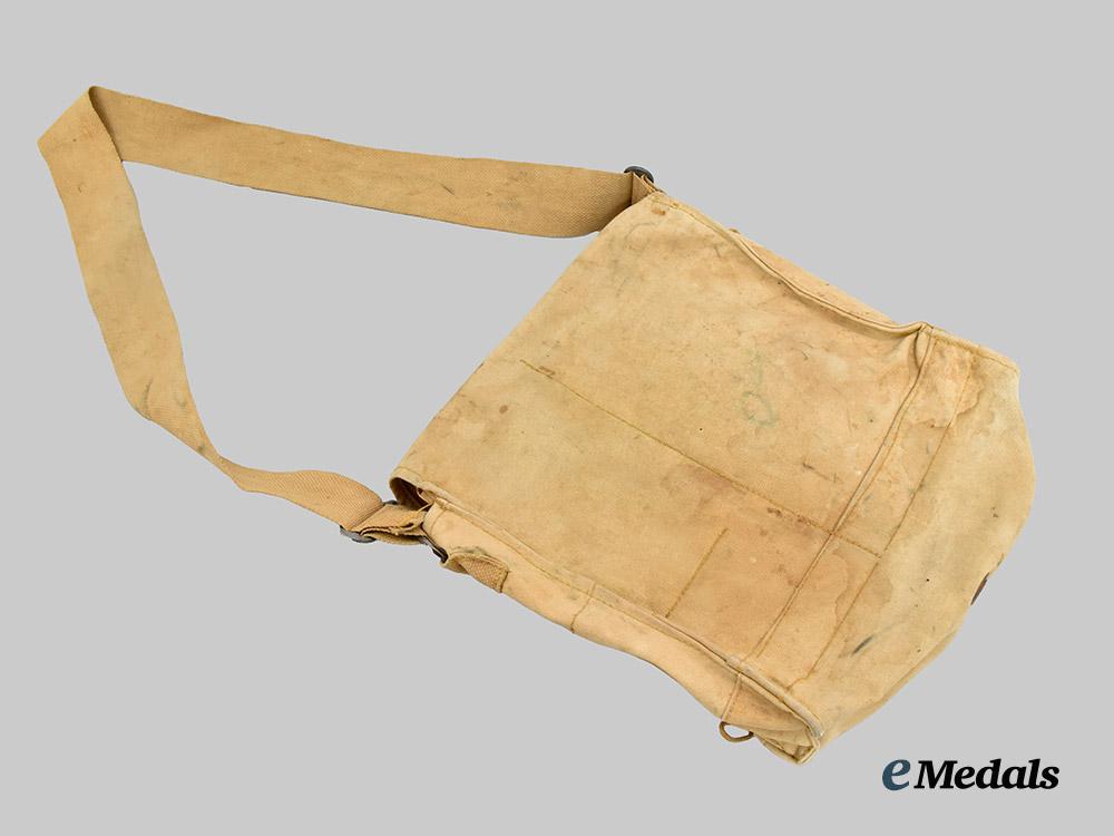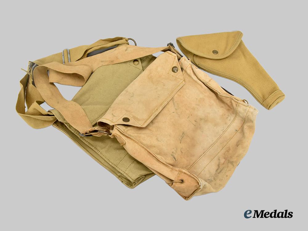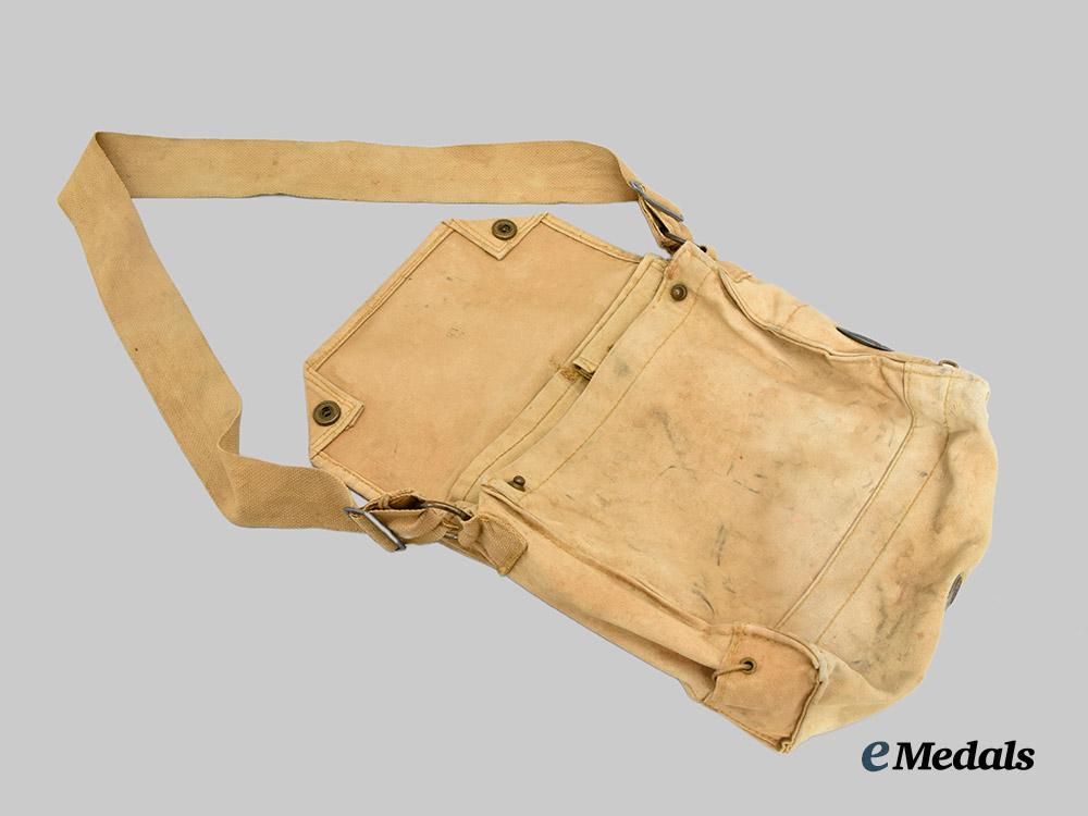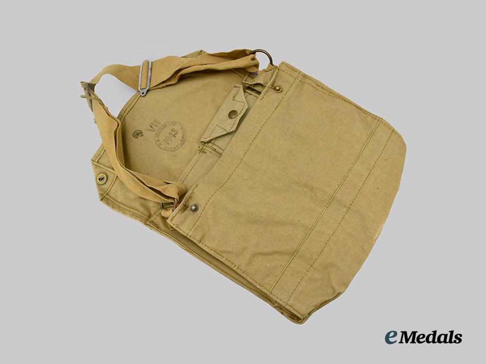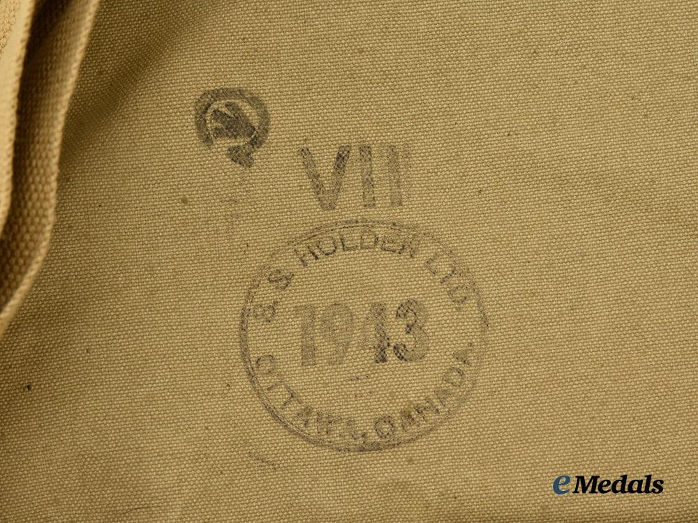 2. Satchel: in greenish-khaki cotton, with shoulder strap with dual snap closure, dividers inside with an additional smaller pocket, the underside of the flap stamped in black ink with the Canadian Broad Arrow Production Mark, the Roman numeral "VII" and the manufacturer's stamp within a circular frame "S. S. HOLDEN LTD. OTTAWA, ONTARIO" and dated "1943", and housing a Gauze Dressing Pack marked "Dressings, First Field, Mark III" with instructions of usage and marked "BAUER & BLACK Toronto, Ontario / Division of The Kendall Company (Canada) Limited / MADE IN CANADA / January, 1944" and the Canadian Broad Arrow Production Mark, light wear.