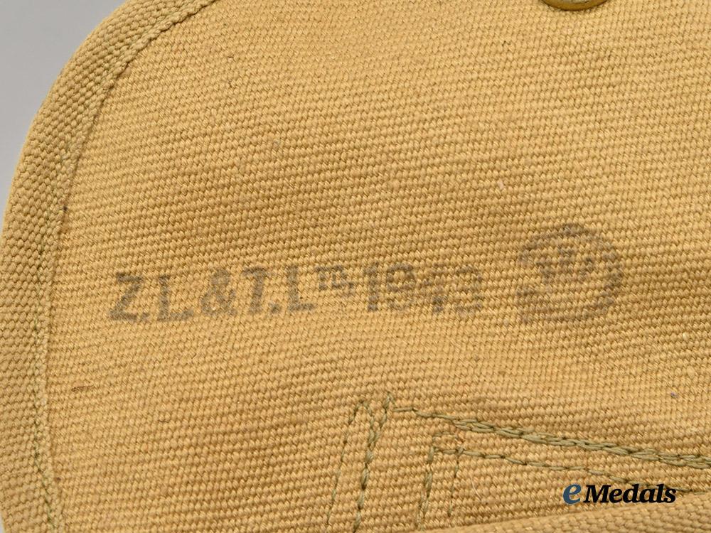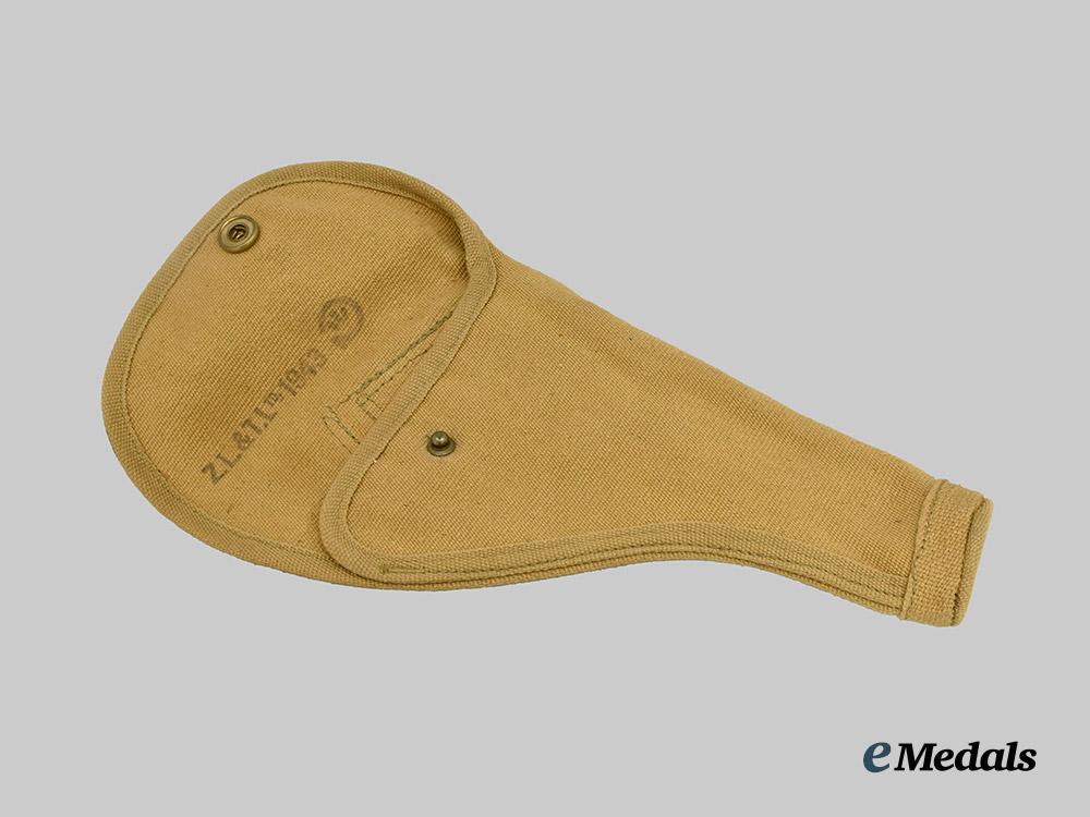 3. Holster: in thick khaki cotton, single snap closure, reverse incorporating a patch with three dual prong brass loops for belt attachment, the underside of the flap stamped in black ink with the Canadian Broad Arrow Production Mark beside the manufacturer's mark "Z.L. & T. Ltd. 1943", stamped "2045" in black ink on the underside of the holster sleeve, very clean.