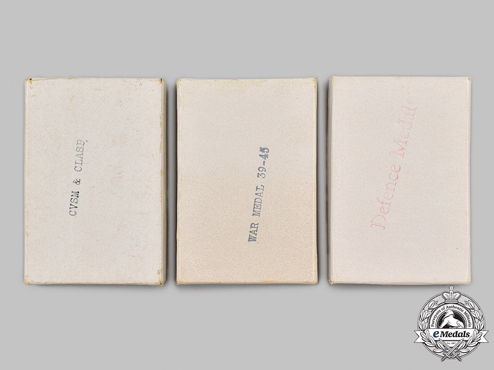 3. War Medal 1939-1945. All three in silver, the DM and WM measuring 36 mm in diameter, the CVSM measuring 36.5 mm in diameter, original ribbons, each in its stamped cardboard box of issue with tissue lining.