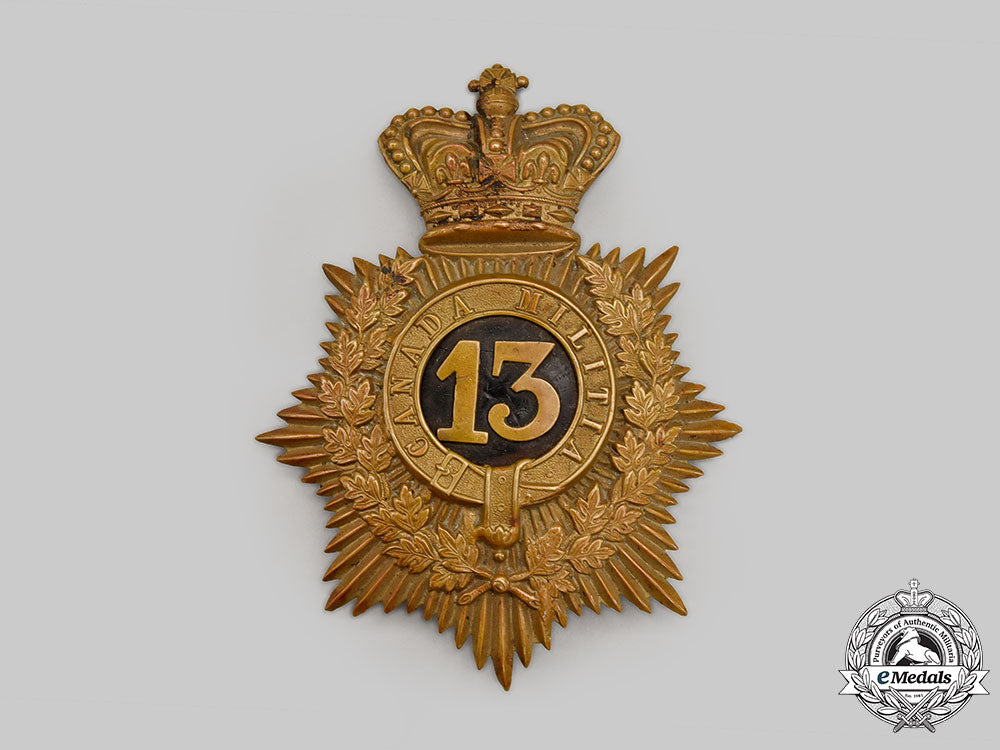 In die-stamped bronze, seven-pointed star-shaped base, centerpiece with the individual bronze numerals "1" and "3" placed upon a black leather backer, surrounded by the inscription "CANADA MILITIA", the centrepiece with a magnetic circular metal plate secured in place via a dab of solder and framed by an open-ended wreath of maple leaves, surmounted by the Victorian crown, measuring 98.7 mm (w) x 127.5 mm (h), both lugs intact, contact marks, crazing evident in the black leather backer, green oxidation spot evident on the reverse, near very fine.