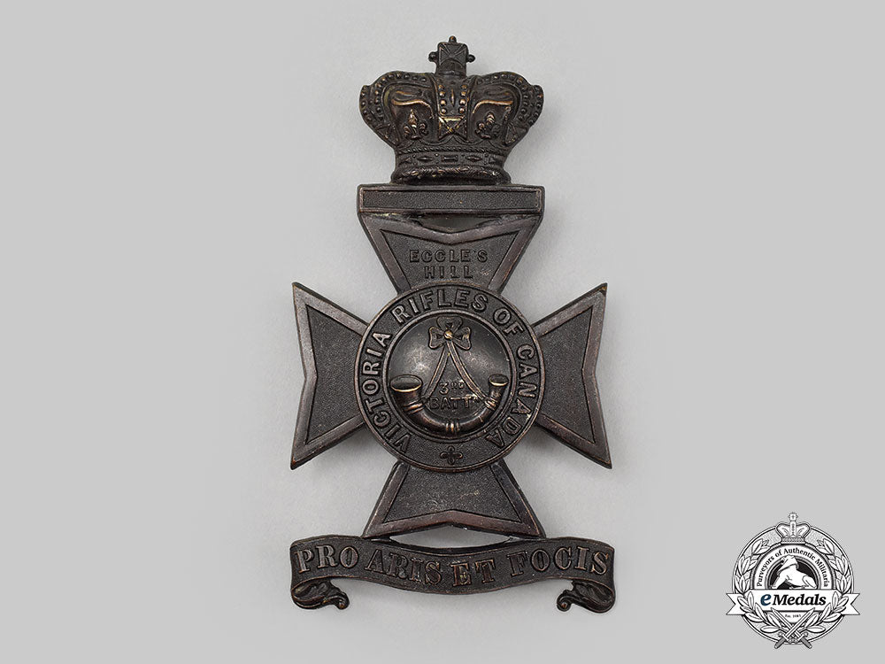 Footnote: The Victoria Rifles of Canada was an infantry regiment of the Canadian Army that originated in Montreal, Quebec, on January 22, 1862, as The 3rd Battalion, Volunteer Militia Rifles Canada. The regiment went through several changes of designation throughout its history. It was re-designated as the 3rd Battalion, The Victoria Volunteer Rifles of Montreal on July 18, 1862; as the 3rd Battalion, Victoria Rifles of Canada on December 5, 1879; as the 3rd Regiment, Victoria Rifles of Canada on May 8, 1900; as The Victoria Rifles of Canada on March 29, 1920; as Victoria Rifles of Canada on November 15, 1934; as the 2nd (Reserve) Battalion, Victoria Rifles of Canada on November 7, 1941; and finally Victoria Rifles of Canada on June 1, 1945. It was reduced to nil strength and transferred to the Supplementary Order of Battle on March 5, 1965. The design of this badge is illustrated on page 63 of "Canadian Militia Badges Pre 1914" by Daniel Mazeas (SBP.80.).