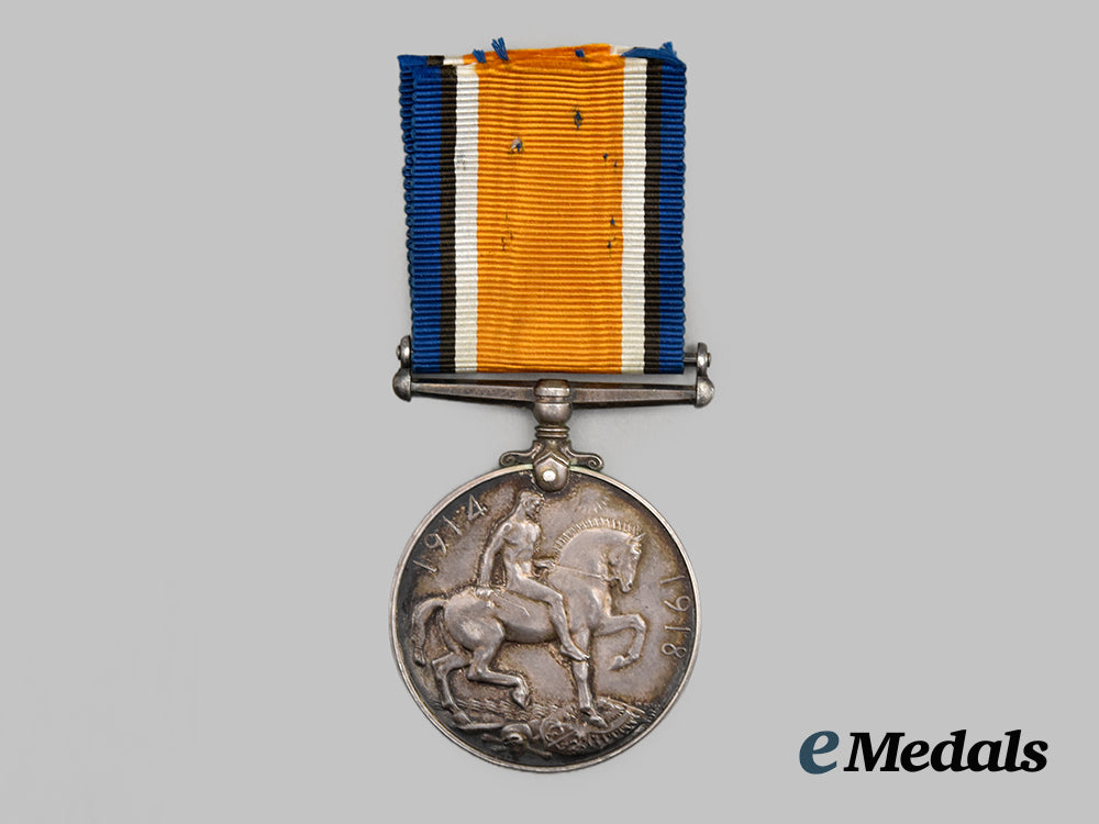 1. A British War Medal, constructed of silver, on loop for suspension from its period original ribbon, the obverse bearing a raised and leftward-facing profile of King George V, circumscribed by name and title in Latin, the reverse bearing a raised depiction of St. George mounted on a horse, circumscribed by dates “1914-1918”, topped by a non-swivel suspension, the edge impressed “148374” and “PTE. A. ROUSSIN. 78-CAN. INF.”, measuring 36.35 mm in diameter, weighing 34.1 grams, demonstrating a consistent patina and minor edge nicks, in near extremely fine condition.