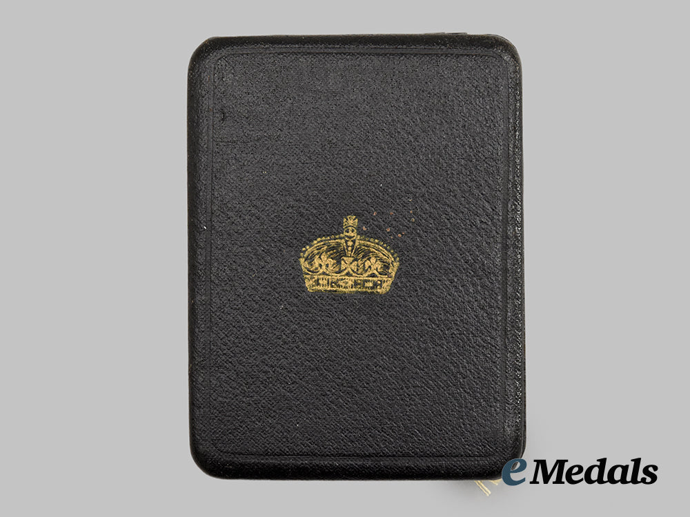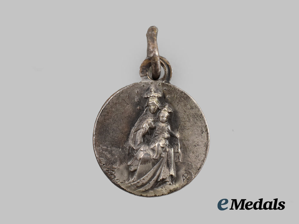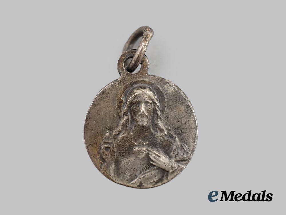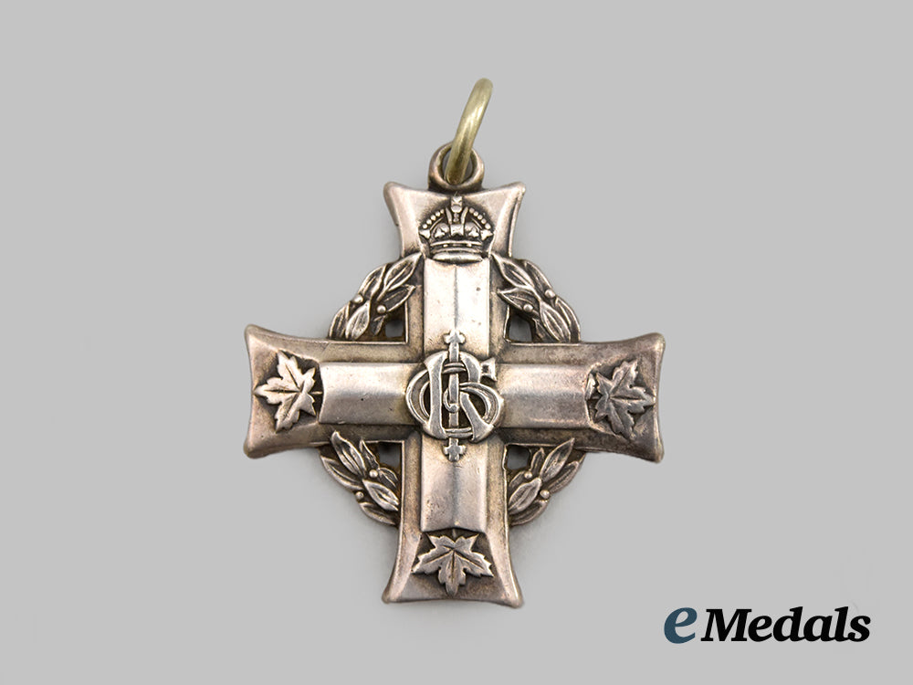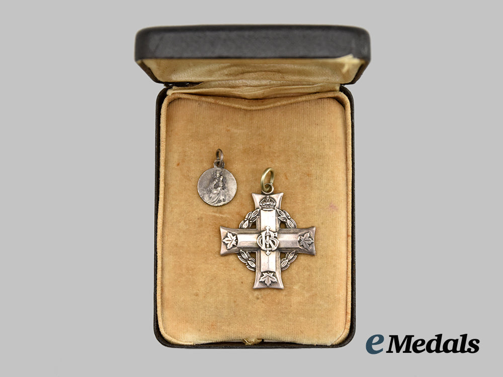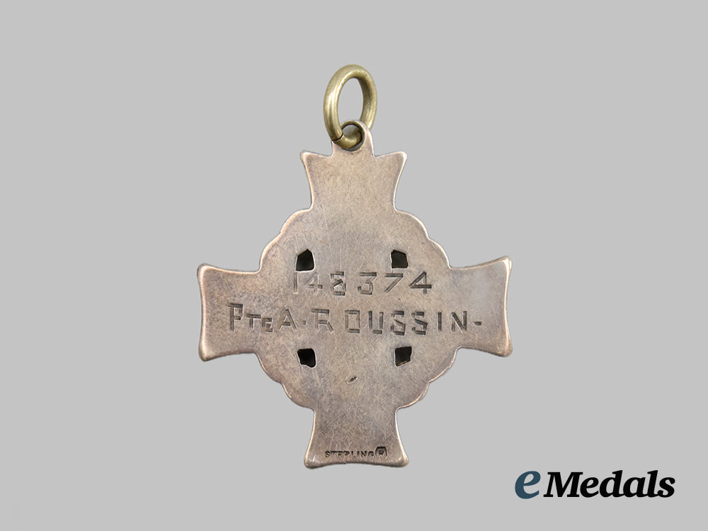 2. A Memorial Cross, constructed of silver, consisting of a Greek Cross with its arms joined through the quadrants by a circular laurel leaf wreath, the obverse overlaid by an additional cross completing at the three, six, and nine o’clock arms in maple leaves and at the twelve o’clock arm in a royal crown, bearing a central royal monogram, topped by an integral loop and suspension ring, the reverse bearing engraved inscriptions of “148374” and “PTE. A. ROUSSIN”, also marked “STERLING”, measuring 31.50 mm (w) x 34.87 mm (h), weighing 12.8 grams, accompanied by its original presentation case, constructed of a wooden frame with a faux black leather exterior liner, the lid bearing a gilt royal crown, the interior with a white satin lid liner and intact hinge cover, with a plain white velvet medal bed, unmarked, measuring 65 mm (w) x 85 mm (l) x 20 mm (h), also accommodating a small Catholic devotional medal, constructed of silver, one side depicting a raised image of the Sacred Heart of Jesus, the reverse depicting the Madonna and Christ Child, unmarked, measuring 12.95 mm in diameter, the Memorial Cross demonstrating some surface scratching and is missing its ribbon, the interior of the presentation case demonstrates moderate soiling and material fatigue to both the lid liner and medal bed, and the Catholic medal is missing its suspension device, in overall near extremely fine condition.
