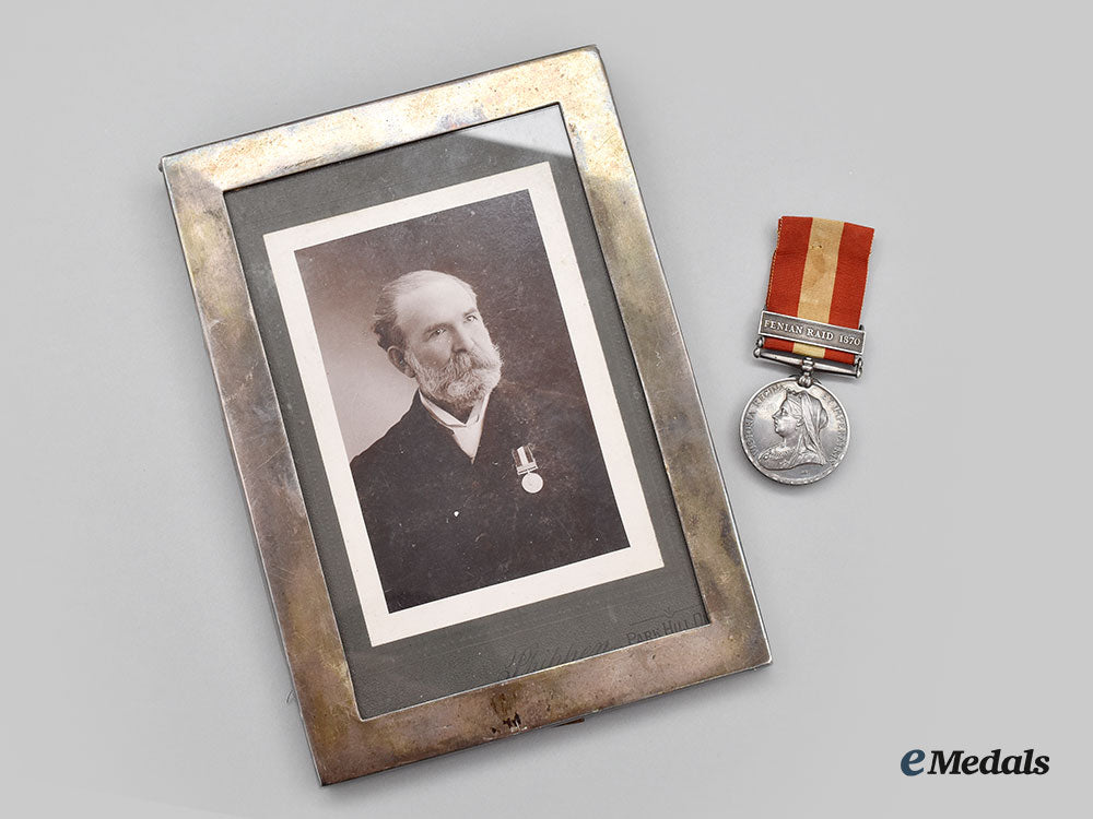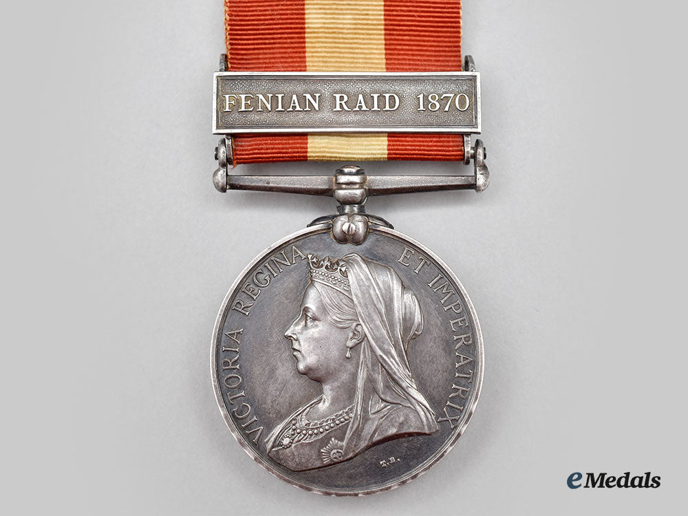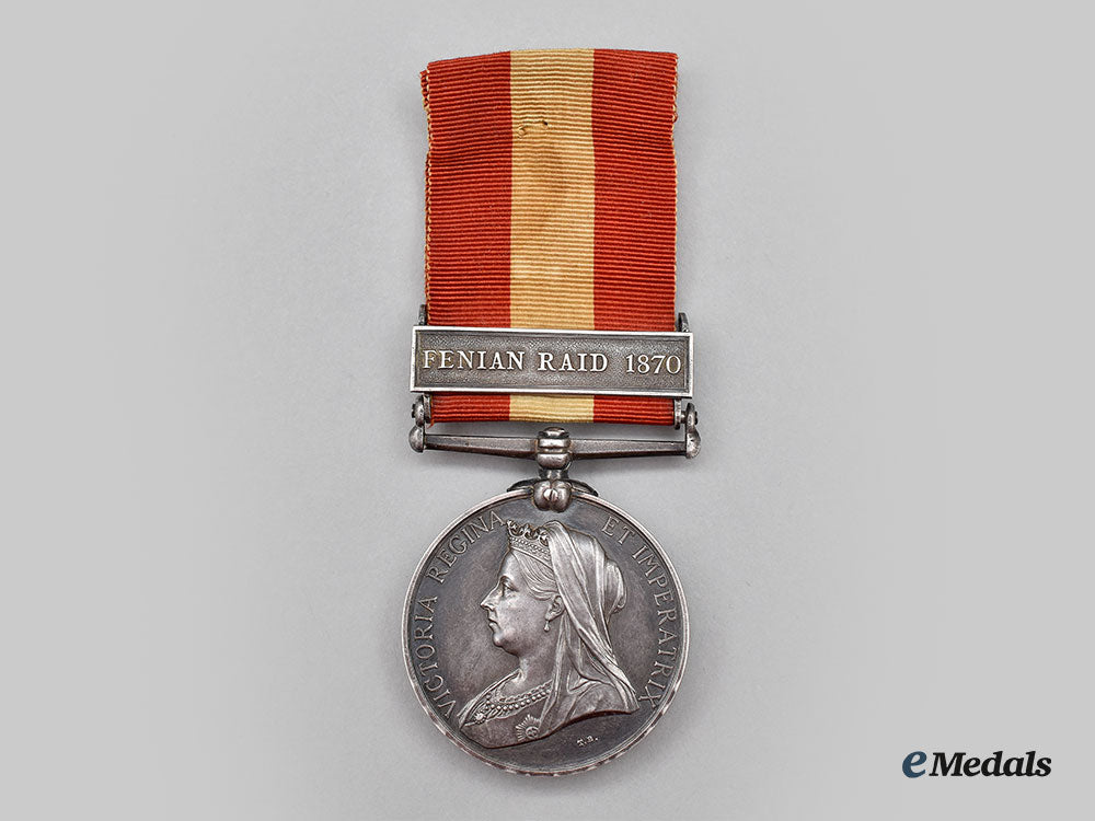 Instituted January 1 1899. In silver, full size, rim impressed Sgt. Maj. J. Richards G.T.R, worn on original ribbon with FENIAN RAID 1870 clasp, dark patina, light wear, in extremely fine condition.