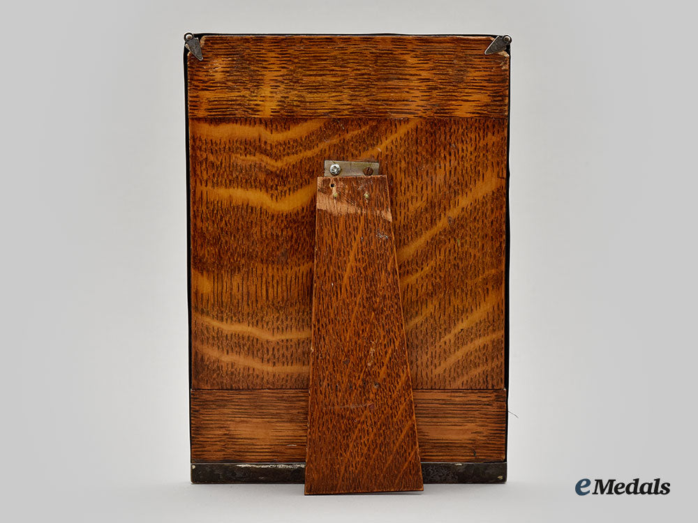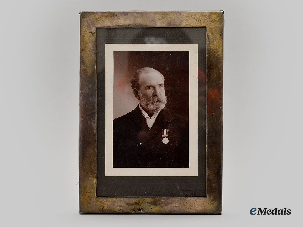 Accompanied by a black and white portrait of Sgt. Major Richards wearing the medal, contained in a silver frame with wood reverse plate, measures 155mm (w) x 218mm (h) x 13mm (d), silver hallmarks on the side of the frame denoting S. Blanckanesee & Sons Ltd of Chester, sterling silver, city marks for Chester, and date mark of 1912, panel buckling on reverse at edges, replacement screws in stand, dark patina, scratches and dents to obverse, dark patina in very fine condition.