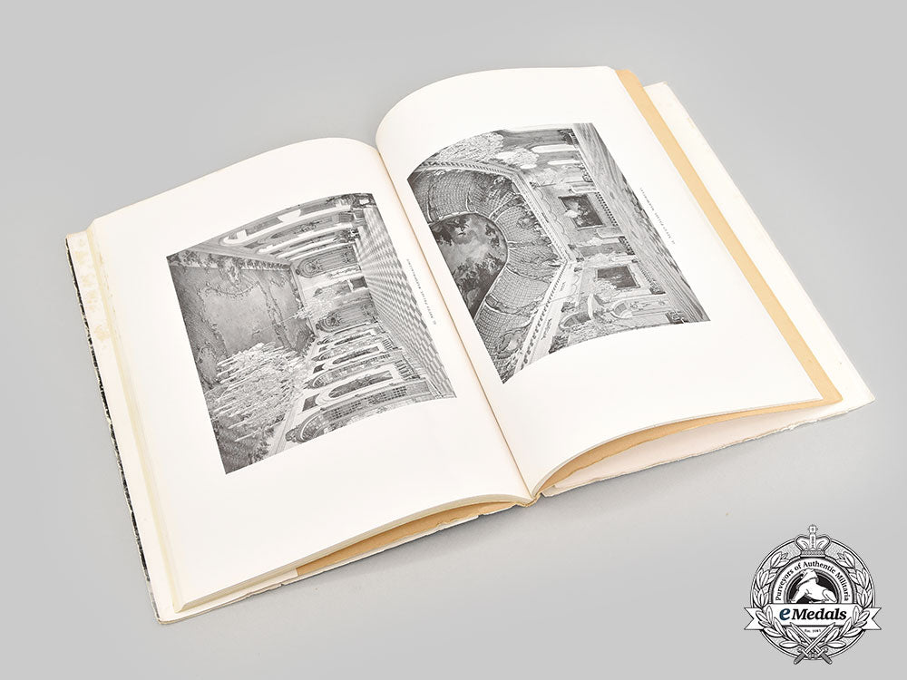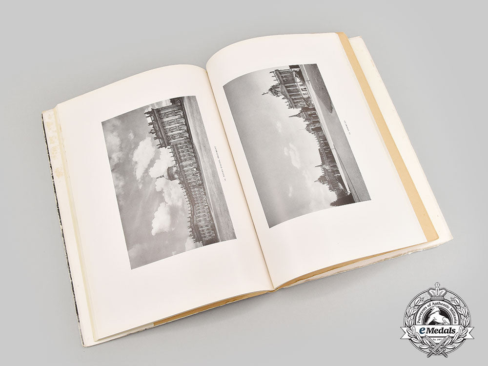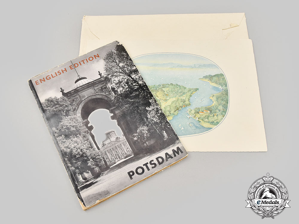 2. An English-language edition of “Potsdam”, constructed of a paper stock binding with 36 paginated pages of text interspersed with black-and-white illustrations, supplemented by an array of black-and-white images of attractions and points of interest in Potsdam, each accompanied by detailed descriptions, the interior notably bearing Hilda Cameron’s handwritten name in black ink, published in 1936 by Deutscher Kunstverlag, measuring 18 cm (w) x 25.5 cm (h), with minor material fatigue evident to the binding, a personalized memento in very fine condition.