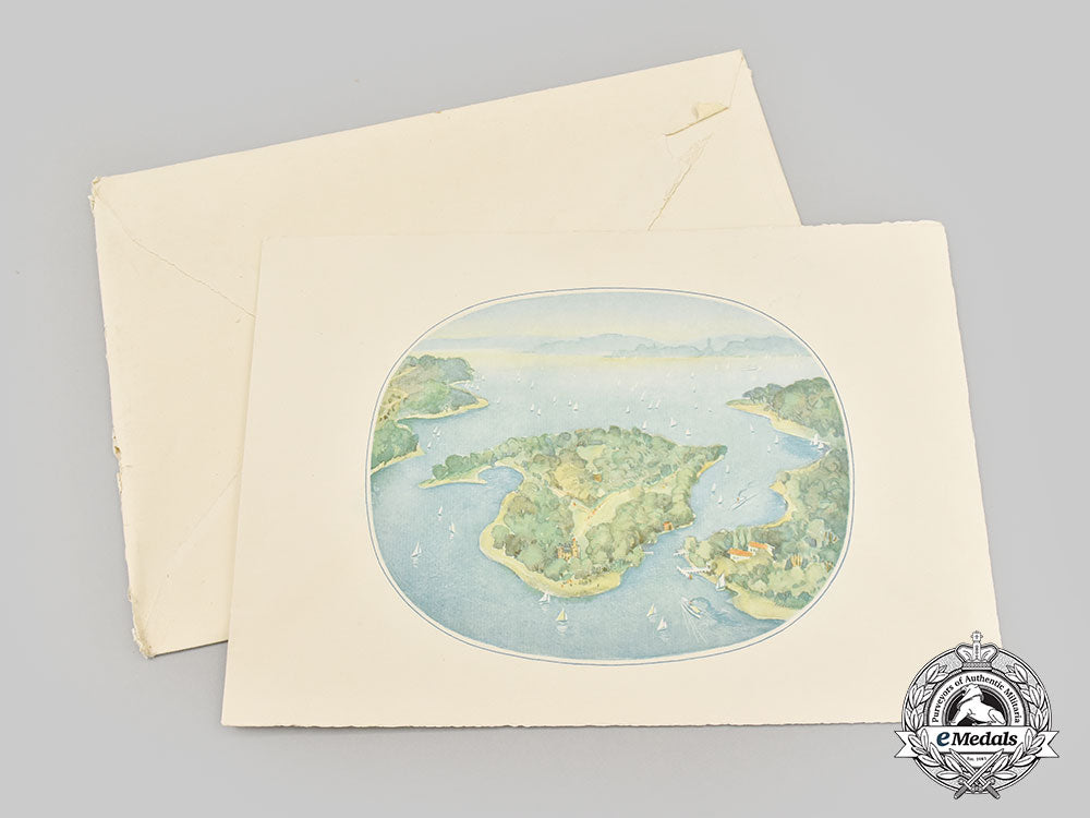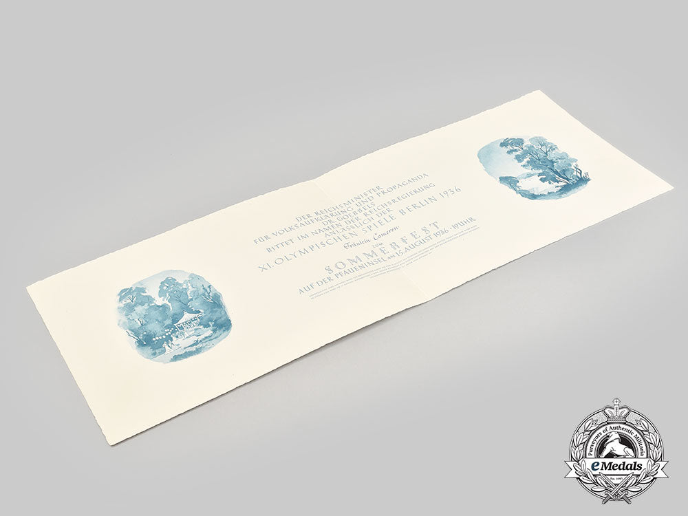 1. An invitation to attend a party for participants and officials on Peacock Island in Berlin, scheduled for 15 August 1936, constructed of cream-coloured card stock, the cover bearing a full-colour ink depiction of the island, opening to reveal a blue ink invitation to “FRÄULEIN CAMERON” from Reichsminister Dr. Joseph Goebbels, measuring 31.5 cm (w) x 22 cm (h), concealed within its original card stock envelope, in overall extremely fine condition.