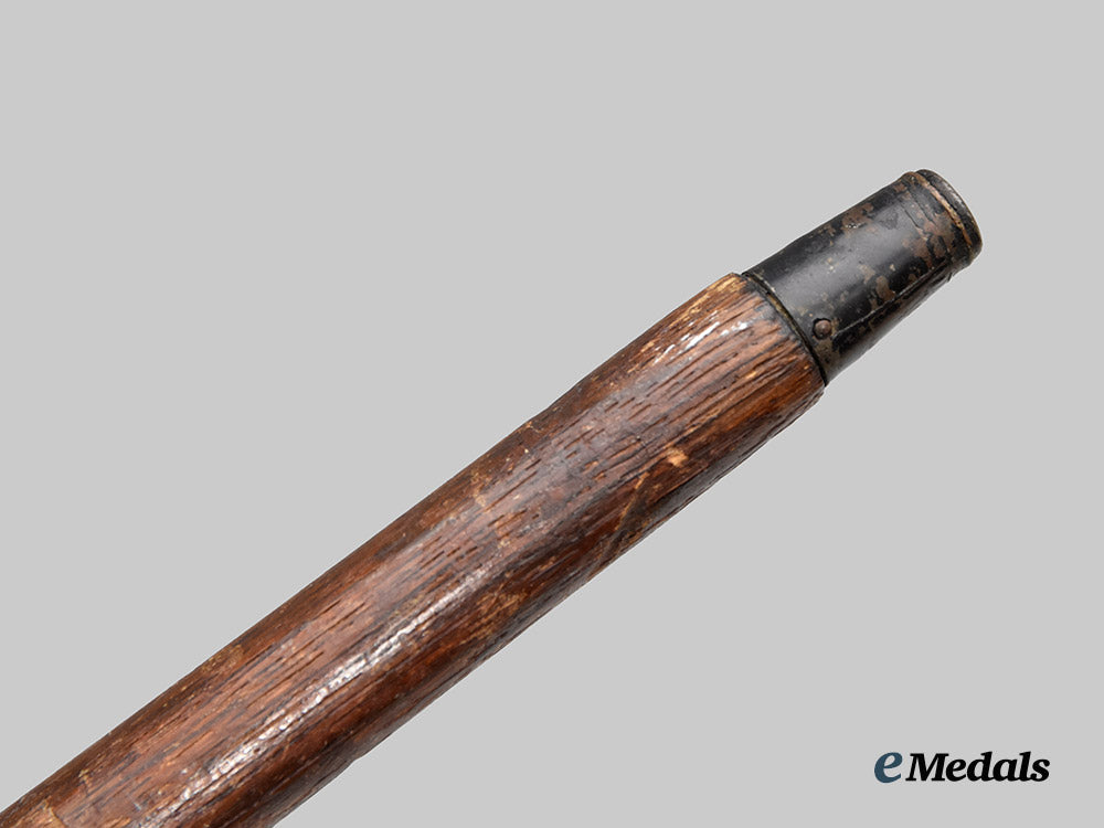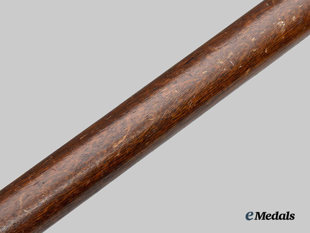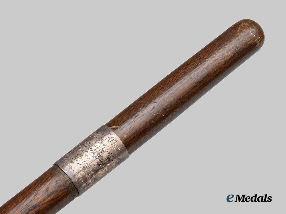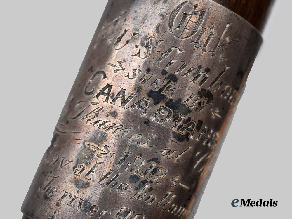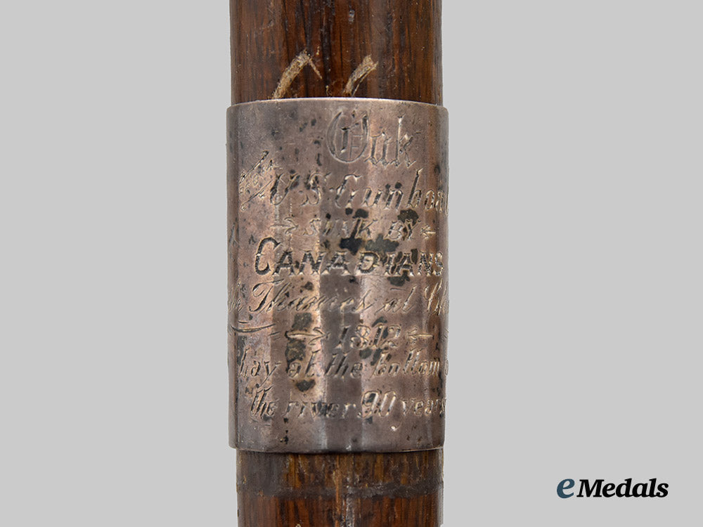 Constructed of oak from a U.S gunboat sunk during the war of 1812, measuring 93 cm in length, engraved in silver OAK FROM U.S GUNBOAT SUNK BY CANADIANS IN THE THAMES AT CHATHAM 1812 LAY AT THE BOTTOM OF THE RIVER 90 YEARS, evidence of wear and age including scratches and dents, otherwise, in extremely fine condition. Accompanied by a leaflet for veterans of the War of 1812-1815, asking them to appear at the St. Catharines Townhall to prove service in the war and subsequently receive a paid sum of twenty dollars.