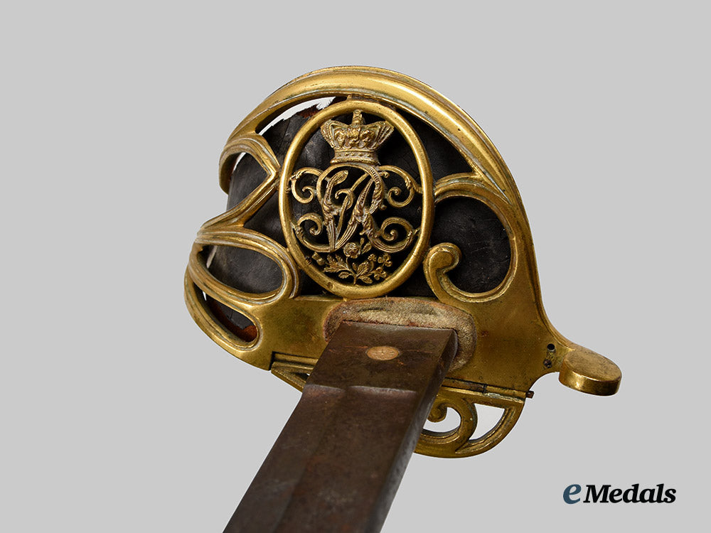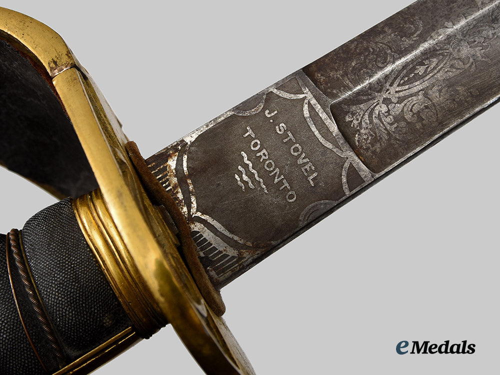 This sword features a darkened steel blade, magnetic, with a semi-sharp tip. Both sides of the blade have a fuller running from the mid-point to just above the ricasso and incorporates an ornate floral pattern. The obverse ricasso bears a brass proofmark disk inscribed "PROVED", the mark centred within an eight-pointed leaf, while the reverse ricasso is maker marked "J. STOVEL TORONTO". It exhibits age darkening, as well as surface wear overall, along with traces of rust, measuring 820 mm in length. The blade is embedded into the hilt and is firm to it, with a thin oval light brown leather washer surrounding the blade and resting upon the guard. The guard is in brass, emblazoned with the monogram of Queen Victoria (VR) within a large oval, the monogram surmounted by the Victorian crown, with a cluster of leafing below. It incorporates a voided design, with a black-finished leather insert placed on the underside of the guard against the voided areas, to protect the user's hand. The guard incorporates a circular thumb quillon on the main voided portion, along with a drop-down voided panel on the opposite portion of the guard. The brass ferrule butts the guard, the adjoining grip consisting of a wide brass spine with a large oak leaf appearing near the pommel, the grip itself a simulated fish skin style and incorporates seven seven strands of copper wire in the recessed areas, each of which consists of a single row of rolled wire flanked by a single straight wire on either side. The grip is finished with a pommel that is topped by a prominent bronze button, the entire sword inclusive of its blade and handle measuring 945 mm in length. It exhibits slight fraying on the black-finished leather insert, one of the single copper wires is slightly out of position on the grip near the ferrule, however, the remaining copper wires are intact, with spotting, contact marks and wear present on the brass handle. Fine.