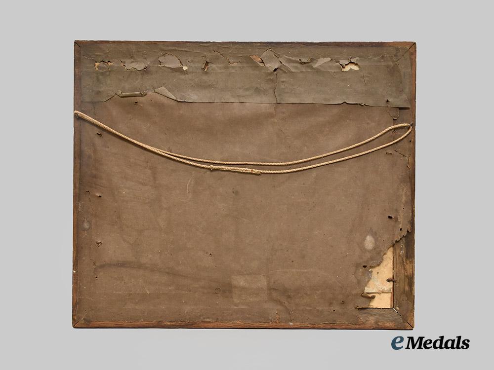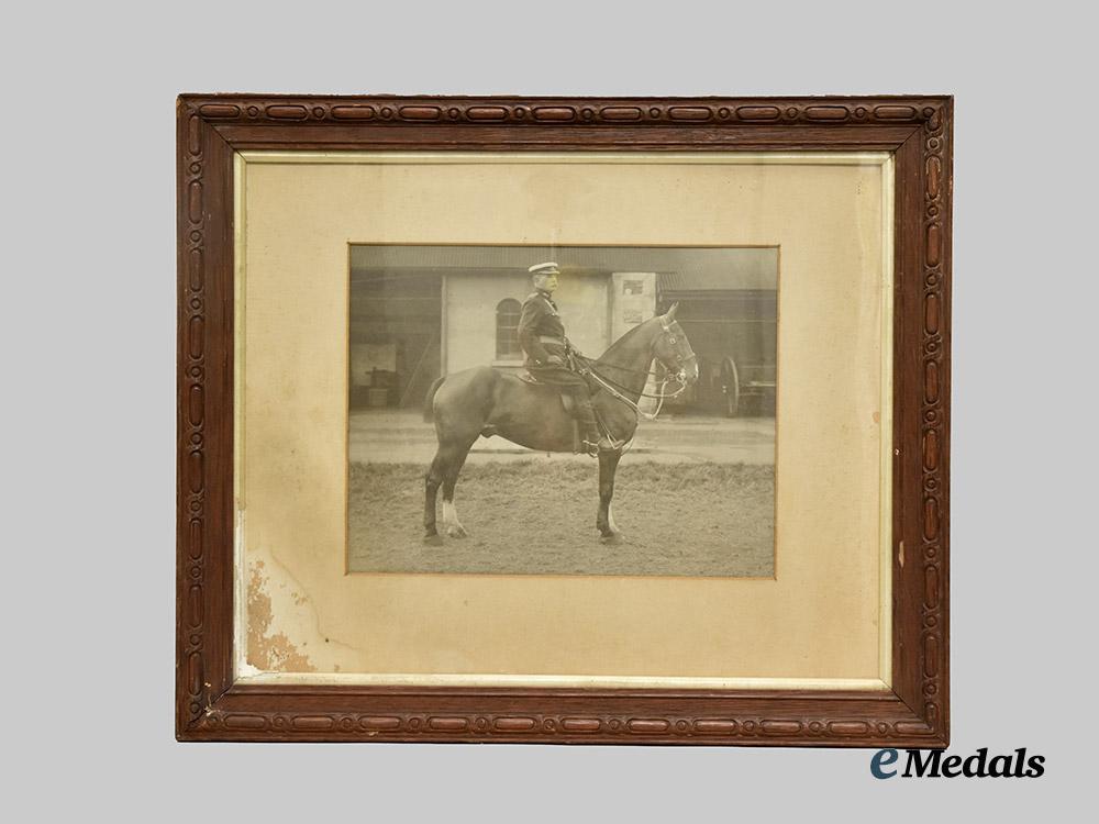 Photograph in black and white, illustrating an Artillery Officer on horseback facing right, on a grass surface, with a stable housing a cart in the background, the image area measuring 275 mm (w) x 212 mm (h), the photograph matted and placed with a wooden frame with decorative motif, the frame measuring 295 mm (w) x 415 mm (h), with a black paper backer, incorporating a dual strand cord fed through metal loops on either side for wall hanging, the matte having experienced light soiling and wear, the photograph unaffected, the black paper backer with fraying evident in one corner and exposes the wooden framework, very fine.