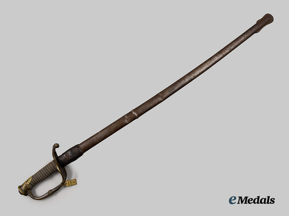 This sword features a steel blade, magnetic, with a very sharp tip. Both sides of the blade have a fuller running from the mid-point to just above the ricasso and incorporates an ornate floral pattern. The obverse ricasso bears a brass proofmark disk inscribed "PROVED", while the reverse ricasso is maker marked "STOHWASSER & WINTER / CONDUIT ST. LONDON". The obverse is marked with the Victorian crown framed by the aforementioned floral pattern, while the reverse illustrates a beaver with "CANADA" above and "RIFLES" below framed by the floral pattern. The blade exhibits fading of the ornate floral pattern and the accompanying marks, with slight denting and surface wear visible at the tip, however, the blade itself remains clean and free of rust, measuring 820 mm in length. The blade is embedded into the hilt and is firm to it. The guard is in brass, decorated in floral motifs on the upward-facing quillon and adjoining upper edges of the guard, along with incorporating a voided design on one side. The grip itself is a simulated grayish fish skin style and incorporates thirteen single strands of twisted brass wire in the recessed areas. The handle has a floral band at its mid-point, with a brass museum tag inscribed "20-246 B" attached via a wire wrap to the handle, the cap bearing the pommel with a flowing leafing pattern that rises to a point on the spine and is finished with a prominent oval button, the entire sword inclusive of its blade and handle measuring 965 mm in length. The accompanying sword is housed in its original steel scabbard, inscribed "Presented to Ensign McBride by the Non Commissioned Officers & Men of the Guelph Garrison Artillery Guelph Novembe[r] 1866", with a black-finished leather wrap forming the locket, the throat opening without a guard, the body incorporating one band one-third of the way down from the throat, along with a flattened u-shaped chape. It exhibits multiple dents, contact marks and surface wear from active use, plus rust especially on the chape, the scabbard measuring 830 in length. In fine condition.