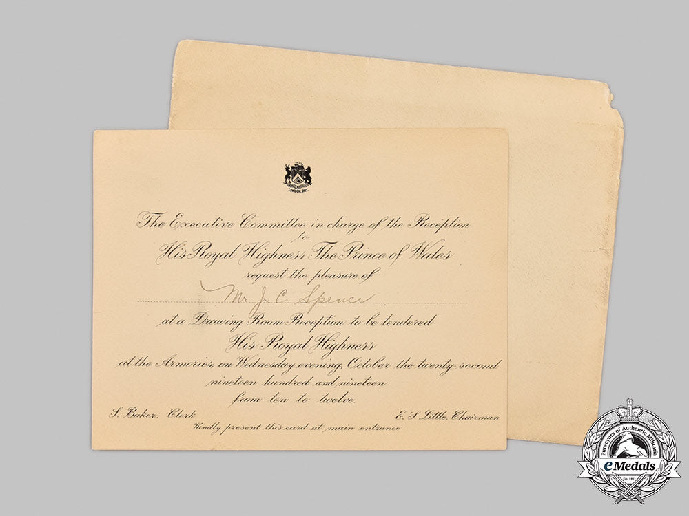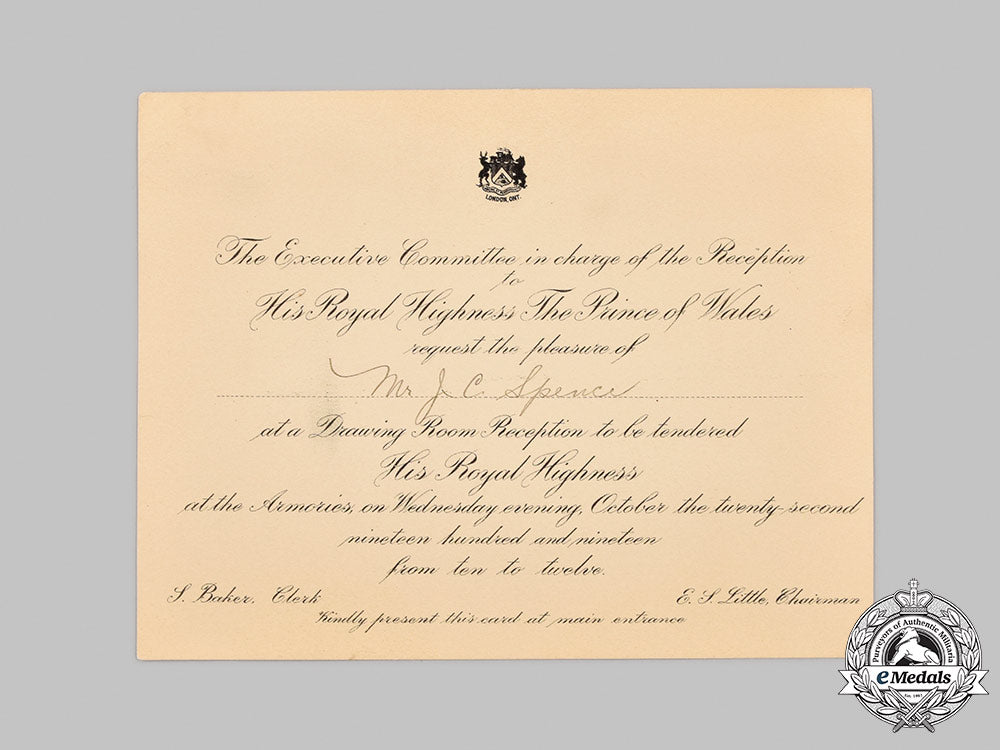 Printed in black ink on a light beige card stock, with the name of the recipient in black pen ink, bearing the coat-of-arms on the City of London, Ontario at the top, followed by the text in running script "The Executive Committee in charge of the Reception to His Highness The Prince of Wales request the pleasure of Mr. J.C. Spence at a Drawing Room Reception to be tendered His Royal Highness at the Armories on Wednesday evening, October the twenty-second, nineteen hundred and nineteen from ten to twelve / S. Baker Clerk / E.S. Little Chairman / Kindly present this card at main entrance", measuring 173 mm (w) x 134 mm (h), accompanied by its original lightly soiled and torn envelope. Small smudge across the word "Drawing" on the , otherwise, near extremely fine.