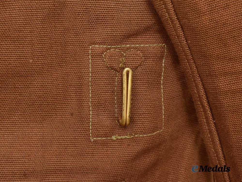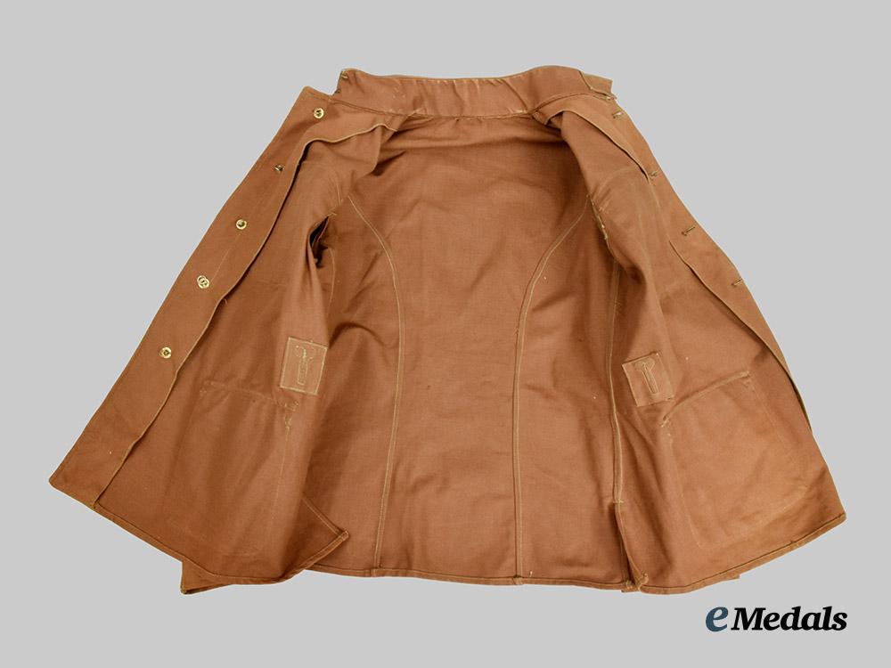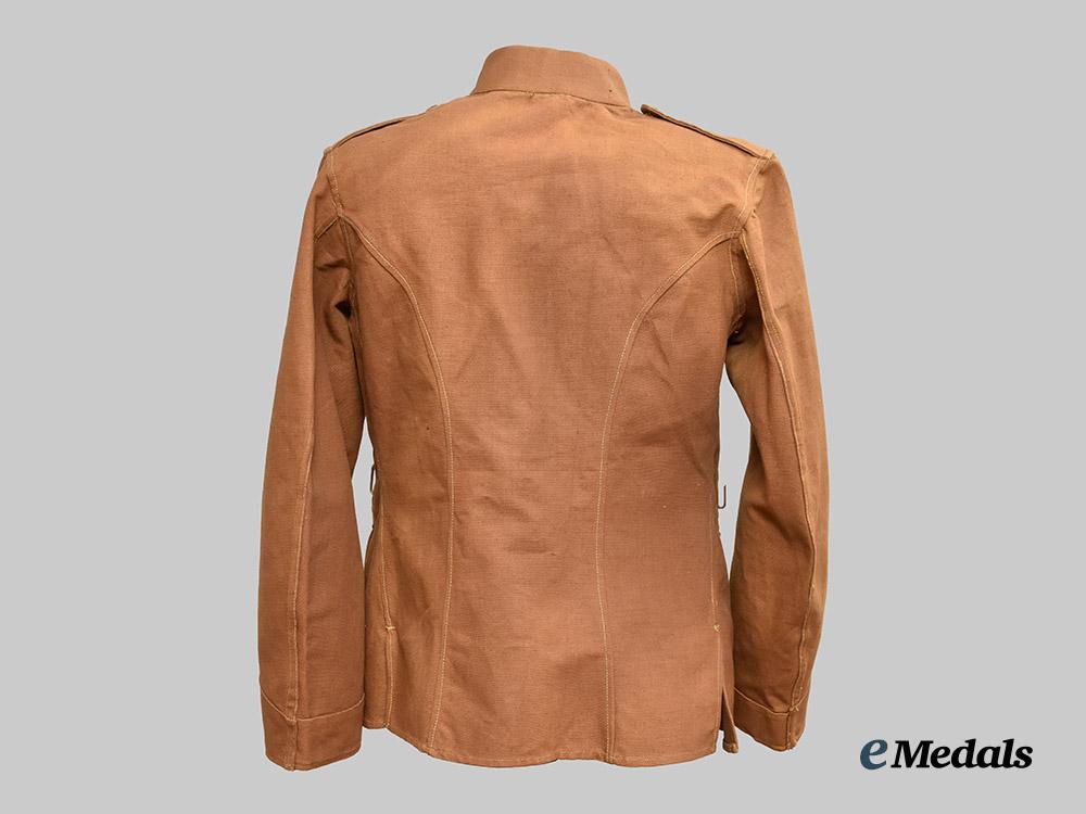 Introduced in 1917 to align with the style of functionality of military dress prevalent at the time, the khaki duck field service jacket was primarily worn in warmer months from its introduction into the 1920's. Manufactured in a heavy, durable reddish brown khaki, it features four front pockets with the bottom pockets with lightly scalloped flaps and issued without buttons. The upper pockets are pleated and sealed with brass, unmarked kings crown RNWMP buttons, sewn in place. The jacket is in the 5 button style with brass belt loops. Shoulder straps are secured by two general service buttons. Interior is plan with no liner, however does exhibit, stitched in manufacturers tag, shoulder width of 44 cm, sleeve inseam length of 45 cm, 70 cm in total length, with signs of very light period wear, a rarely seen jacket, extremely fine.