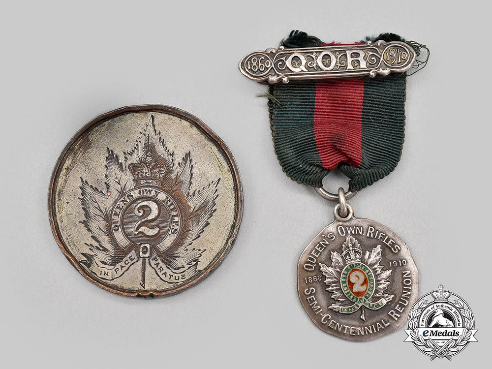 1. Queen's Own Rifles Semi-Centennial Reunion Medal 1860-1910: in sterling silver with red and green enamels, obverse illustrating the Queen's Own Rifles regimental insignia flanked by the dates "1860" and "1910", surrounded by the inscription "QUEEN'S OWN RIFLES SEMI-CENTENNIAL REUNION", reverse hallmarked with an "R" fronting a maple leaf within an octagonal frame (P.W. Ellis & Company of Toronto) and marked "STERLING", measuring 27.7 mm (w) x 31.8 mm (h) inclusive of its integral ring, on its original ribbon with pinback hanger inscribed "QOR" flanked by "1860" on the left and "1910" on the right, intact enamels, contact marks present on the reverse.