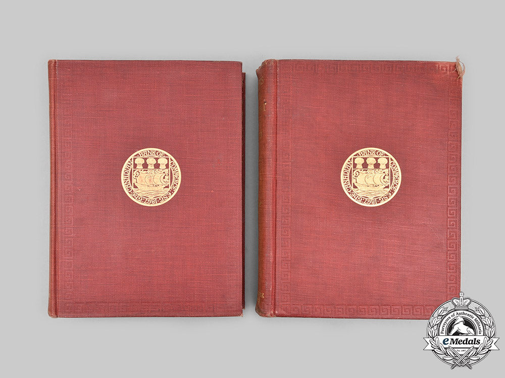 Both volumes together weigh 3 kilograms and feature scalloped edges on the pages, having experienced partial separation of the cover from the body of the book, with light soiling on some pages, however, the majority of the pages remain pristine and unaffected. Fine.