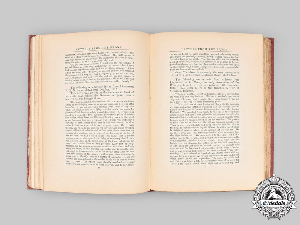 Volume I: begins with the statement: "The "Letters from the Front" pamphlets edited by CHARLES LYONS FOSTER have been supplemented, and incorporated in this volume by WILLIAM SMITH DUTHIE", followed by a three page Introduction by General Manager Sir John Aird (November 15, 1855 - November 30, 1938, a Canadian banker who joined the Canadian Bank of Commerce in 1878, becoming president of that organization in 1924 and holding the position until 1929) and dated March 31, 1920, and a four page Preface by the Editor, C.L. Foster and dated March 31, 1920 at Toronto. This is succeeded by a list entitled "The Enlistments from the Bank", plus 99 black and white plates featuring the portrait photographs of 392 of the bank's staff who gave their lives in the war, and of those who were decorated or mentioned in despatches, the gallery followed by a note of regret that they were unable to obtain photographs of five members of their staff who had received decorations. The bulk of the book is featured in the section entitled "Letters from the Front", with dated letters written by members of the bank's staff who were overseas during the war, documenting daily life, each letter with an editor's notation and update. It concludes with a four page Index to Letter-writers and References. It contains 510 pages, printed in black ink on a thick newsprint stock, plus 50 pages incorporating the plates printed in black ink, on a white paper stock, measuring 185 mm (w) x 250 (h) x 45 mm (d);