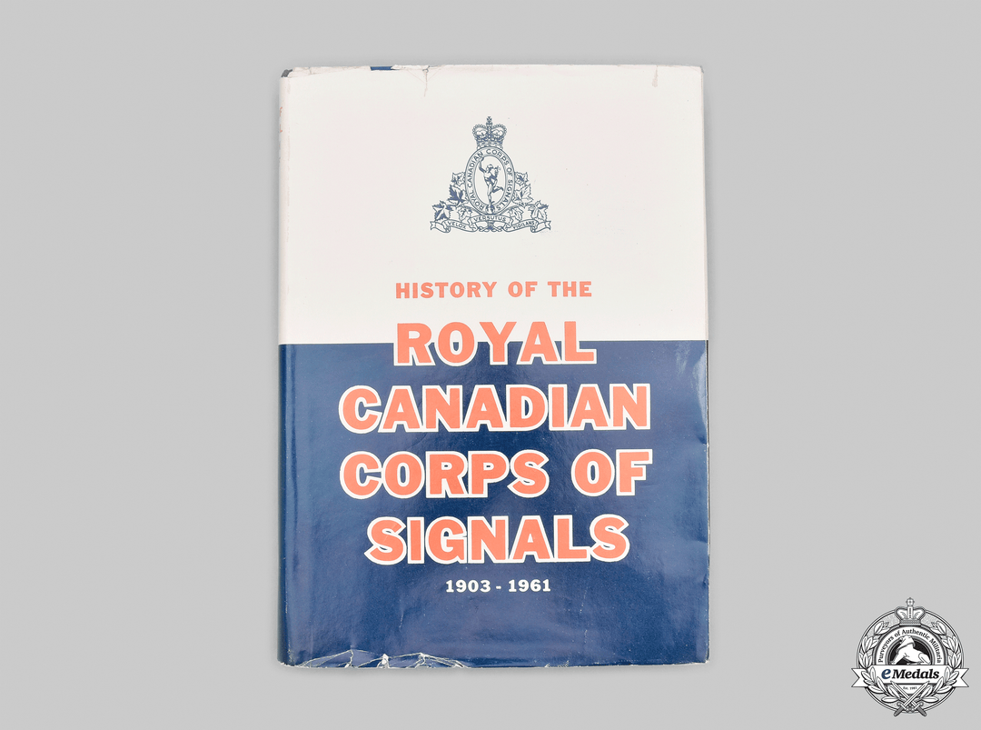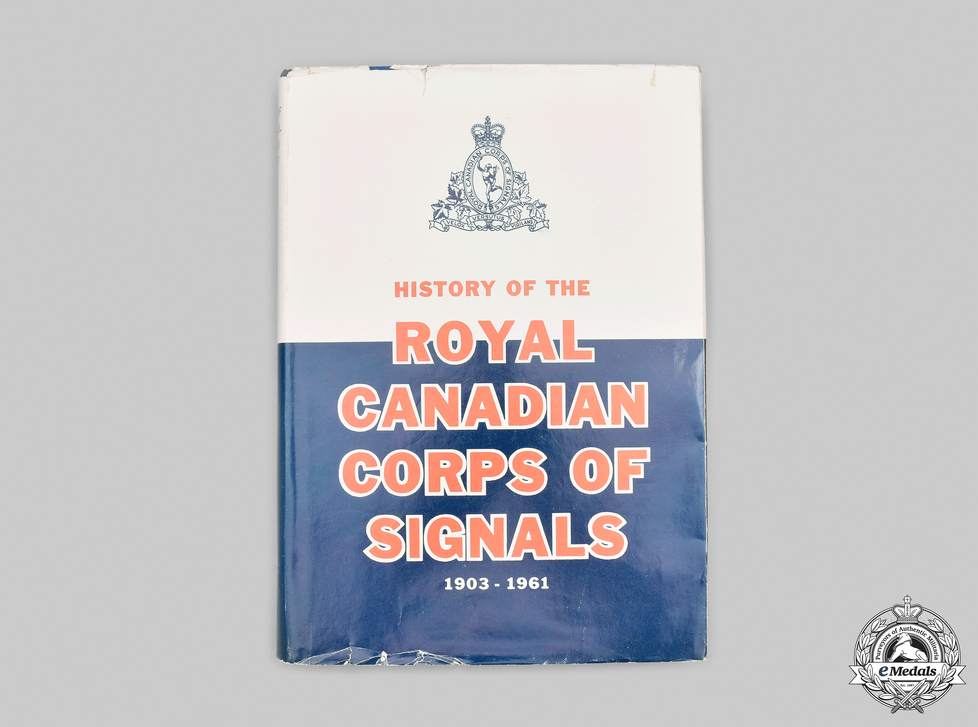 Hardcover, cobalt blue cloth cover, the insignia on the front cover and the text on the spine in a gold-coloured ink, entitled "History of the Royal Canadian Corps of Signals 1903-1961", written by the Officers of the Corps and edited by John S. Muir, M.A., Ph.D., published by authority of the Corps Committee, Royal Canadian Corps of Signals, at Ottawa, Ontario in 1962. It is dedicated "To Those of The Royal Canadian Corps of Signals Who Gave Their Lives For Their Country".
