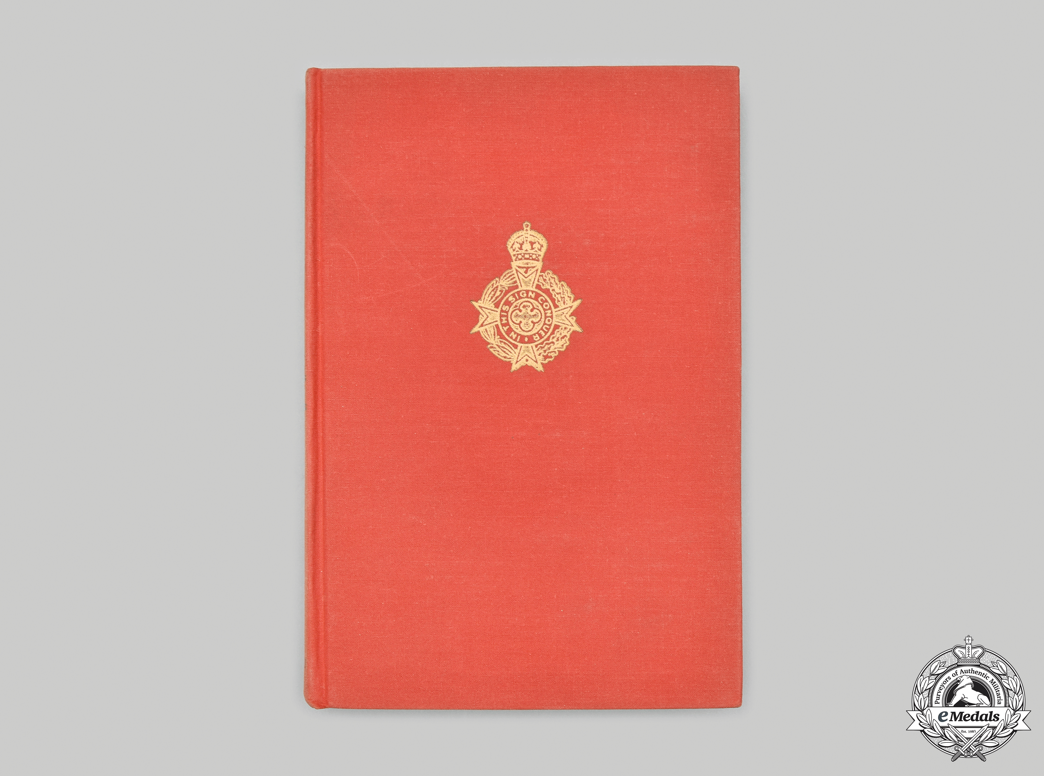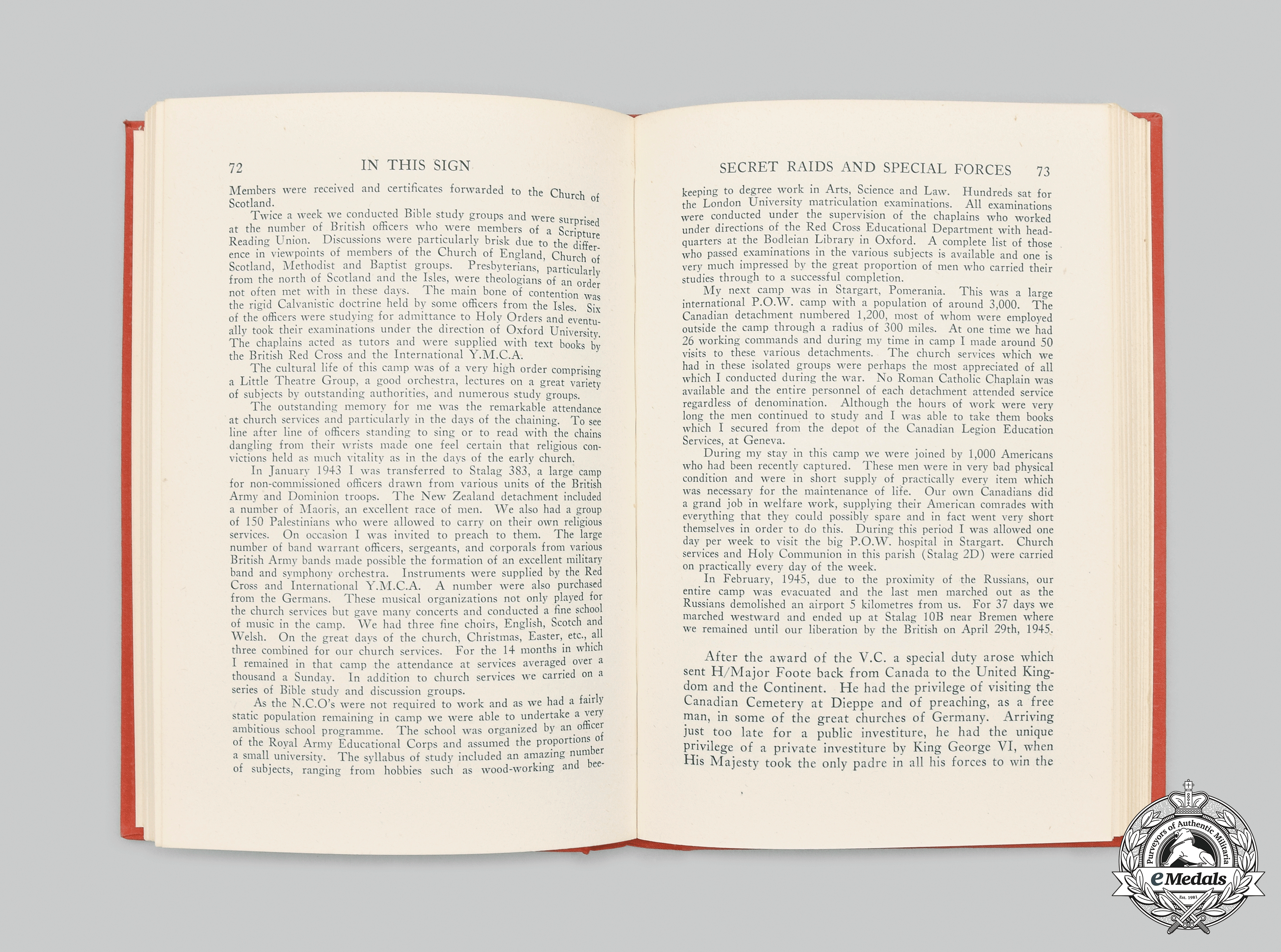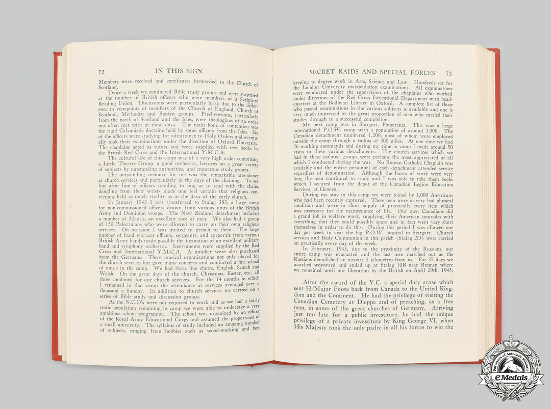 Hardcover, red cloth cover, the insignia on the front cover and the text and insignia on the spine in a gold-coloured ink, entitled "In This Sign - The Canadian Chaplains Service", by Honourary Major Walter T. Steven, M.A., B.Th., copyrighted in Canada in 1948 by The Ryerson Press of Toronto, Ontario, published in December 1948, printed and bound by The Ryerson Press. The Canadian Chaplains Service became the Royal Canadian Army Chaplain Corps after 1948. It includes sixteen black and white photographs, inserted in eight locations, between pages 18-19, 34-35, 50-51, 66-67, 82-83, 98-99, 114-115, 130-131. The book begins with a dedication: "In proud gratitude for our nine comrades for whom the trumpets have sounded on the other side.", followed by a Preface by the author, Honourary Major Walter T. Steven, M.A., B.Th., a Foreword by Chief of the General Staff, Lieutenant-General Charles Foulkes, C.B., C.B.E., D.S.O., a Table of Contents and a List of Illustrations. It is signed in black ink to "Lt-Col H.M. Jackson / with (indecipherable) / of the Royal Canadian Army Chaplains Corps (P) / Cyril G.F. Stoue PC (P)" on the inside front cover endpaper. The book contains eight chapters: I - Back of the Beginnings; II - Chaplains in World War II; III - The Fight is on Again; IV - Wait! Wait! Wait!; V - Secret Raids and Special Forces; VI - Twenty Months in the Mediterranean; VII - D-Day and Onward; VIII - Meanwhile in Canada. The book contains 196 pages, printed in black ink, the text on an off-white paper stock, the sixteen pages of black and white photographs on a semi-gloss white paper stock, measuring 145 mm (w) x 220 mm (h) x 25.5 mm (d). Light discolouration evident on the top of the pages, the contents of the book remaining pristine. Near extremely fine.