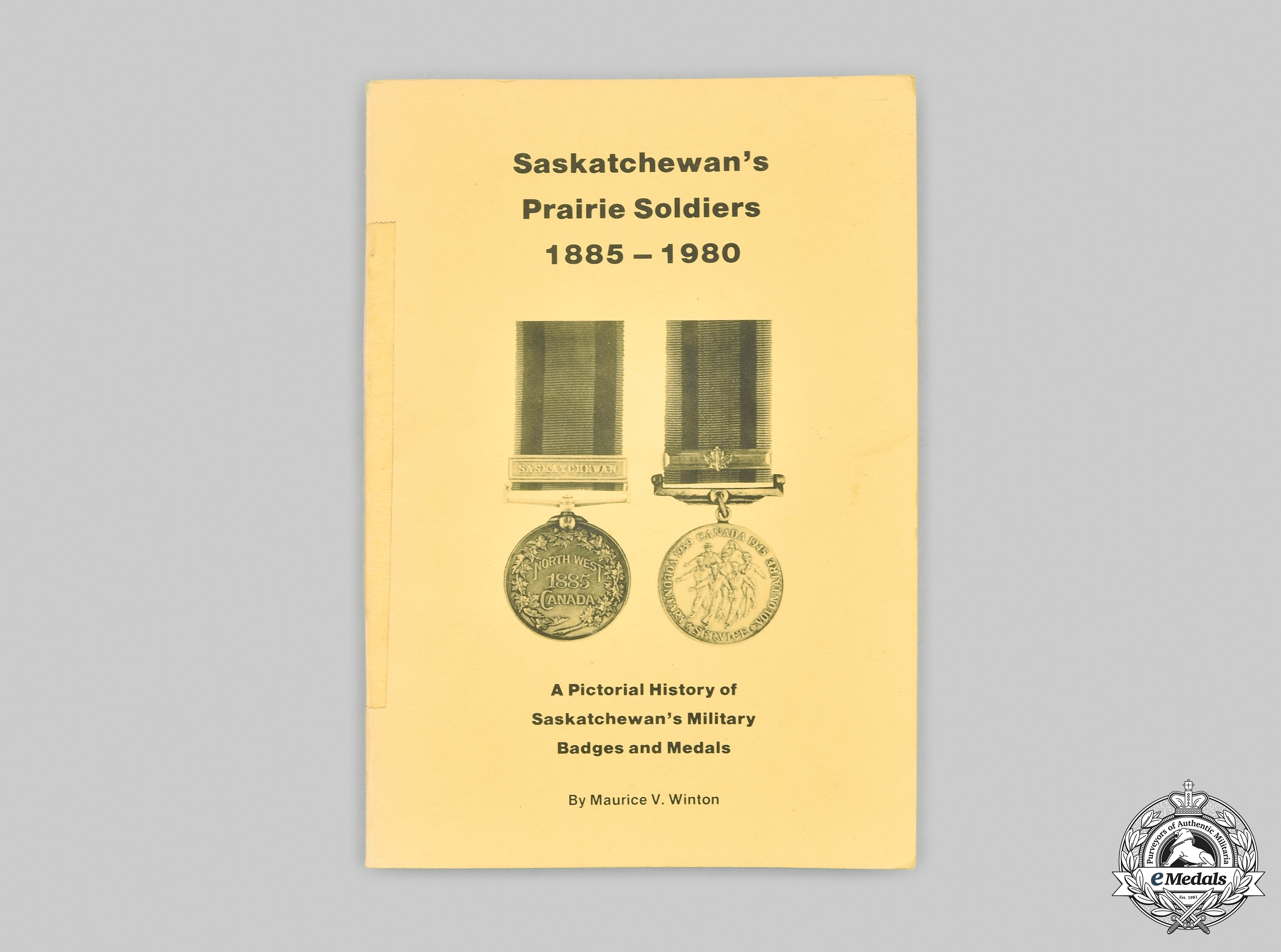 Softcover, entitled "Saskatchewan's Prairie Soldiers 1885-1980", by Maurice V. Winton, published in 1980, ISBN 0-9690559-0-0. It begins with an Acknowledgements, followed by a Table of Contents and a Foreword by the author. The book is divided into three basic Sections: the Riel Period 1885 (dealing with French's Scouts, Yorktown Militia, Boultons Scouts, Transport Service, Battleford Infantry, Denis's Surveyors, Corps of Guides, Moosemountain Scouts, Prince Albert Volunteers, Colonel Steele's Scouts, Alberta Mounted Rifles, Corps of Guides, Northwest Mounted Police); 1905-1914-1918 (most of which covers the regiments from the creation of the Province of Saskatchewan in 1905, along with the Canadian Expeditionary Force units involved in the First World War from 1914 to 1918); concluding with the various units from the province who participated in the Second World War. In addition to the detailed text, the book is brimming with photographs of the medals awarded to Saskatchewan-based soldiers over the years, along with the various cap badges, collar badges, shoulder titles and shoulder flashes worn by them, along with assorted war related items and award documents they received, complemented by photographs of soldiers, as singles or in groups, some of which were taken in the field. The book contains 184 pages of text and photographs, printed in black ink, on a white paper stock, the cover on a canary yellow card stock, the former owner's stamp in black ink on the first page, measuring 152 mm (w) x 229 mm (h) x 12 mm (d). It has a taped-over handwritten title tag placed on the spine for bookshelf identification, exhibiting light soiling on the exterior cover, the text of the book remaining unaffected. Better than very fine.