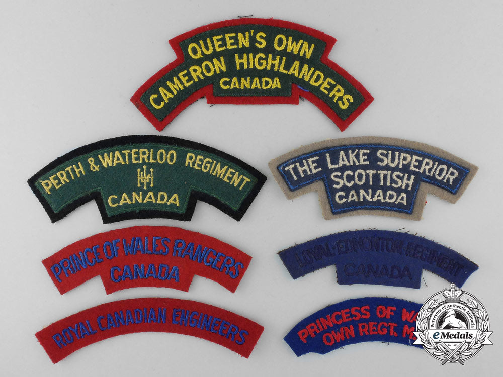 Lake Superior Scottish (white embroidered lettering on steel blue felt, sewn upon a gray felt base, white cotton mesh backer, 45 mm x 127 mm, paper residue on the reverse from previous board mounting); Perth & Waterloo Regiment (yellow embroidered lettering on green felt, sewn upon a black felt base, 48 mm x 141 mm); Prince of Wales Rangers (blue embroidered lettering on red felt, white cotton mesh backer, 35 mm x 122 mm); Princess of Wales' Own Regiment (Machine Gun) (red embroidered lettering on blue felt, black cotton mesh backer, 25 mm x 107 mm); Queen's Own Cameron Highlanders (yellow embroidered lettering on green felt, sewn upon a red felt base, black cotton mesh backer, 49 m x 142 mm); Royal Canadian Engineers (blue embroidered lettering on red felt, white cotton mesh backer, 20 mm x 130 mm); and Royal Edmonton Regiment (navy blue embroidered lettering on a dark blue felt, khaki cotton mesh backer, 31 mm x 113 mm). Ranging from better than very fine to extremely fine.