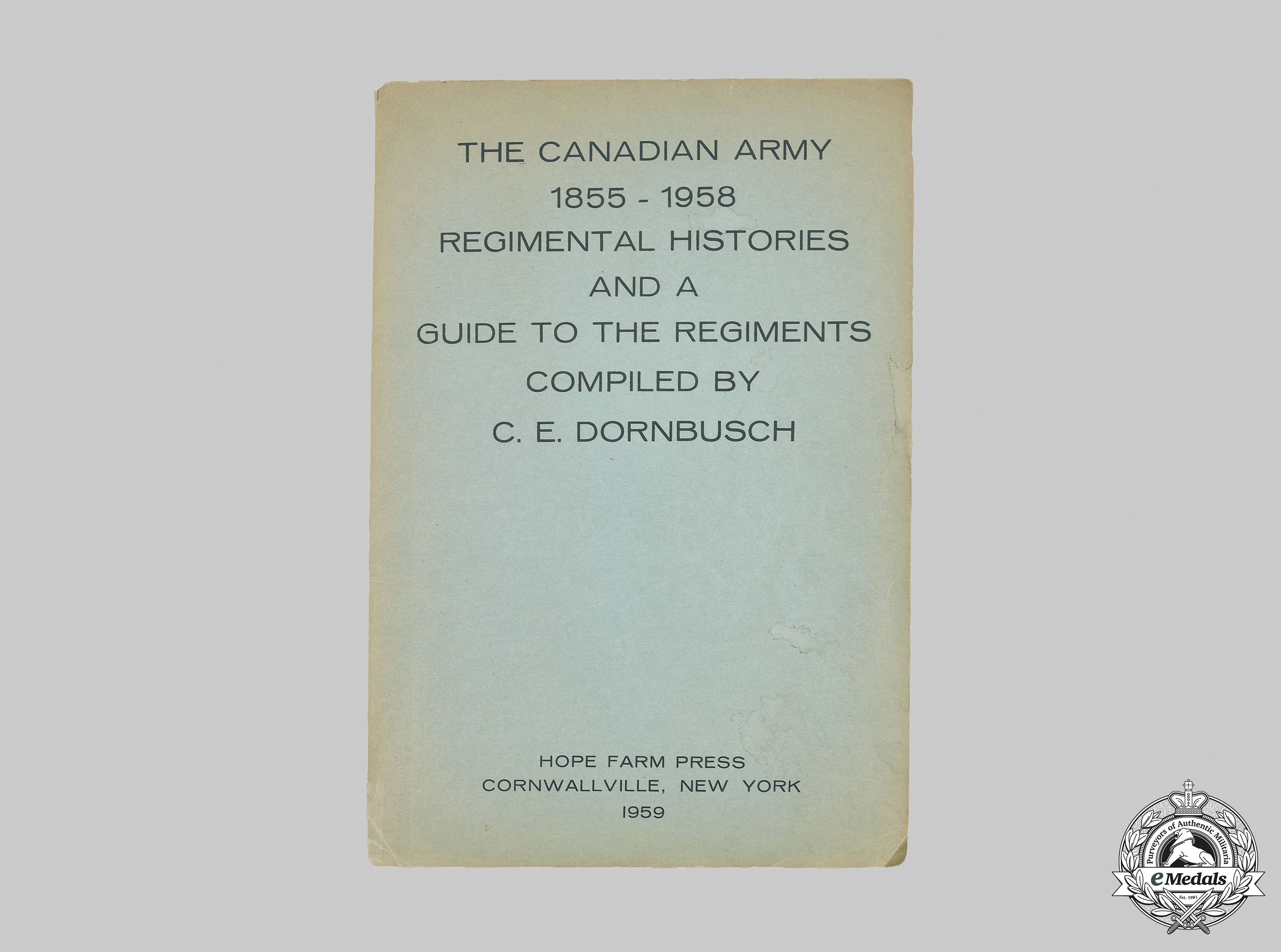 Softcover, entitled "The Canadian Army 1855-1958: Regimental Histories and a Guide to the Regiments", compiled by Charles Emil Dornbusch, published by Hope Farm Press of Cornwallville, New York in 1959. A brief description of the book's contents is stated in the Preface: "The modern Canadian Army dates from 1855, when twenty-two companies were formed under the first Volunteer Act passed by the Parliament of Canada. With this year as the starting point, the Guide outlines the histories of the Canadian Regiments in the dates of organization, change of designation, amalgamation, disbanding and conversion. The authority for the Guide is the file of Militia Orders, later Army Orders. The arrangement of the Guide is alphabetical by the name of the Regiment. Better than very fine.